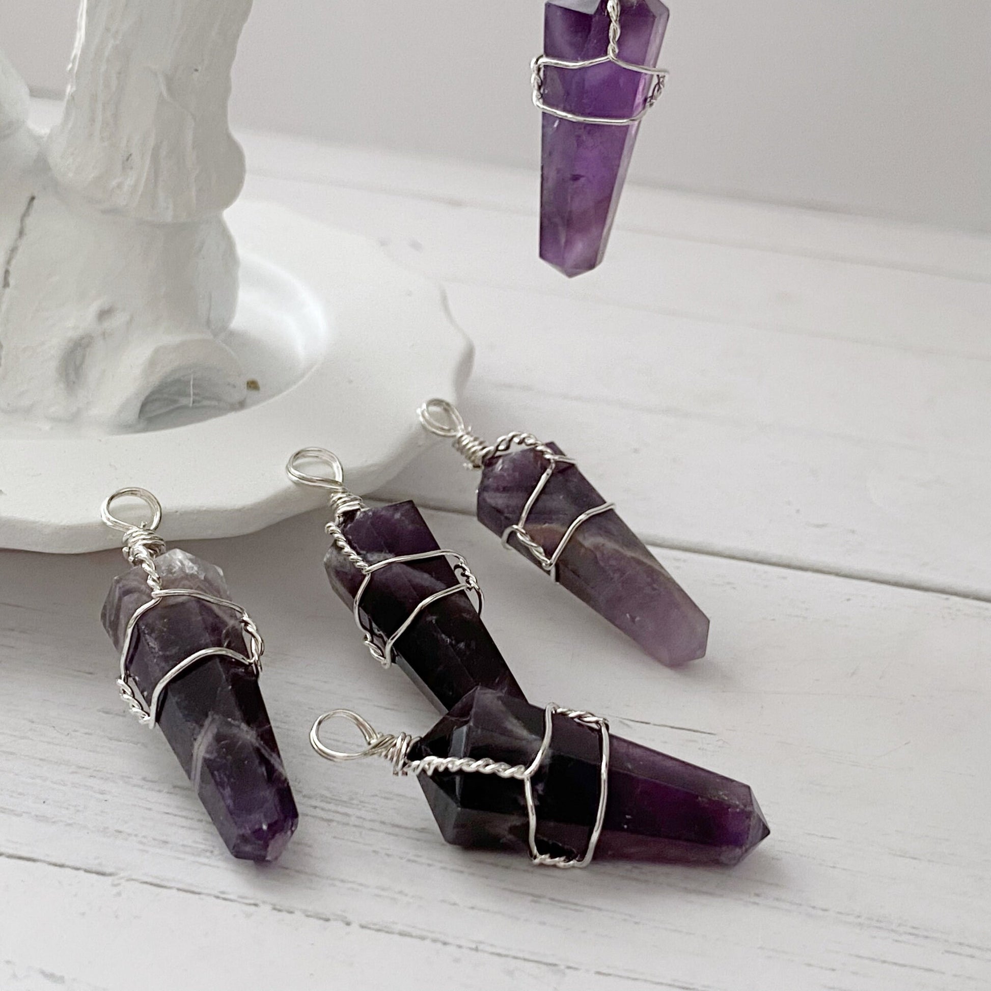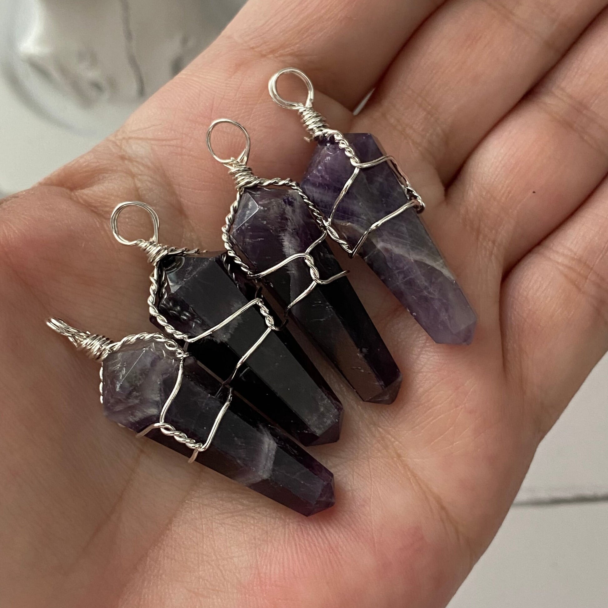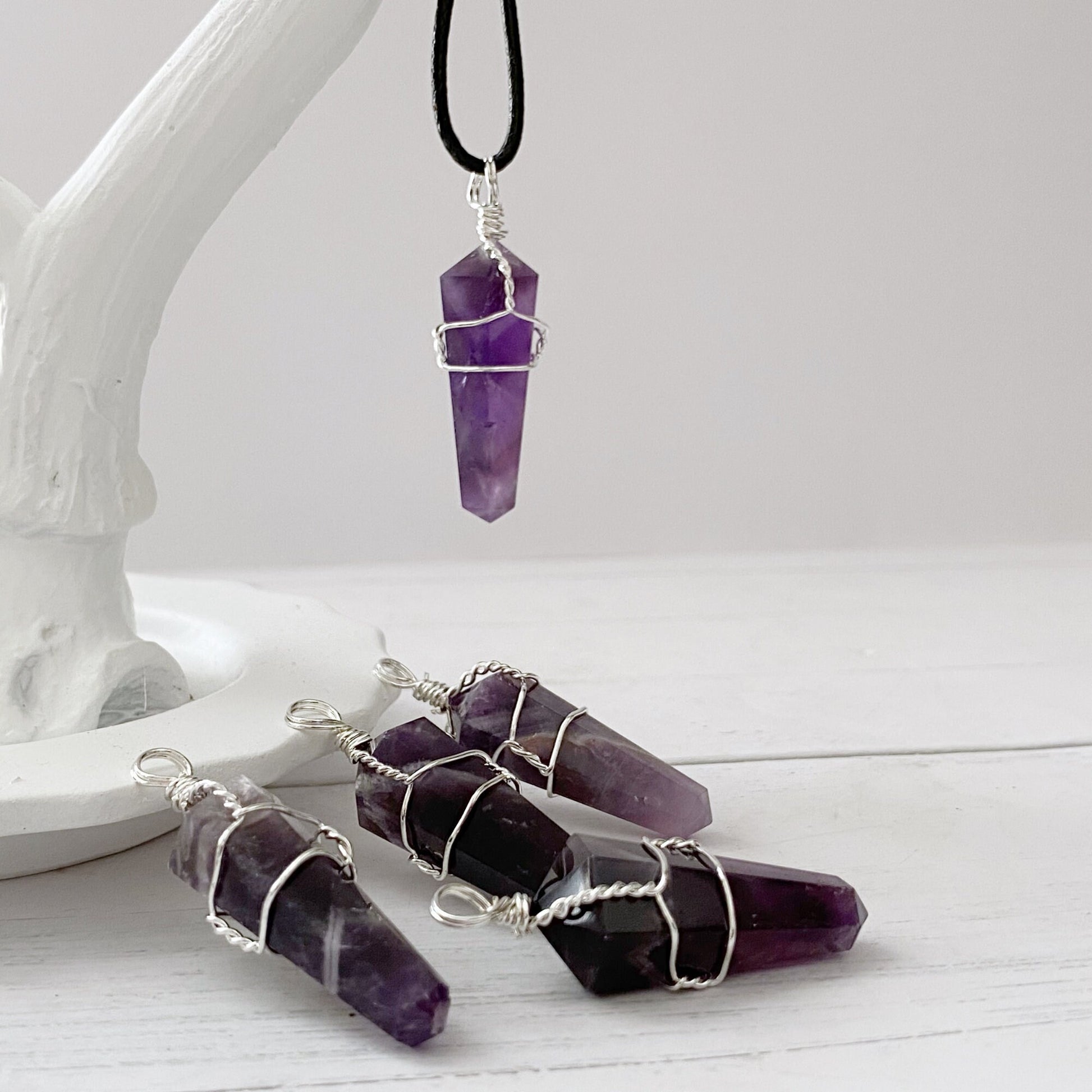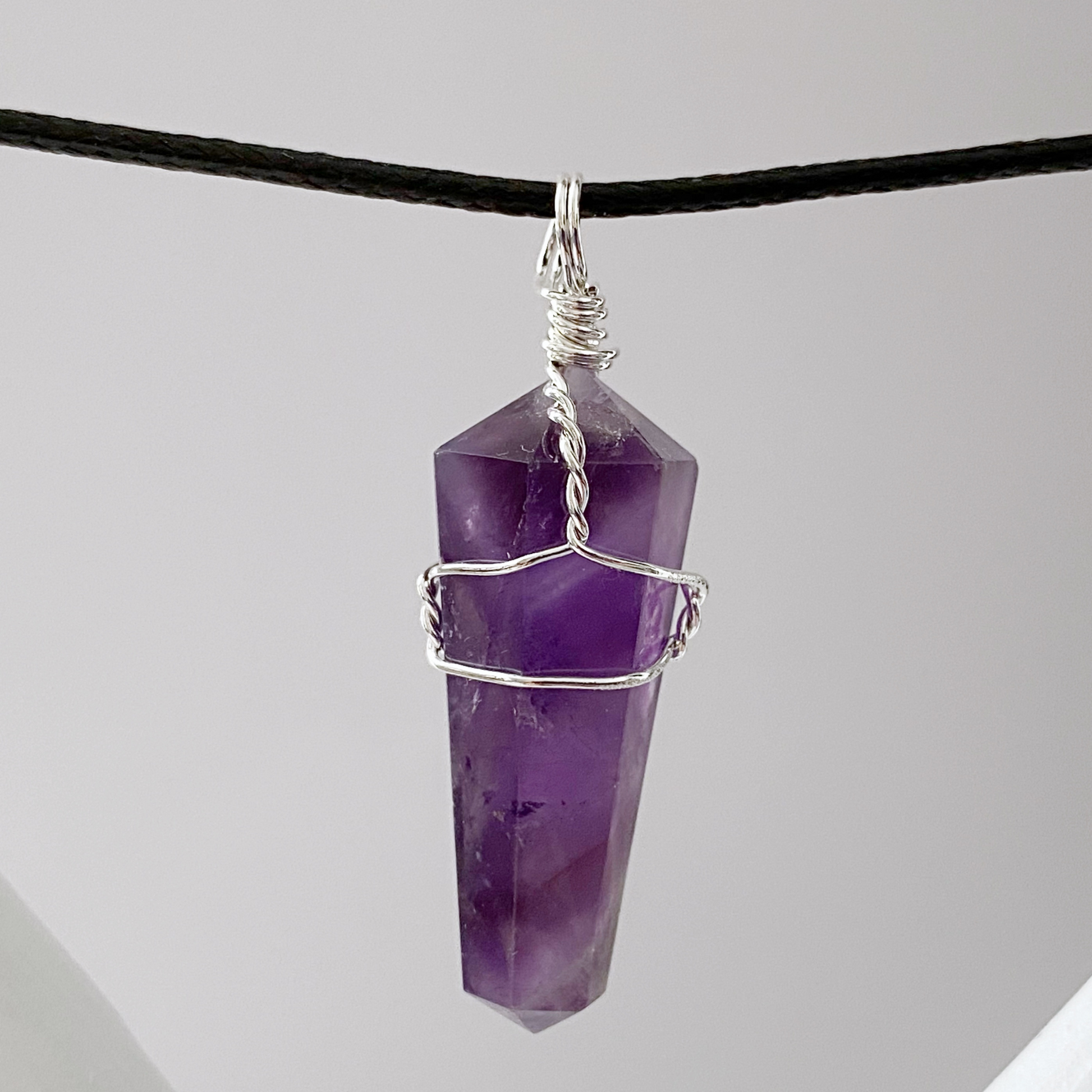You will receive 1 fully polished double terminated Amethyst crystal "bullet" pendant wire wrapped in silver approximately 1.5" inches in height. Purchase the pendant alone or with a black cotton waxed cord 16" necklace.