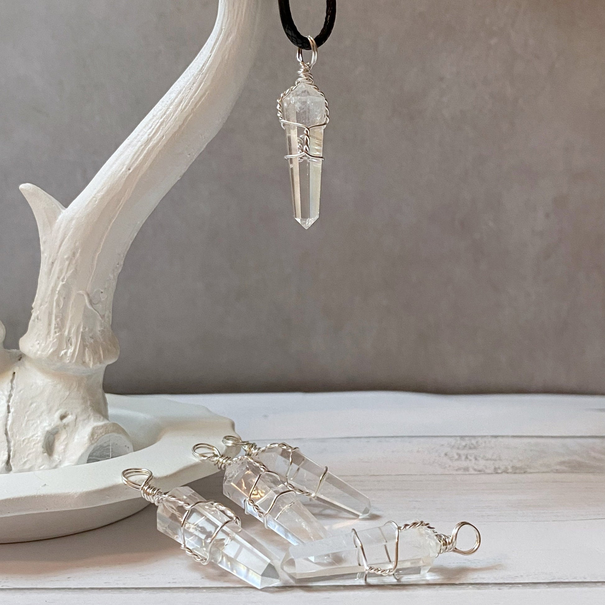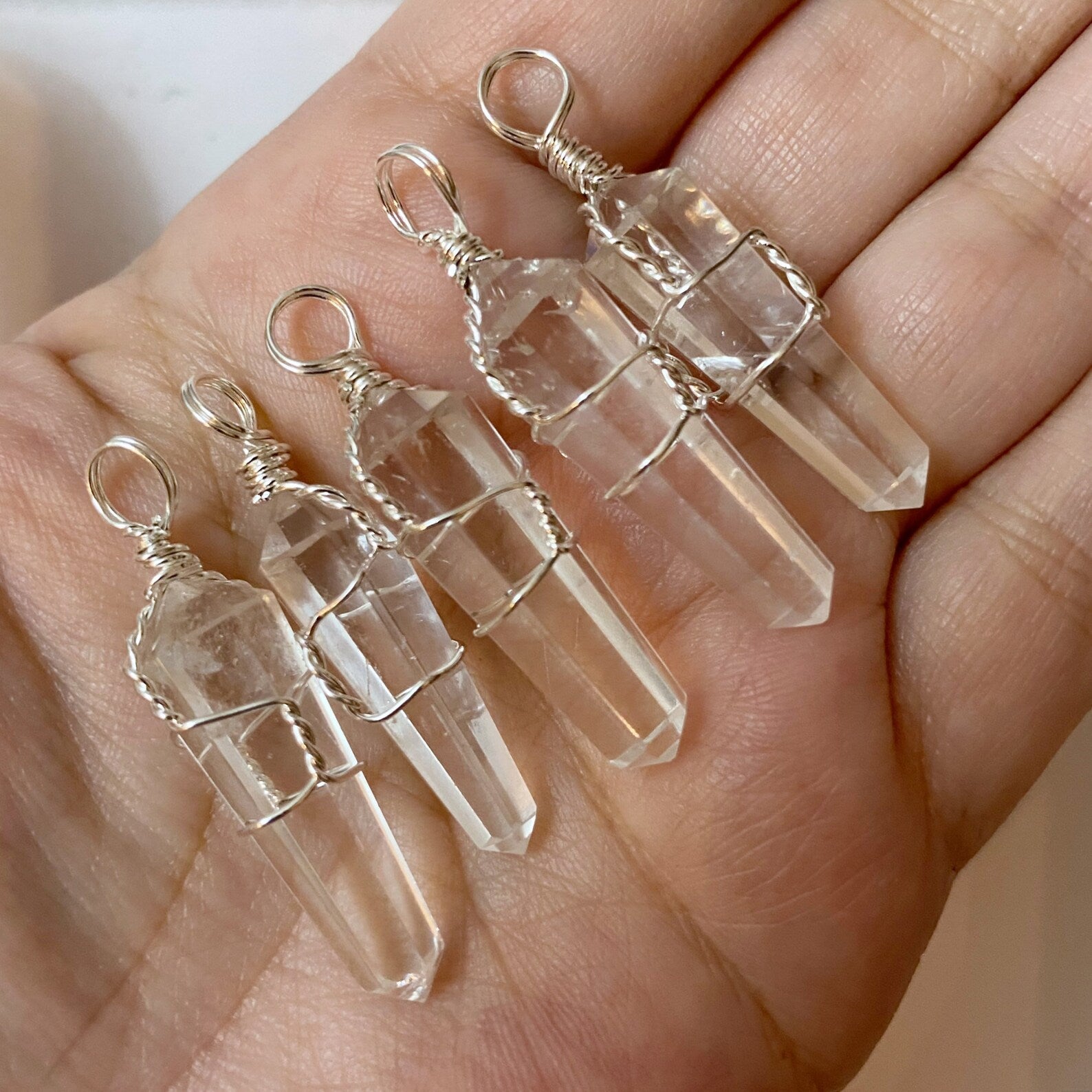 You will receive 1 fully polished double terminated Clear Quartz crystal pendant wire wrapped in silver approximately 1.5" inches in height. Purchase the pendant alone or with a black cotton waxed cord 16" necklace.