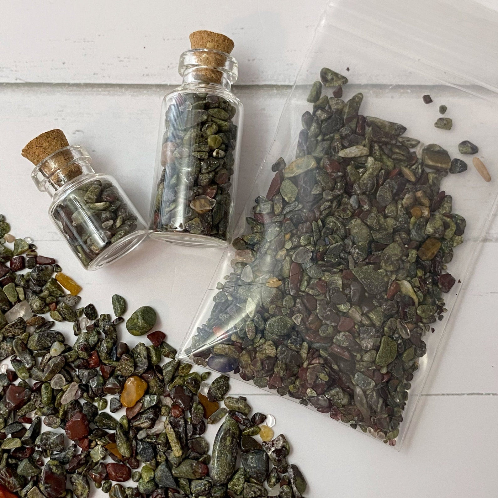 Dragon Stone (Dragon Blood Jasper) Crystal Chips are tumbled and polished tiny stones. These mini stones are perfect for various creative and mystical endeavors. Whether you're into candle making, adding to your roller ball oils, crafting, or creating resin jewelry, these chips add a touch of natural energy to your projects. They're also ideal for spell jars, mojo bags, witch balls, orgone devices, and as sacred additions to your altar jars.