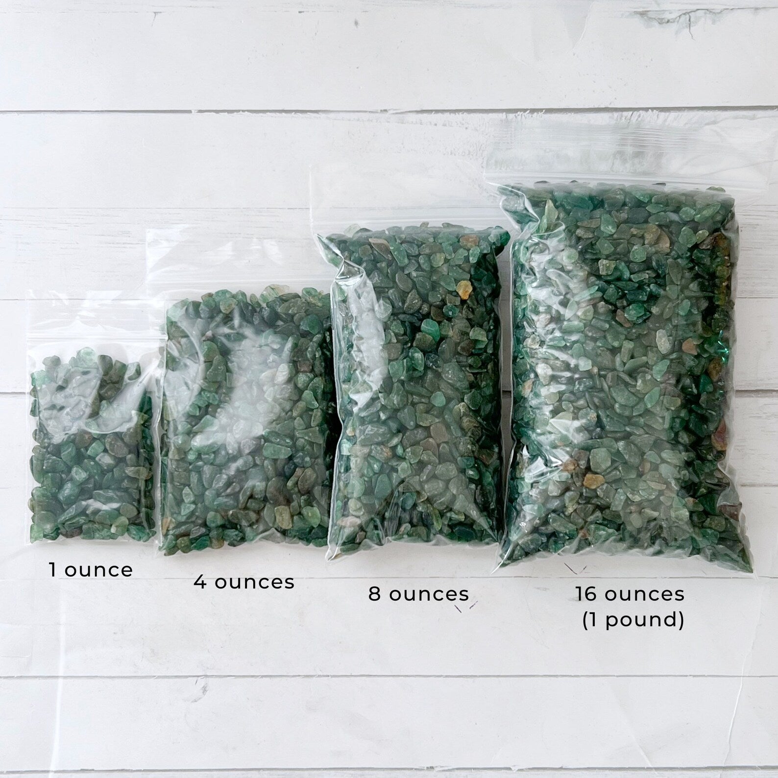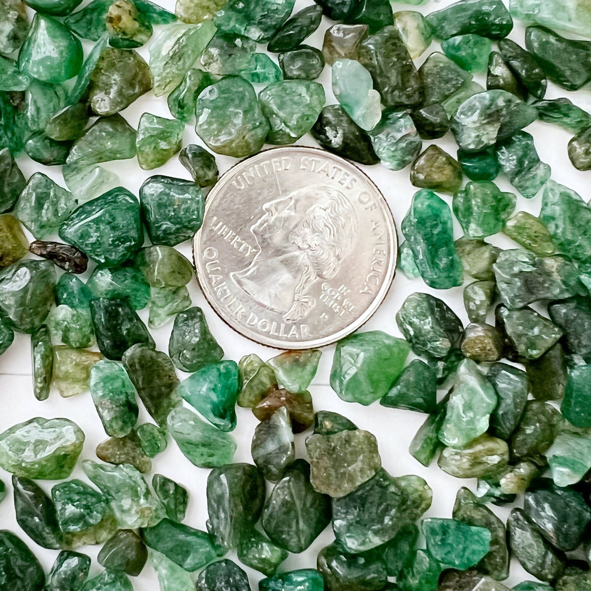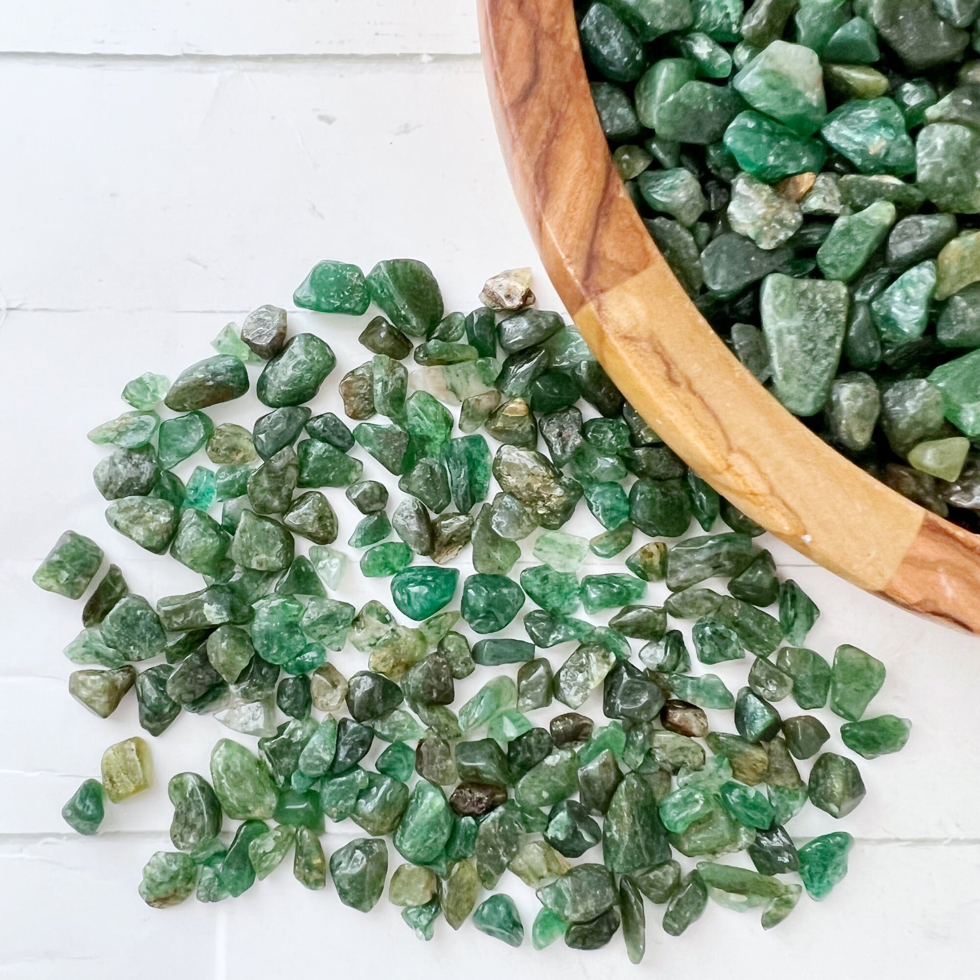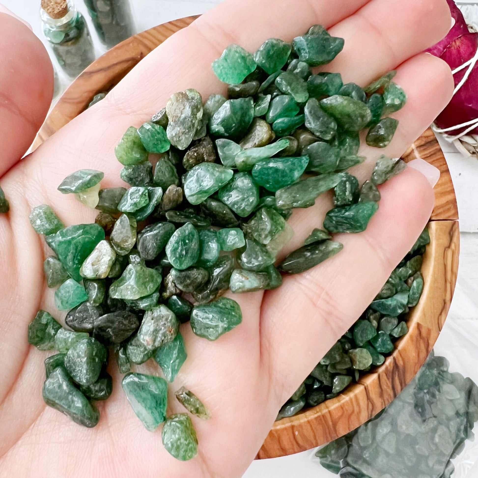 Emerald Crystal Chips, which are tumbled and polished tiny stones. These mini stones are perfect for various creative and mystical endeavors. Whether you're into candle making, adding to your roller ball oils, crafting, or creating resin jewelry, these chips add a touch of natural energy to your projects. They're also ideal for spell jars, mojo bags, witch balls, orgone devices, and as sacred additions to your altar jars.