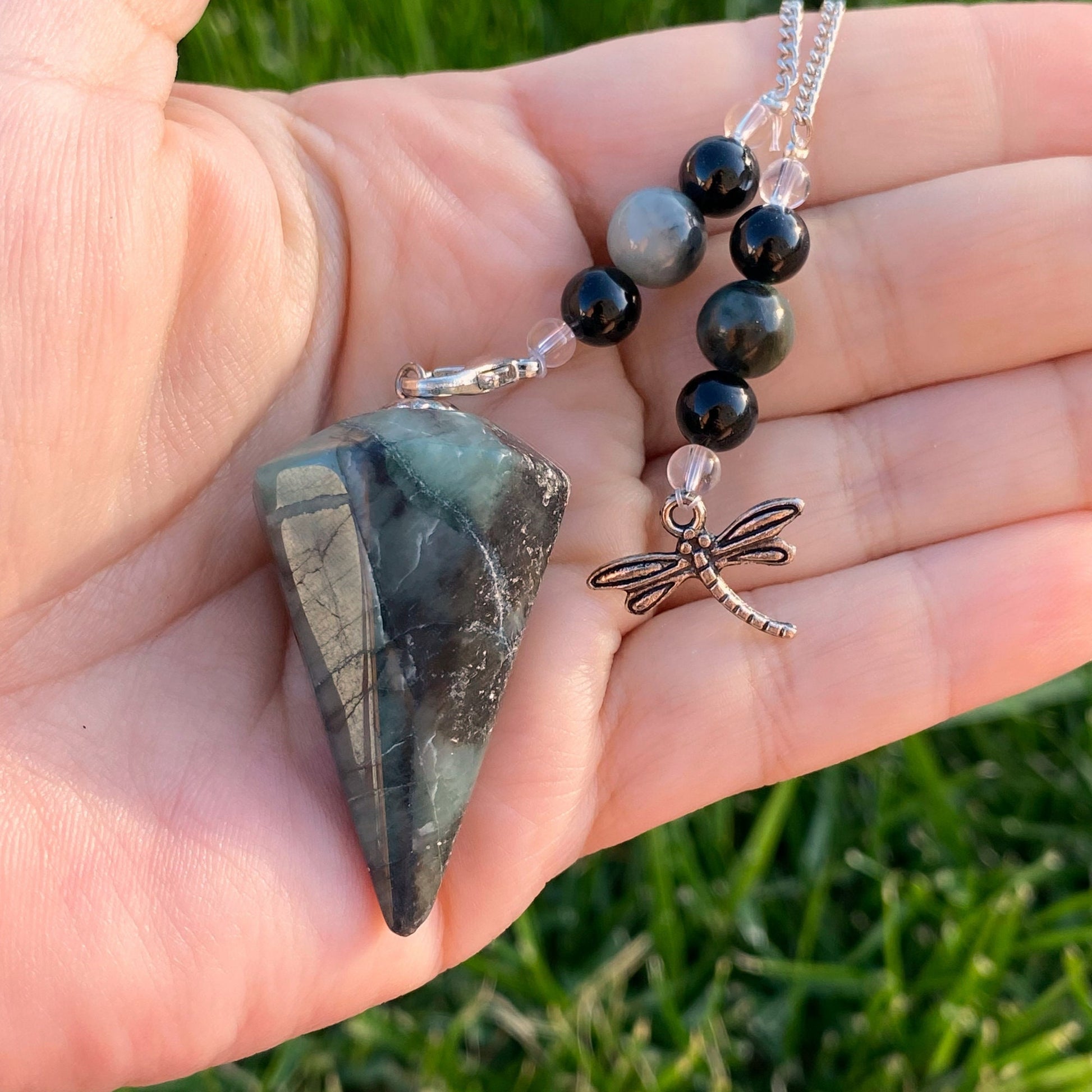 You will receive 1 (one) Hexagonal Emerald Crystal Pendulum with silver dragonfly charm. This beautiful 6 sided pendulum is made from emerald. The attached chain beadwork made with emerald, black onyx, and clear quartz crystal and a charm at the end to ensure slip free handling.