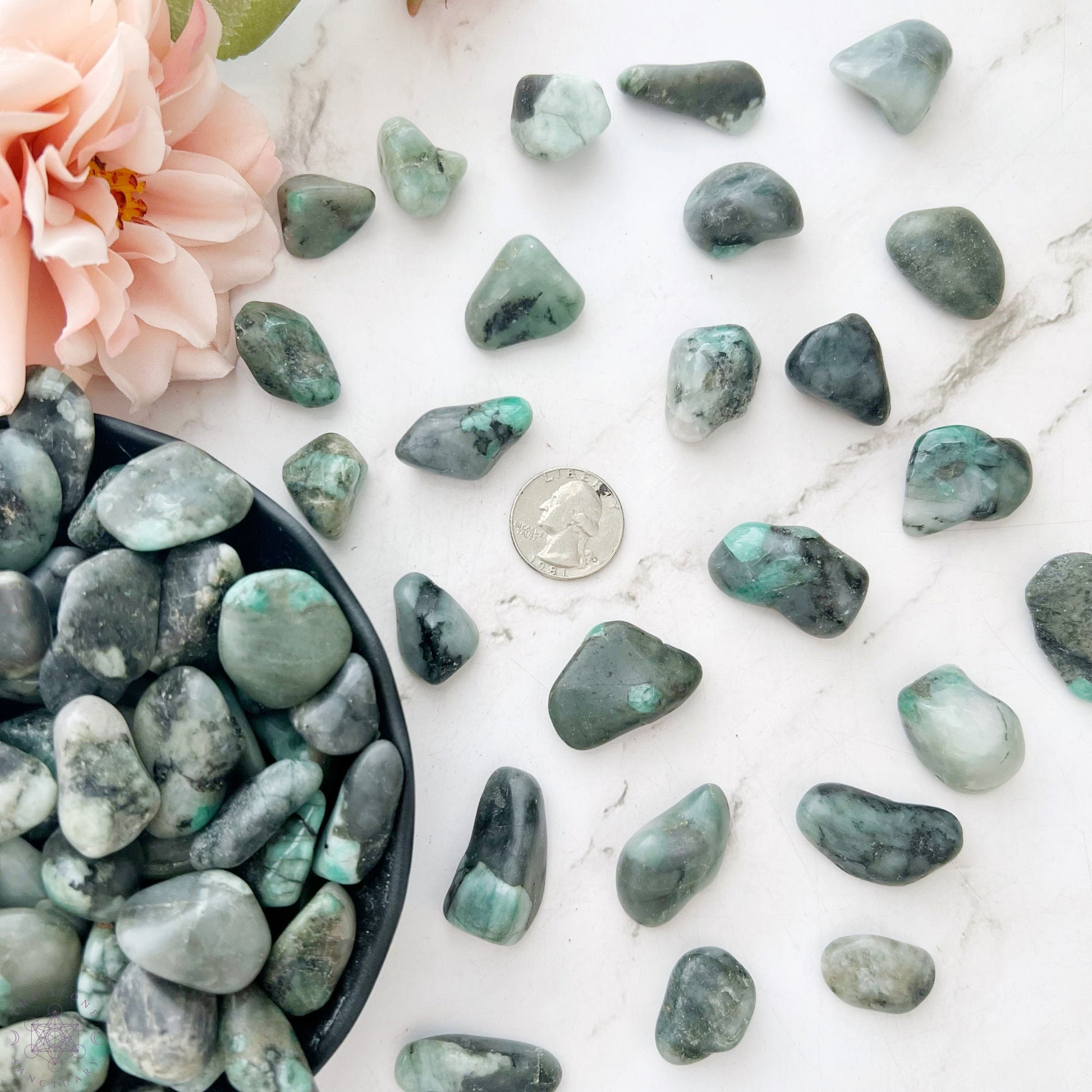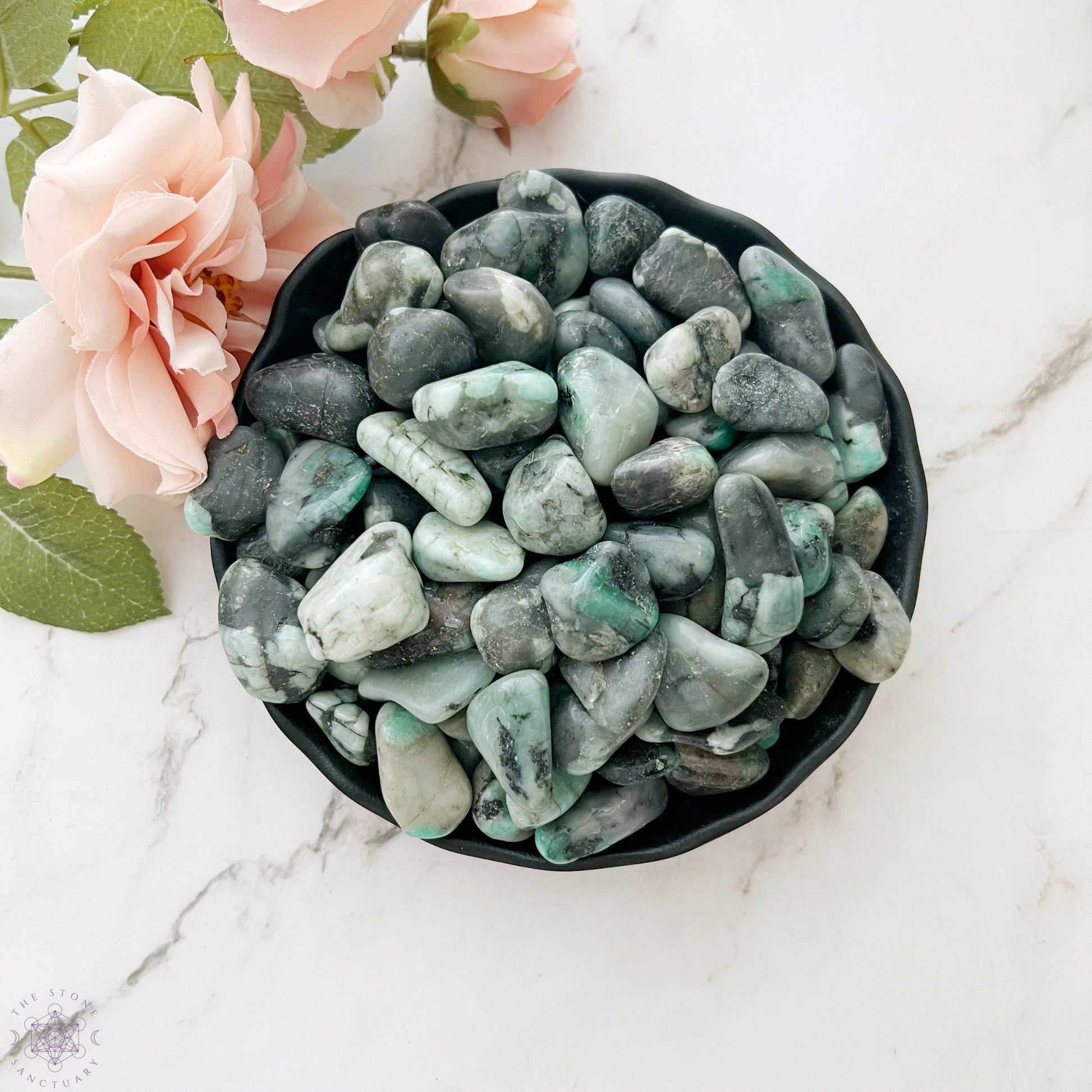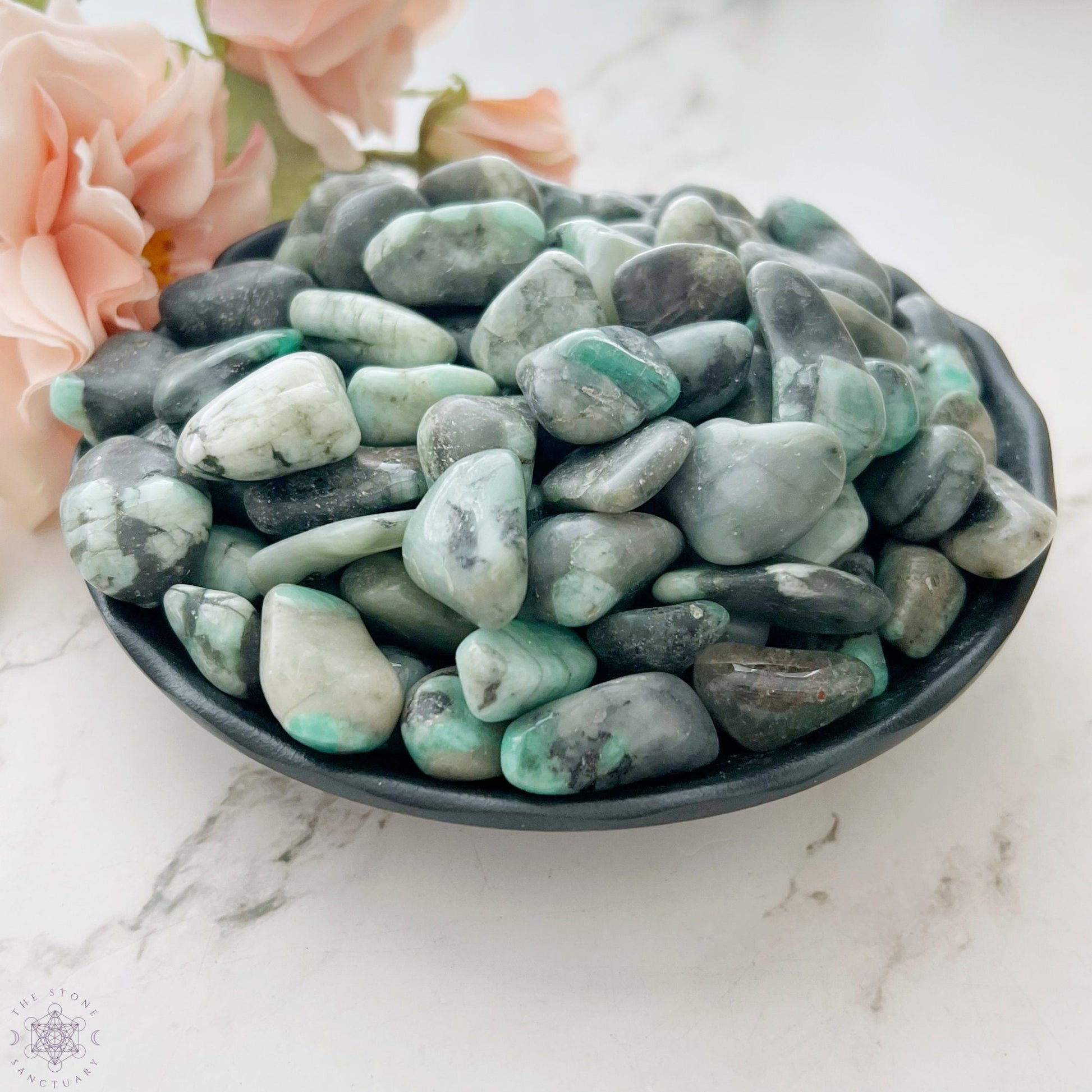 Introducing our exquisite Emerald Tumbled Stones, handpicked from the depths of Mother Earth to bring you the harmonious energy of this captivating gem. Each emerald stone is available in your preferred size: Small (approximately 0.5") or Medium (ranging from 0.5" to 1"). Whether you choose a small or medium size, each emerald crystal is unique in its natural beauty, showcasing shades of green, grey, and black that have captivated humanity for centuries.