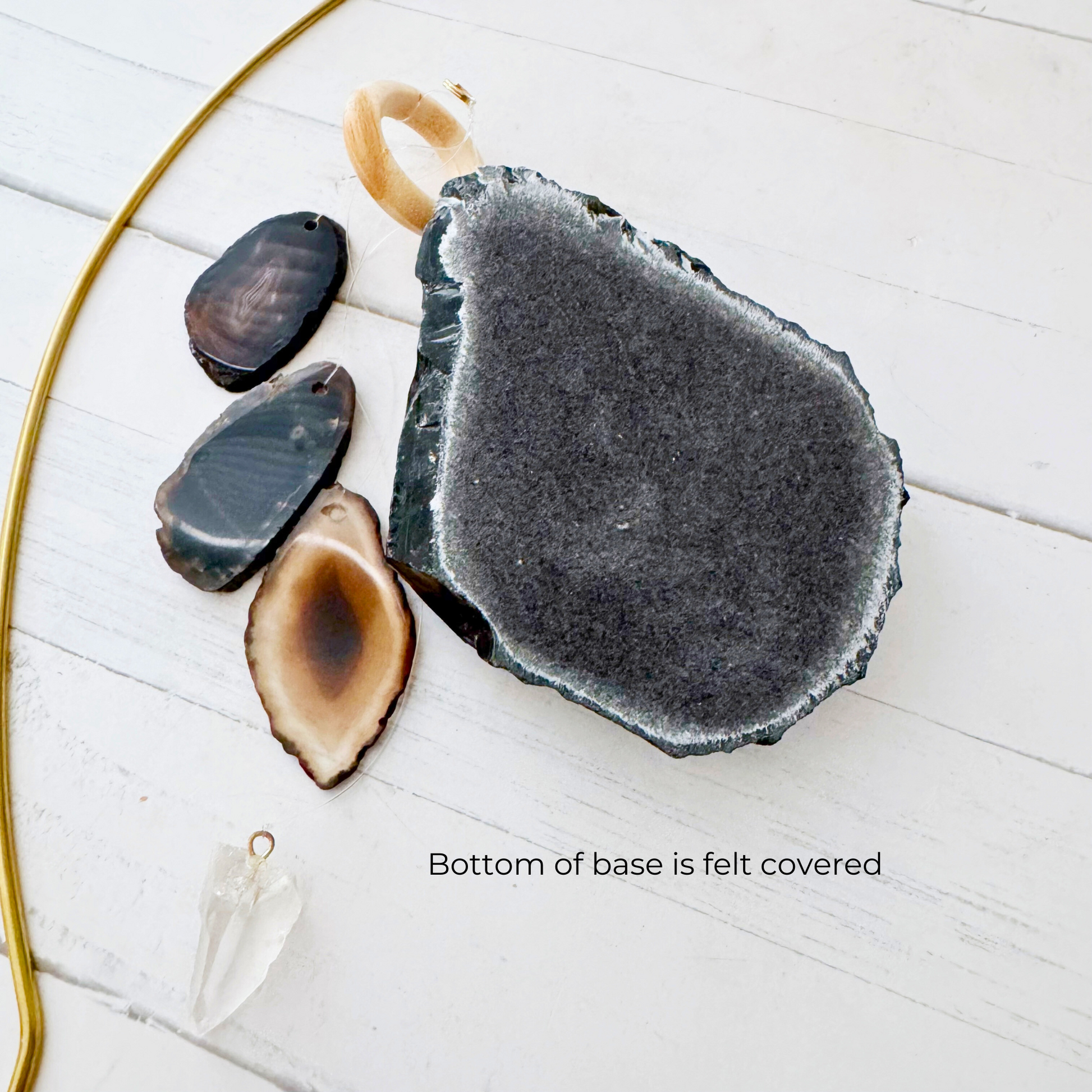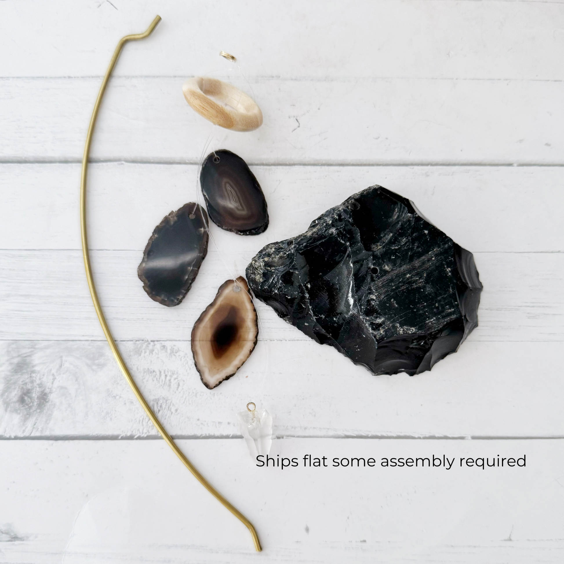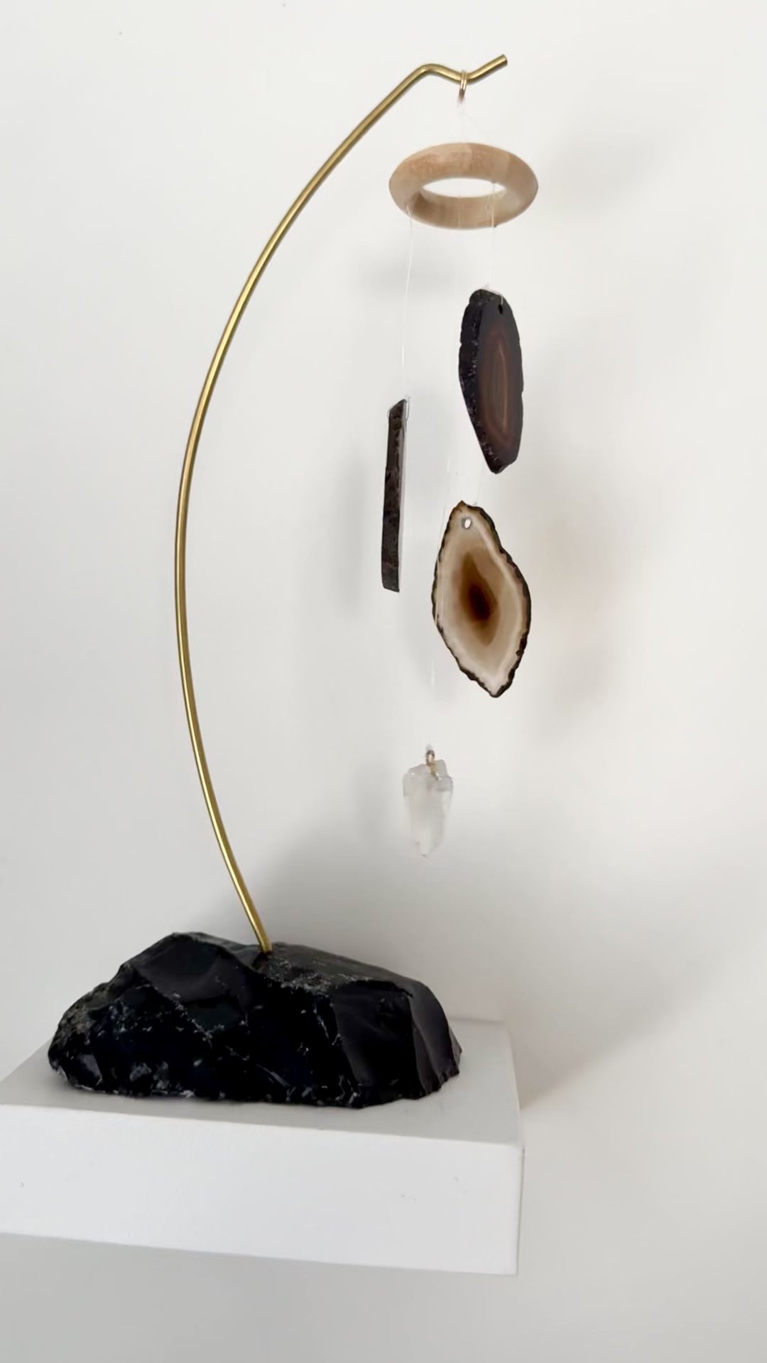 Protect your space and elevate its energy with this stunning handcrafted protection chime. Designed to ward off negative energy and inspire a sense of balance, it features a striking black obsidian base, three polished black agate slices, and a clear quartz point to amplify its intention. Each piece is a unique blend of raw and polished elements, making it a perfect addition to your home, office, or sacred space.