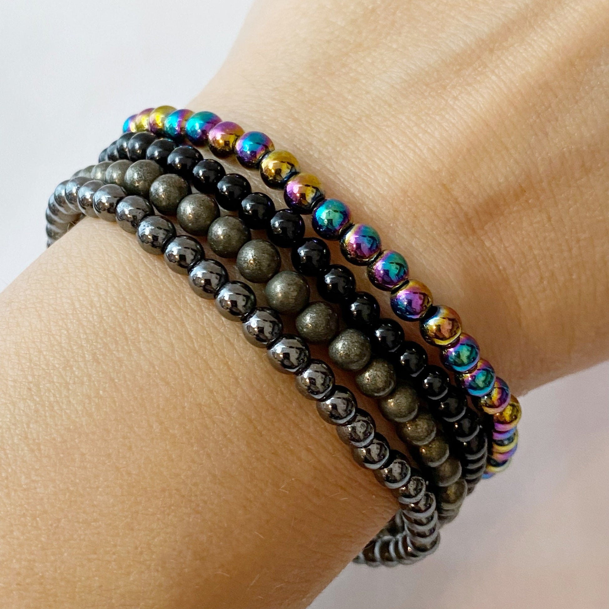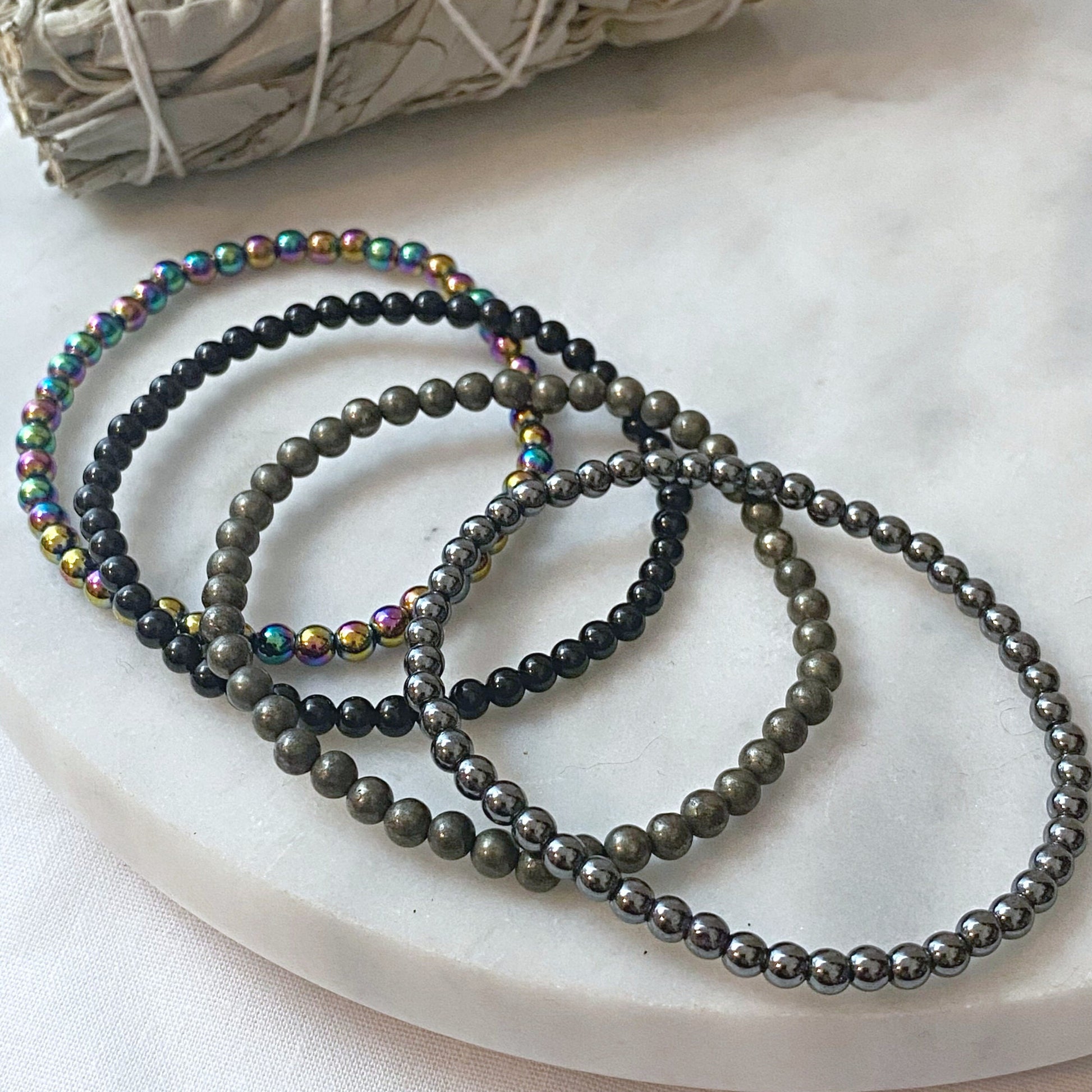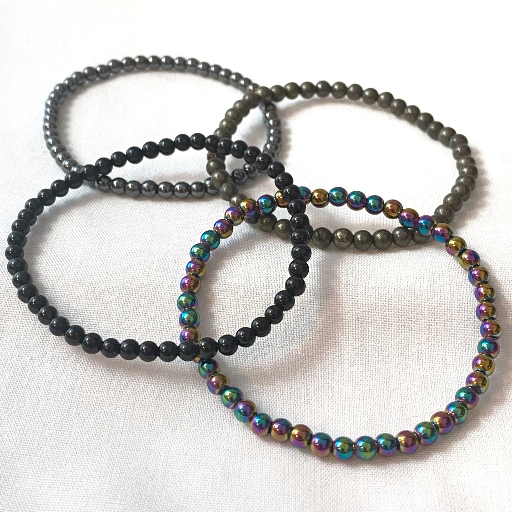 Includes one (1) each of the following: Rainbow Hematite, Black Tourmaline, Pyrite, and Hematite 4mm bead energy bracelets infused with Usui Reiki energy, love, and light. These fit-size S-M wrists.