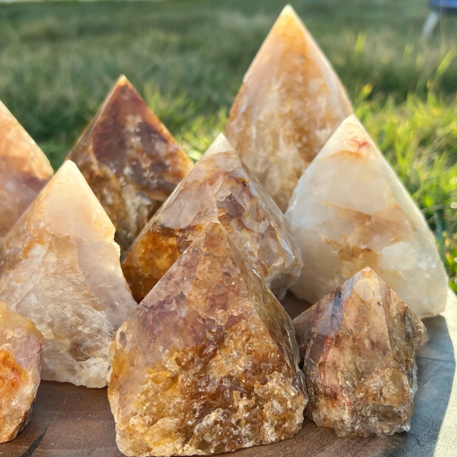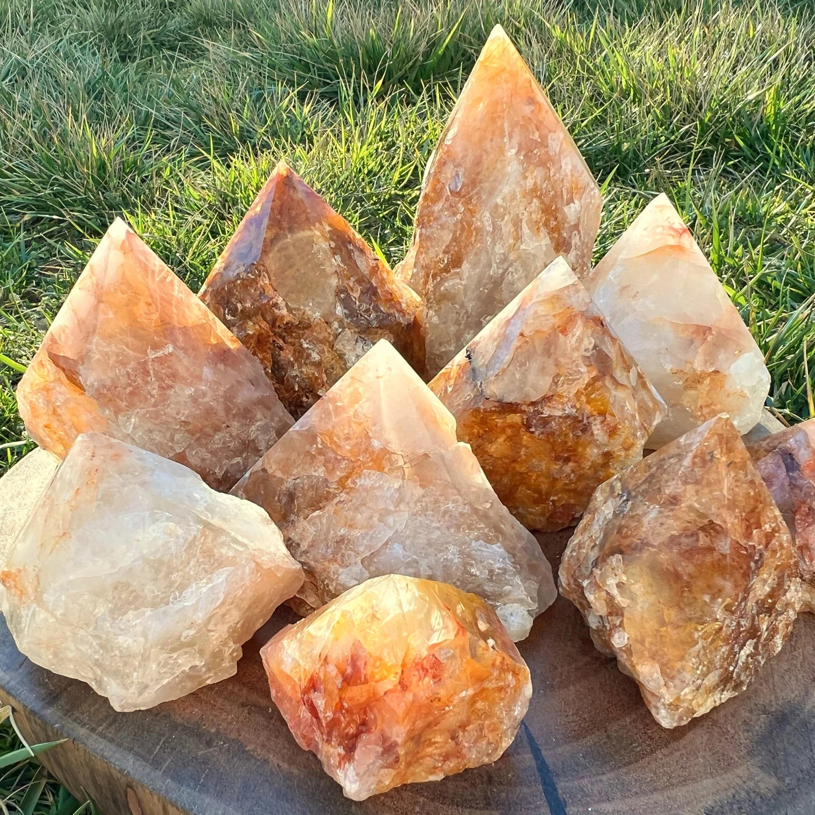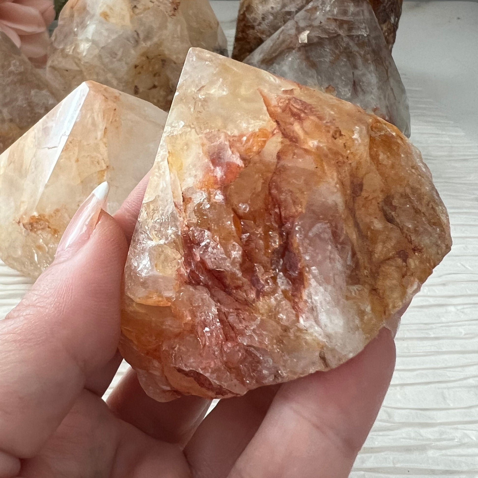 You will receive 1 golden healer quartz top polished point that measures approximately 2-4" in height and stands upright. The sides are rough and the base is cut so these stand upright. These are stunning golden healer quartz points (especially in the sunlight!) with a natural look on the sides finished with a polished tip. These vary in size, and various shapes, typically, the heavier the stone, the taller in height it will be.