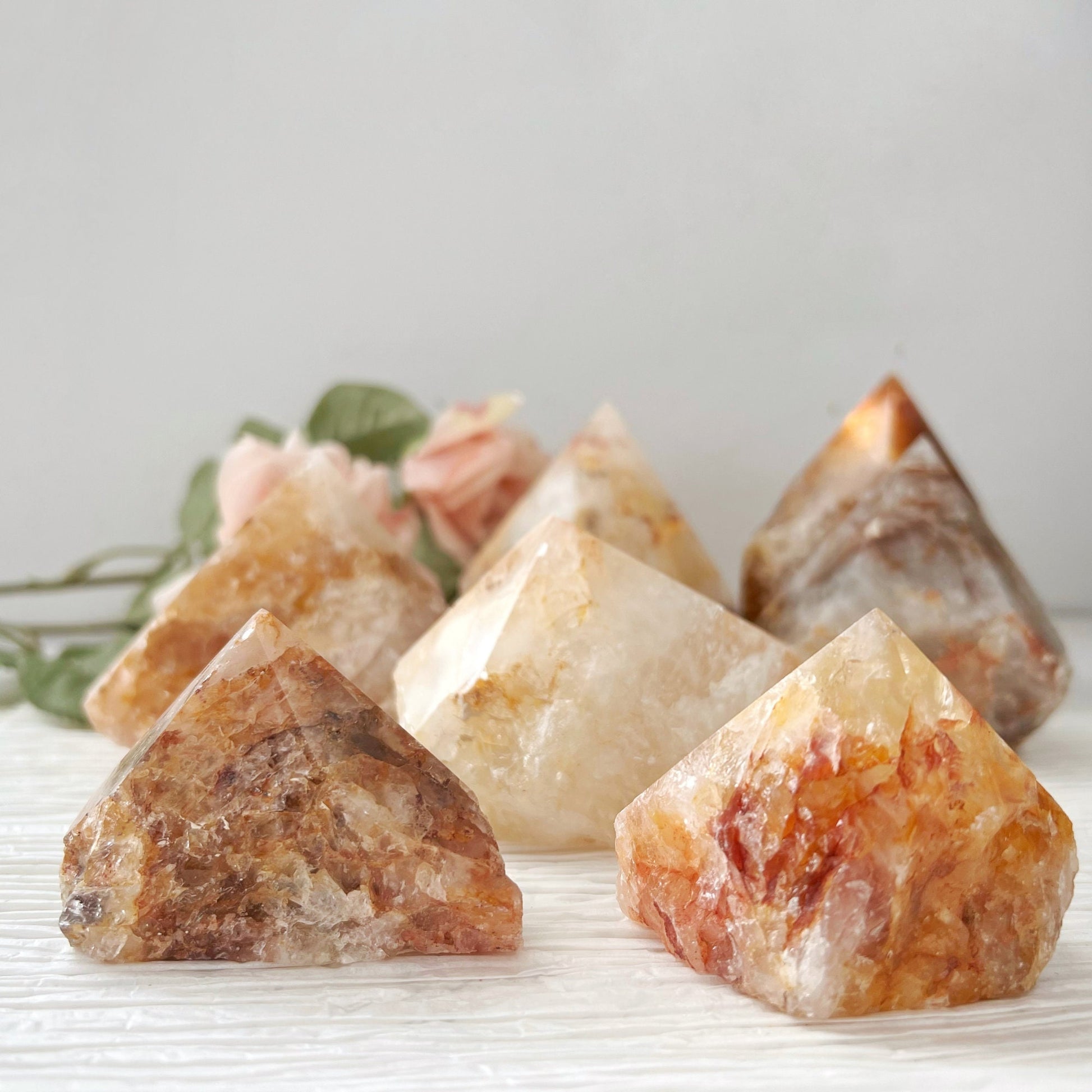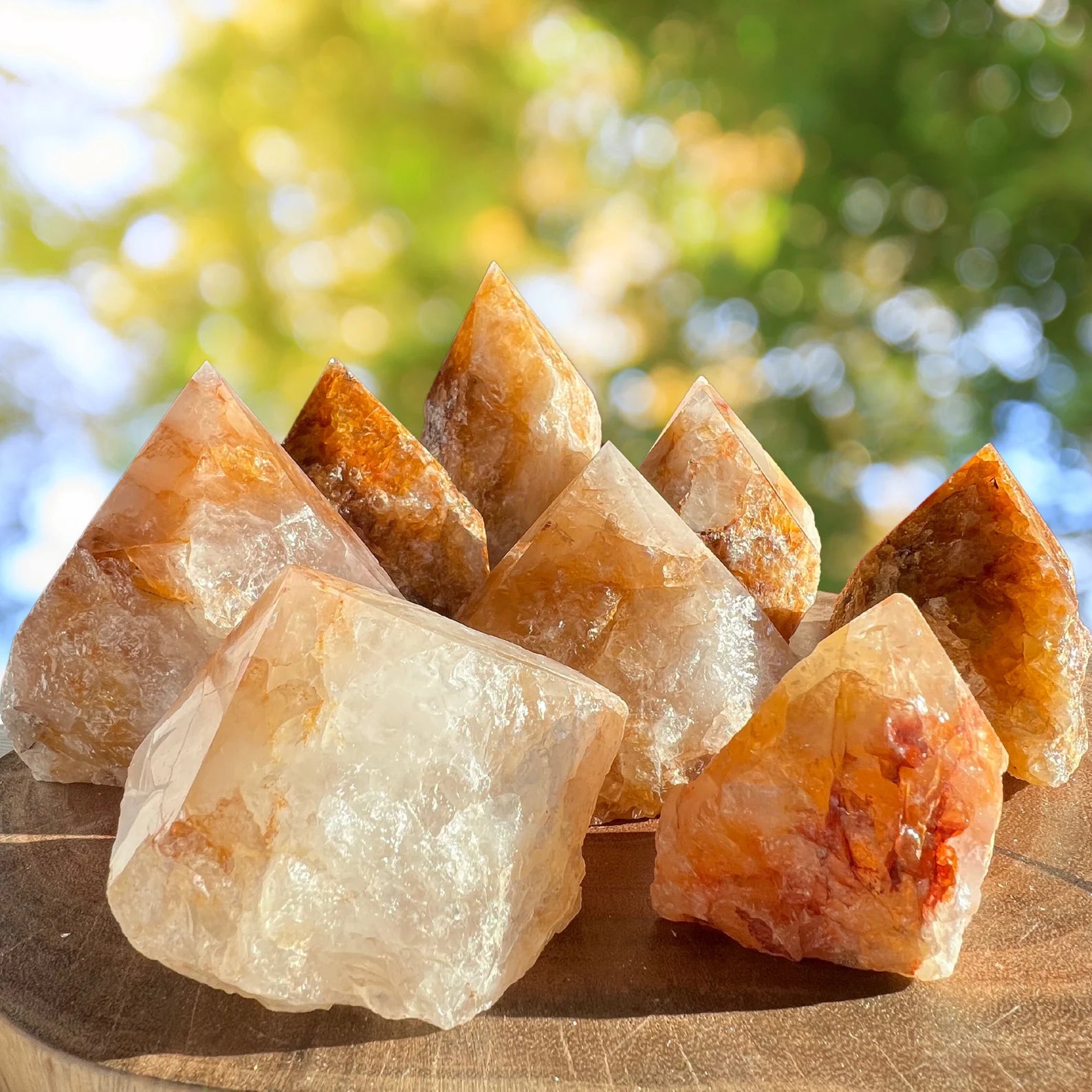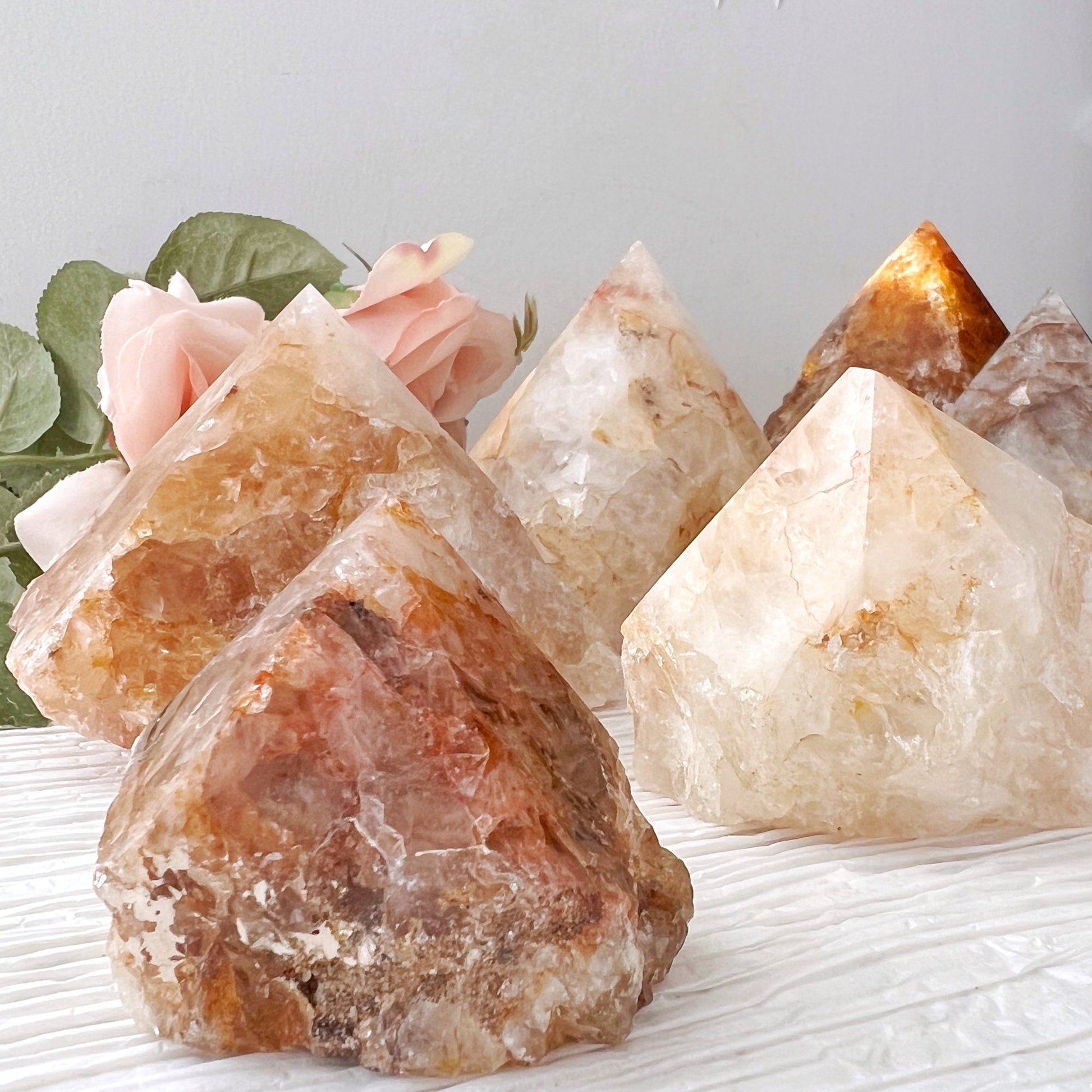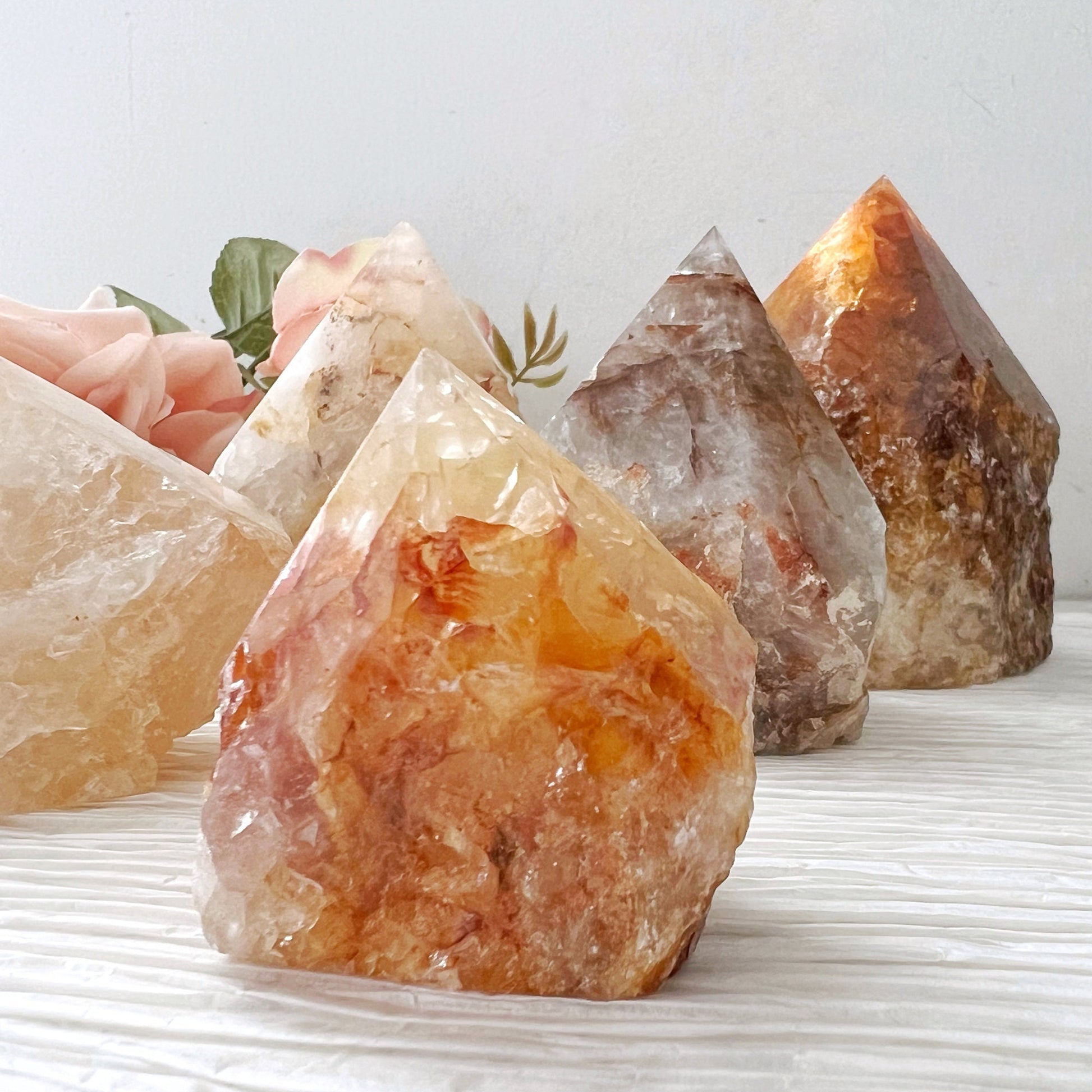 You will receive 1 golden healer quartz top polished point that measures approximately 2-4" in height and stands upright. The sides are rough and the base is cut so these stand upright. These are stunning golden healer quartz points (especially in the sunlight!) with a natural look on the sides finished with a polished tip. These vary in size, and various shapes, typically, the heavier the stone, the taller in height it will be.