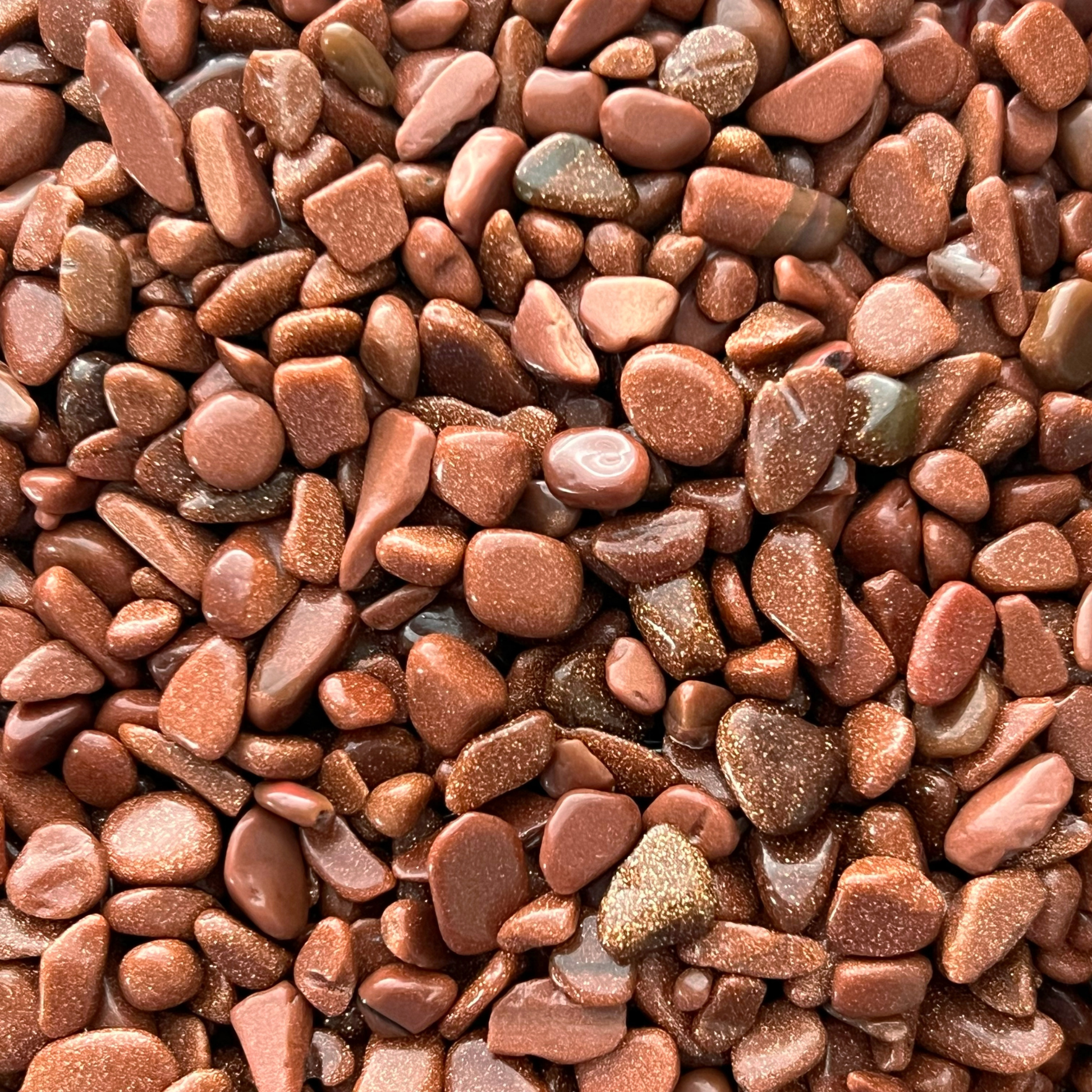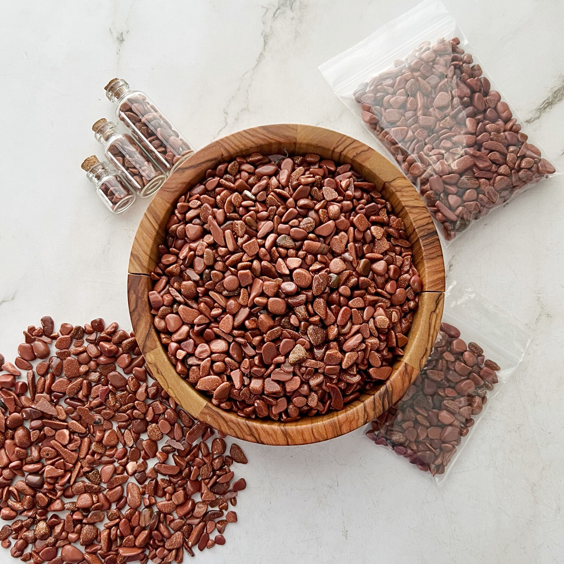 Goldstone Crystal Chips are tumbled and polished man-made tiny stones. These mini stones are perfect for various creative and mystical endeavors. Whether you're into candle making, adding to your roller ball oils, crafting, or creating resin jewelry, these chips add a touch of natural energy to your projects. They're also ideal for spell jars, mojo bags, witch balls, orgone devices, and as sacred additions to your altar jars.