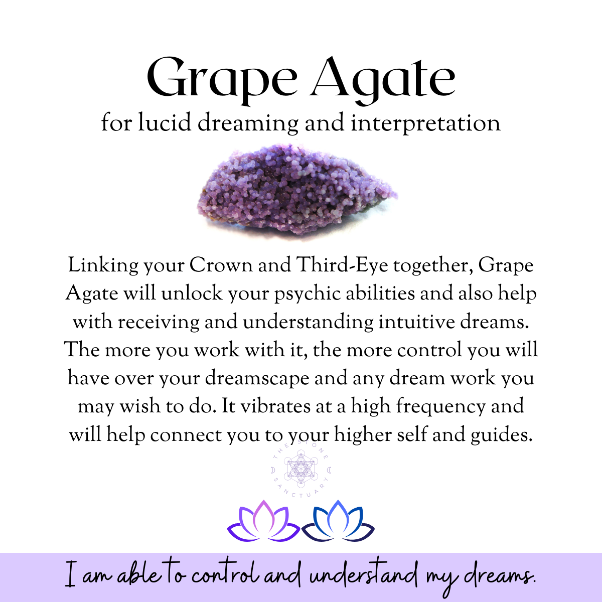 Linking your Crown and Third-Eye together, Grape Agate will unlock your psychic abilities and help you receive and understand intuitive dreams. The more you work with it, the more control you will have over your dreamscape and any dream work that you may wish to do. It vibrates at a high frequency and will help connect you to your higher self and guides.