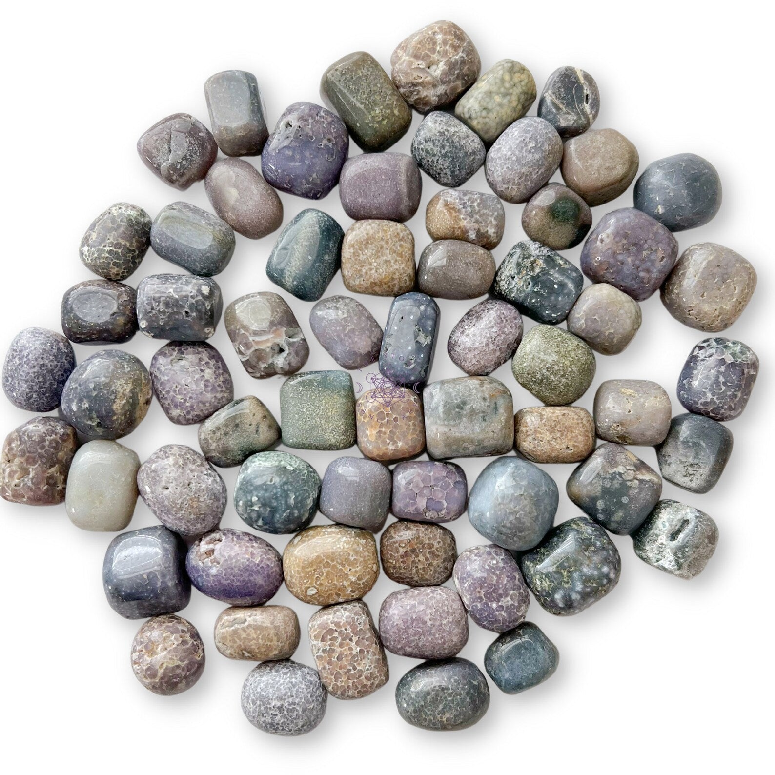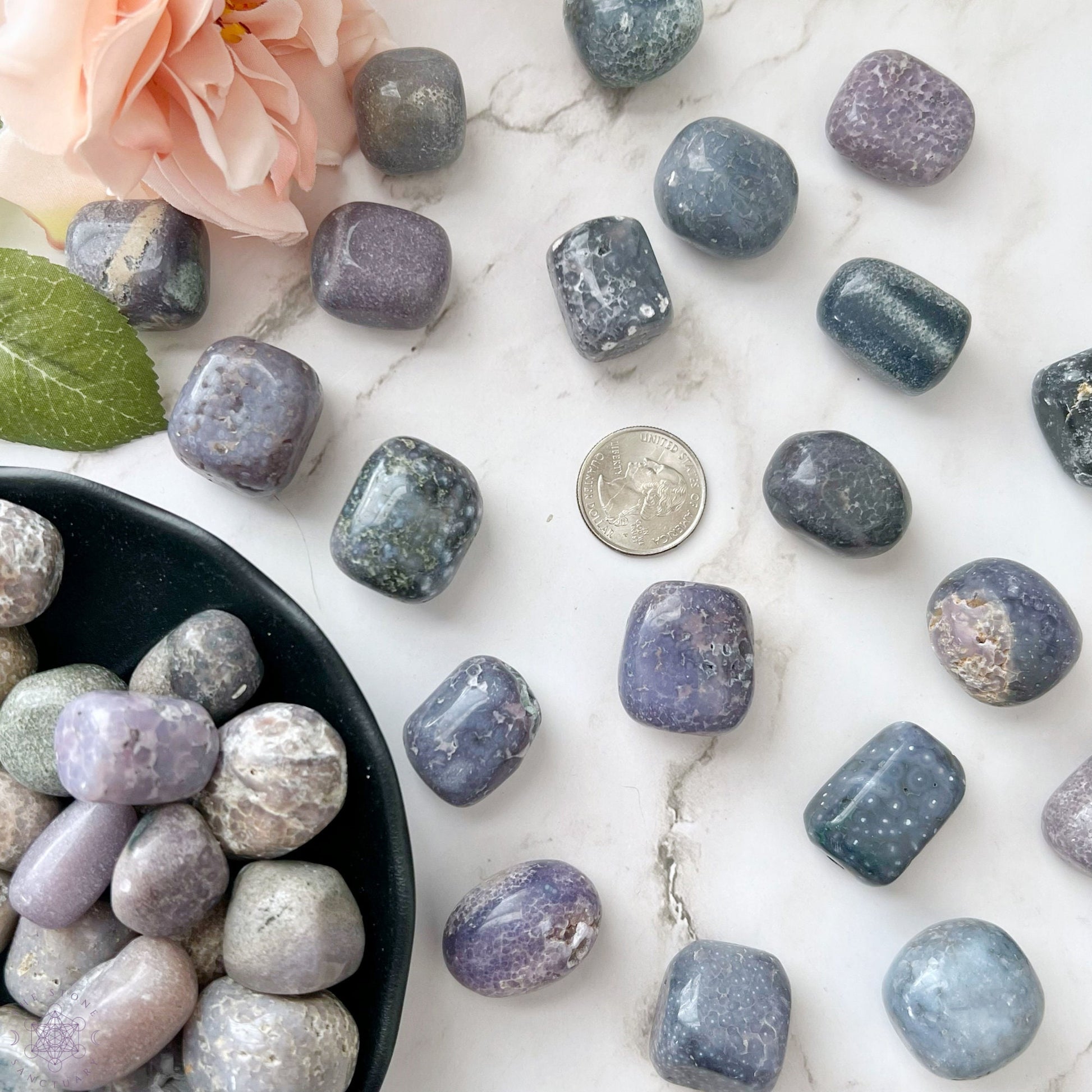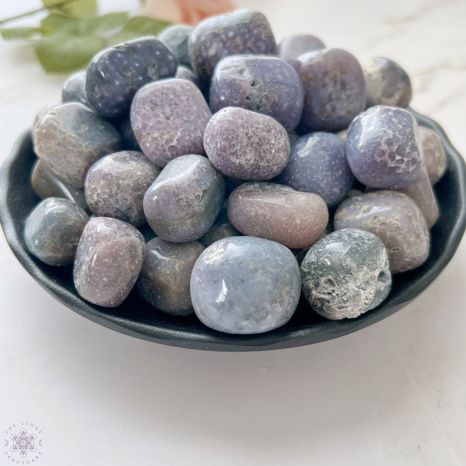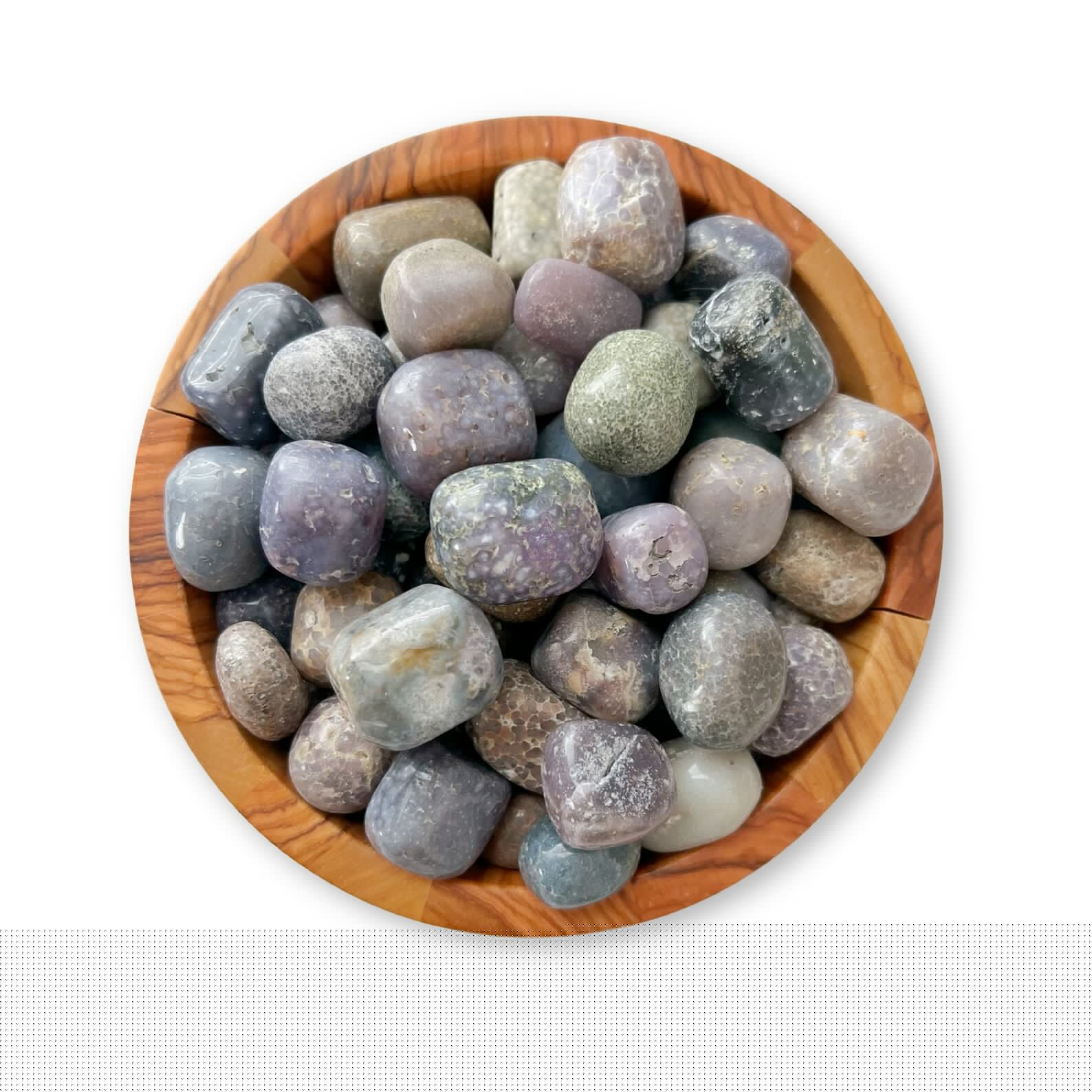 Grape Agate, also known as Botryoidal Chalcedony, is characterized by its grape-like clusters of small, round, and often translucent or translucent purple spheres. It has a unique and distinct appearance due to its clustered growth pattern. Due to its growth pattern, sometimes there will be pitting in small areas on this tumbled stone.