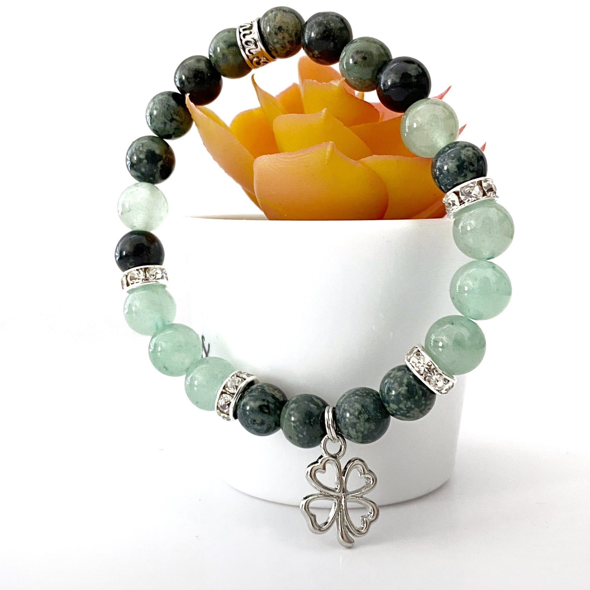Discover the perfect fusion of nature's tranquility and luck with our Green Aventurine and Kambaba Jasper energy bracelet. Each bracelet features 8mm polished beads of Green Aventurine, known as the Stone of Opportunity, and Kambaba Jasper, a gem known for its stress-relieving properties. Together, they create a synergy of prosperity and peace. The bracelet is further embellished with a Lucky Clover silver charm and crystal bead spacers, adding an extra layer of charm and elegance.