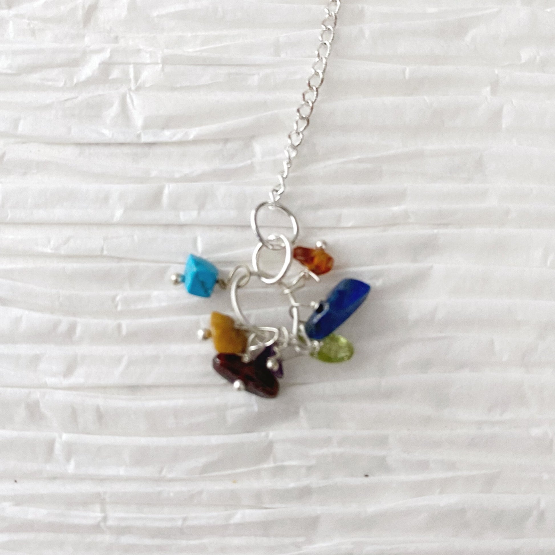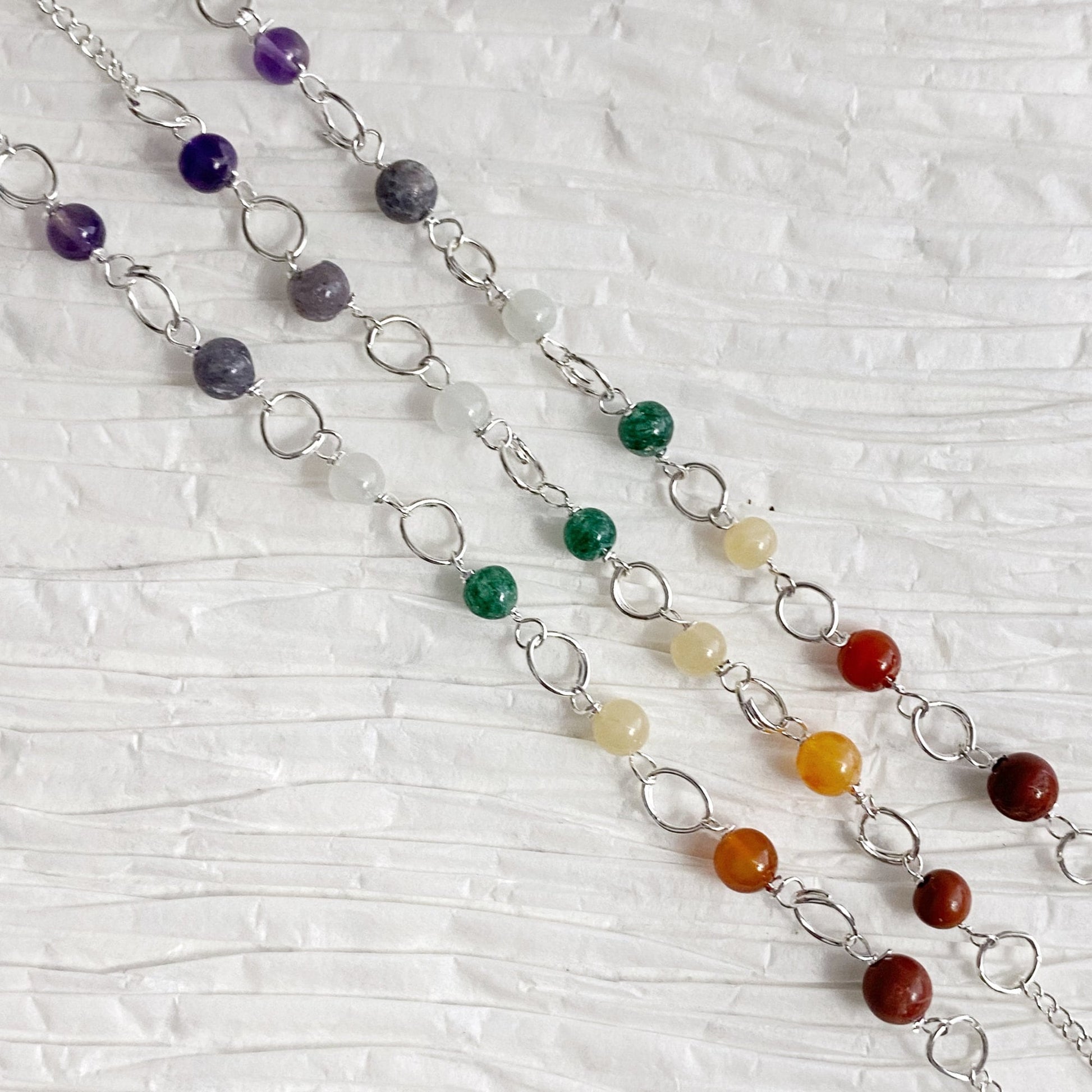 The pendulum is attached to a silver Chakra crystal chain, meticulously adorned with seven crystals representing the body's energy centers: Amethyst, Iolite, Blue Aventurine, Dark Green Aventurine, Yellow Aventurine, Carnelian, and Red Jasper. Each crystal is chosen for its alignment with the respective chakra, creating a harmonious balance of energies. A chakra chip charm at the end of the chain ensures slip-free handling, allowing you to focus on your spiritual practice without distraction.