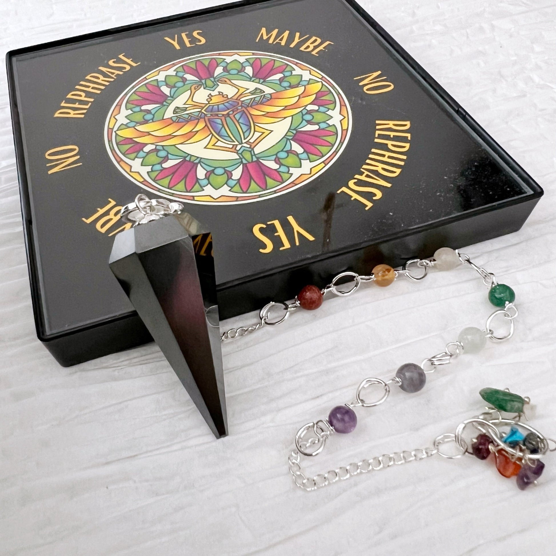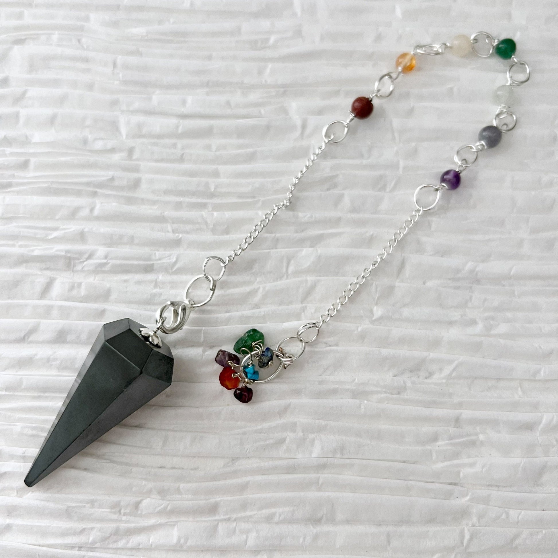 Whether you're an experienced practitioner or new to pendulum dowsing, this Hematite Crystal Pendulum with its chakra chain is designed to enhance your spiritual journey. Use it for gaining insight, making decisions, or as a focal point during meditation. Let this pendulum be a guide and a reminder of the interconnectedness of the physical and spiritual realms, a beautiful and potent addition to your collection of metaphysical tools.