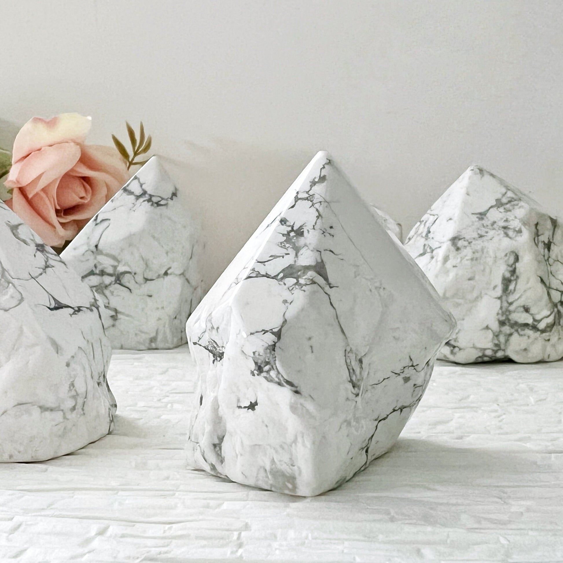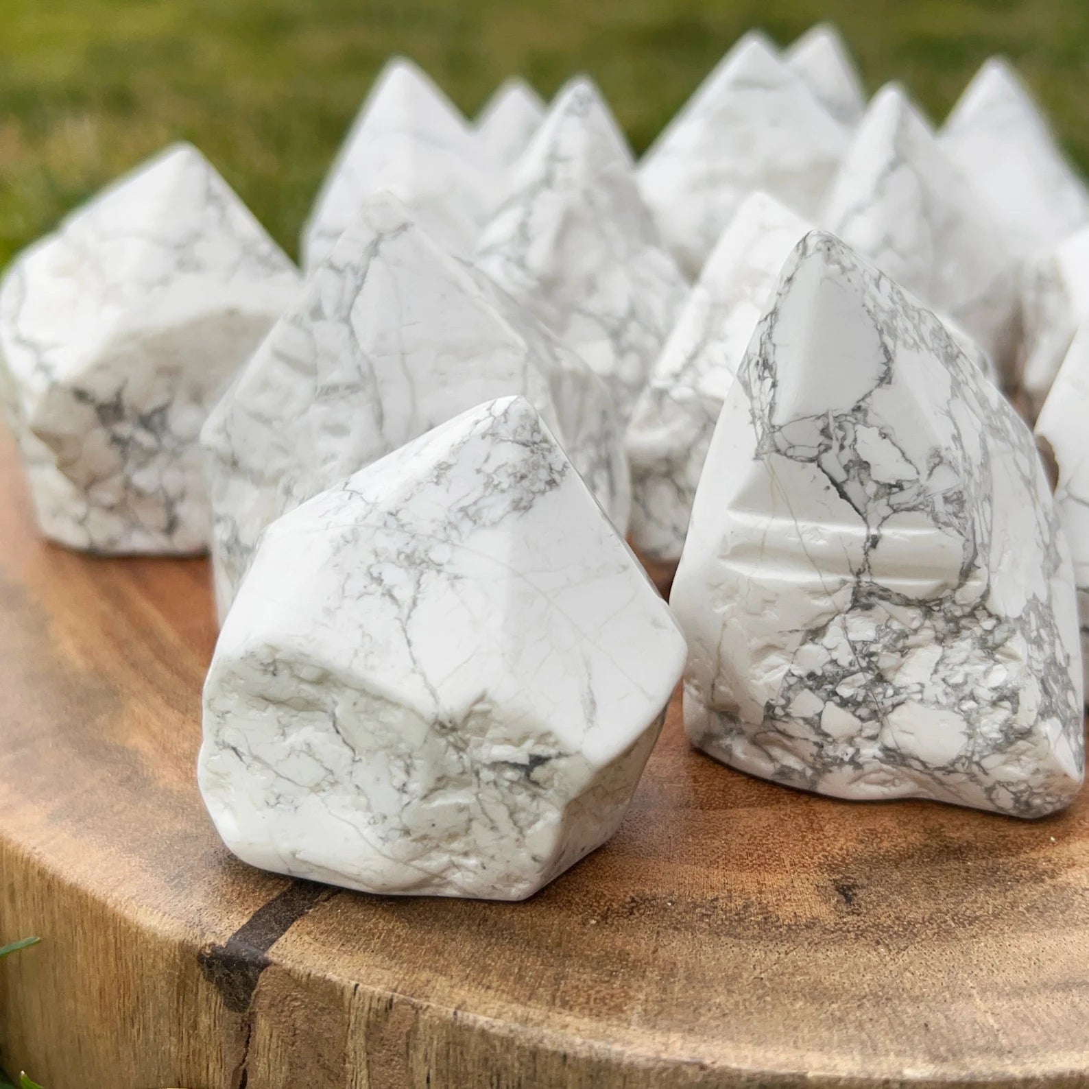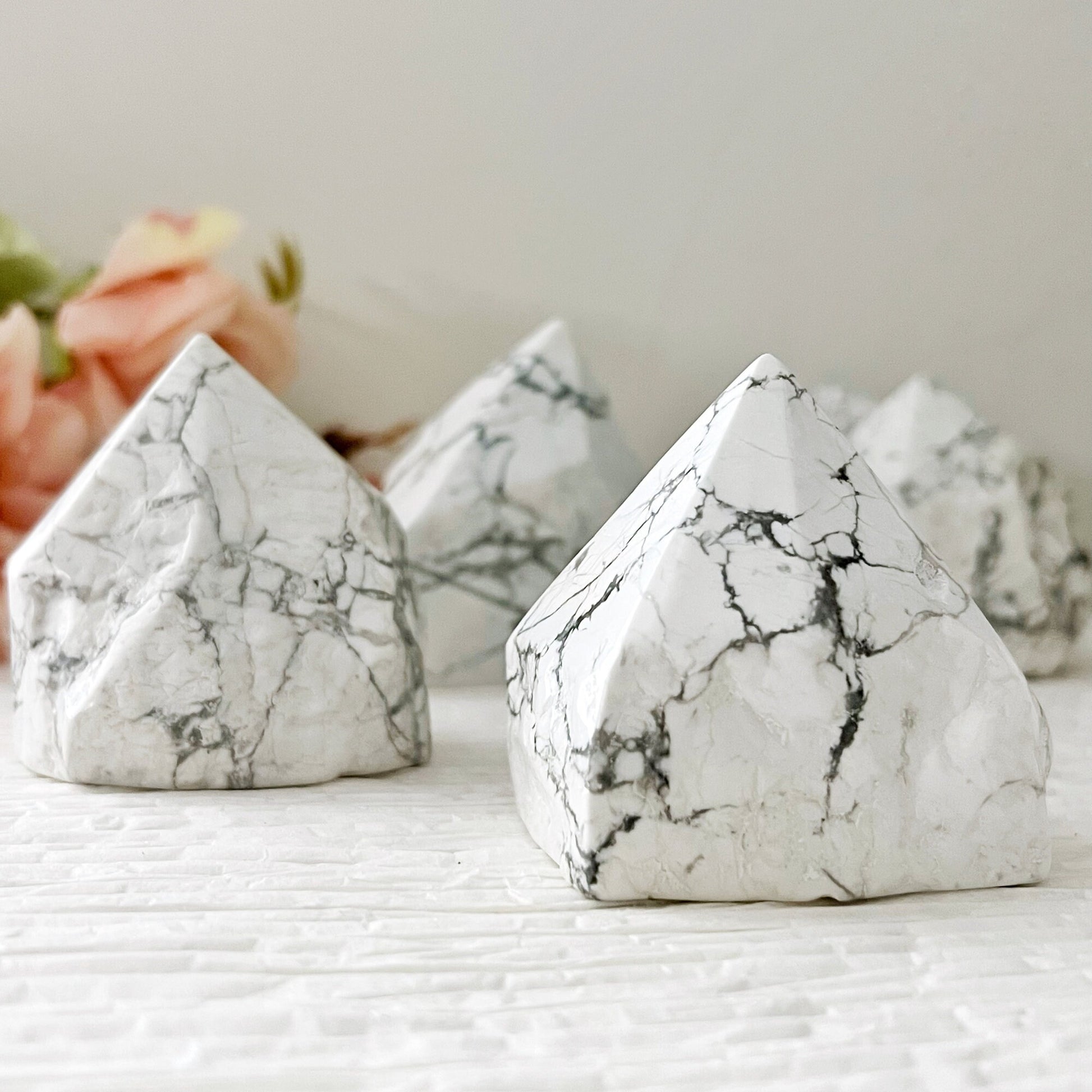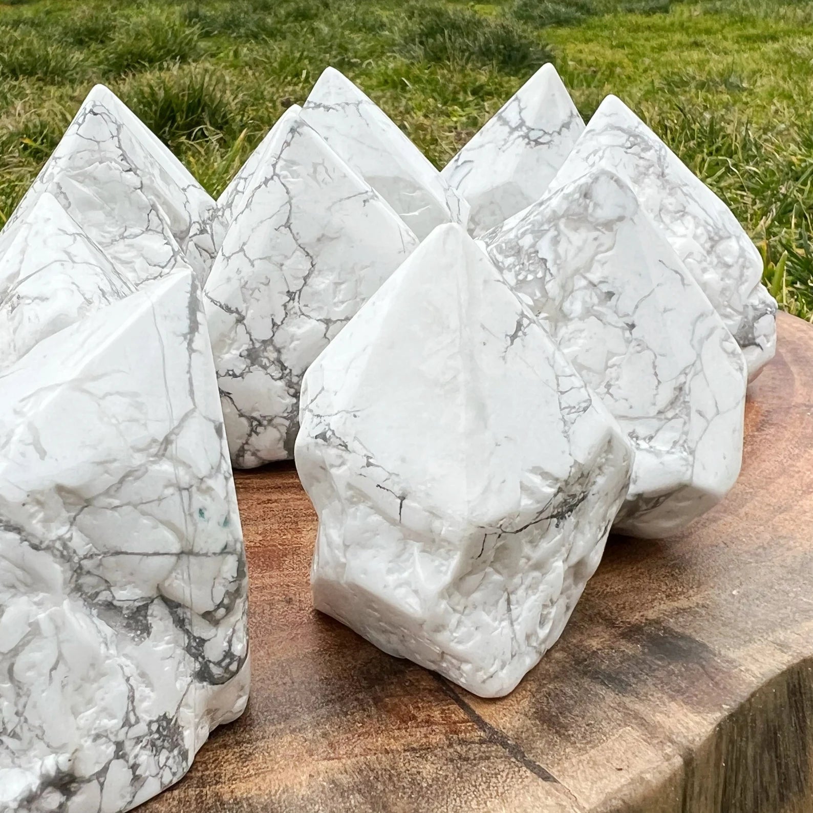 You will receive 1 Howlite top polished point that measures approximately 2-4" in height and stands upright. The sides are rough but lightly polished, and the base is cut so these stand upright. These are truly soothing, relaxing points for your bath or bedroom, with a natural look on the sides finished with a polished tip. These vary in size, and various shapes, typically, the heavier the stone, the taller in height it will be.