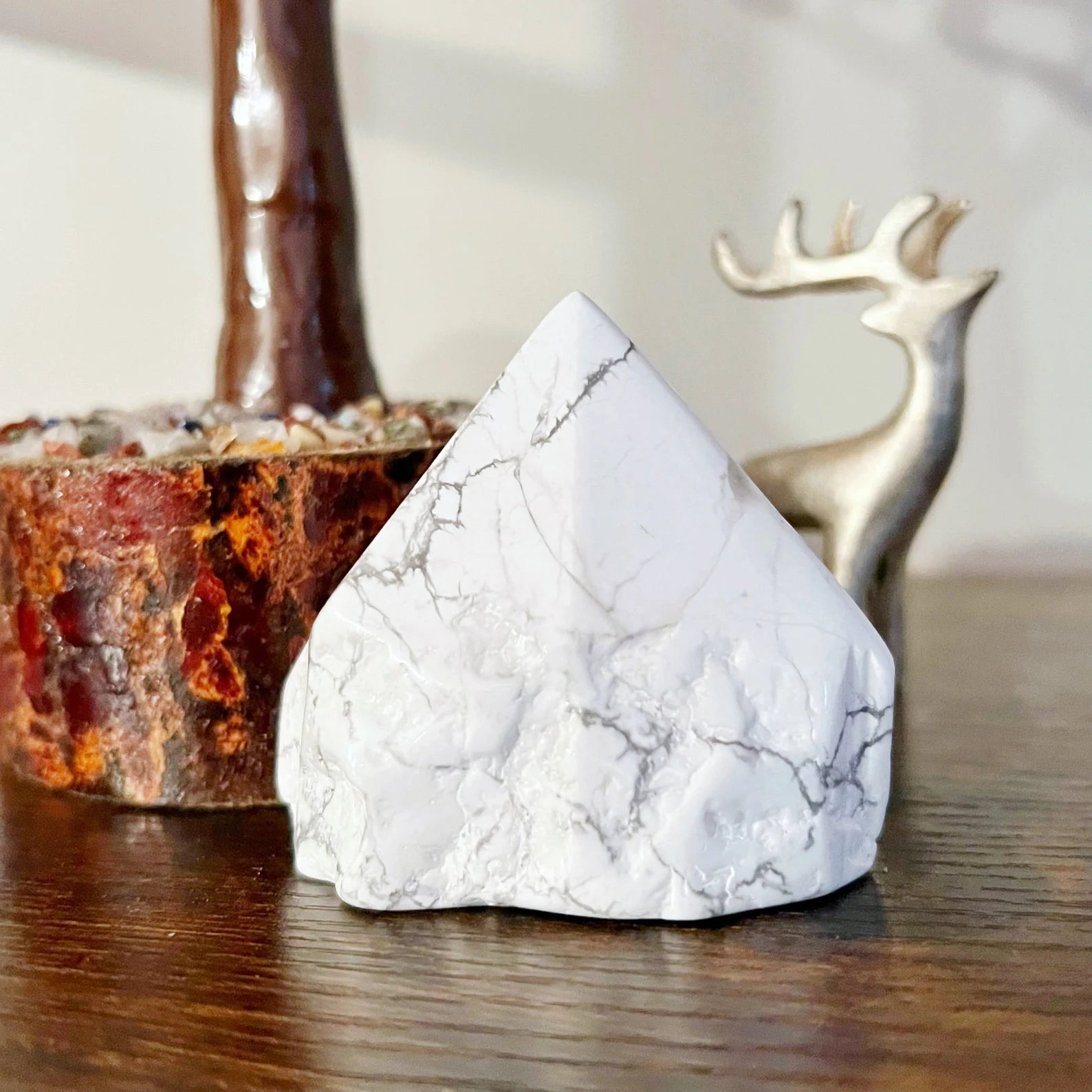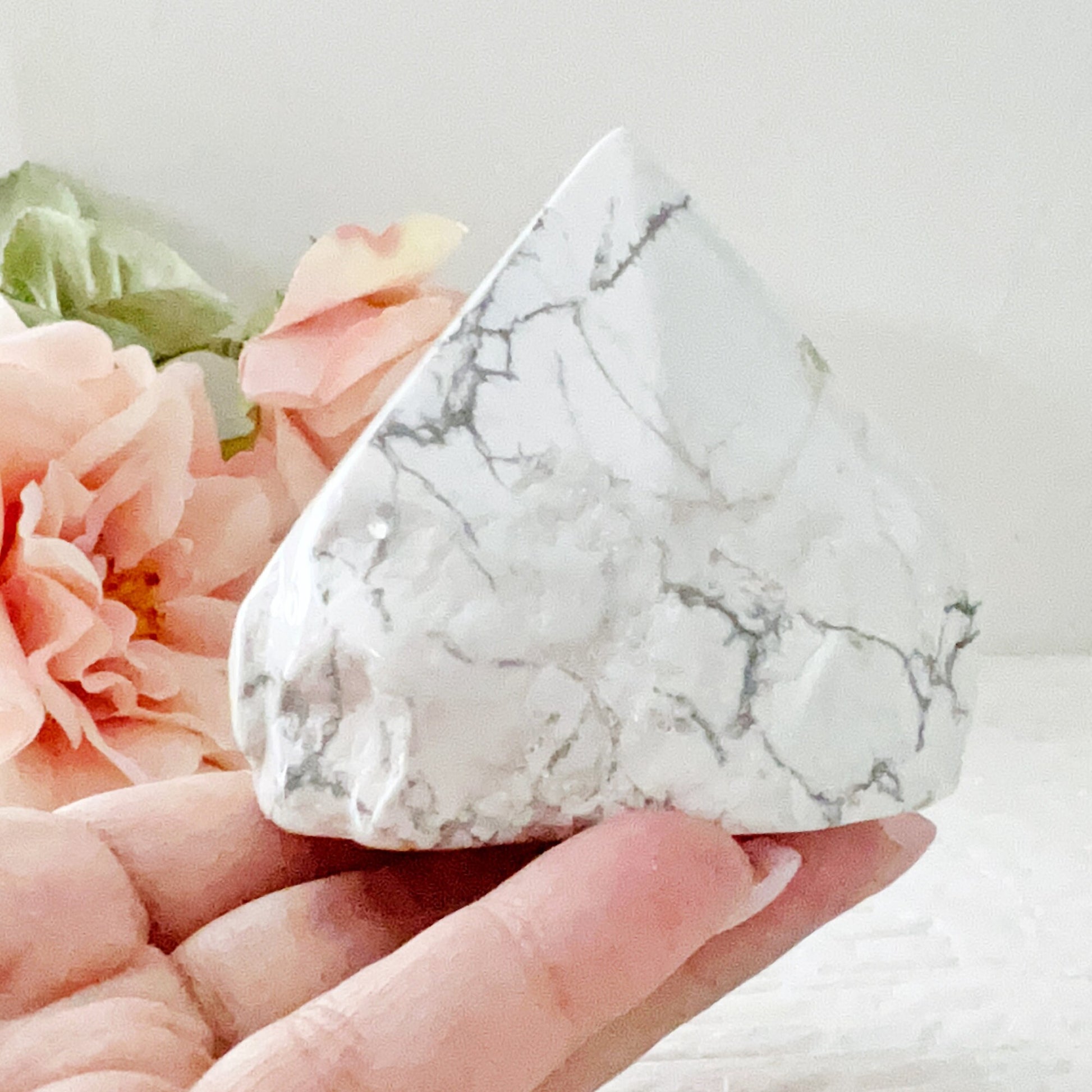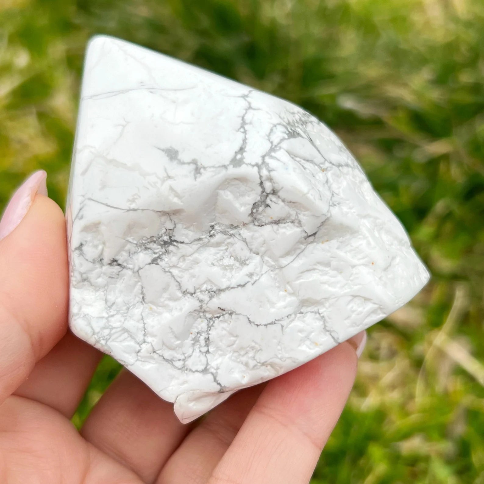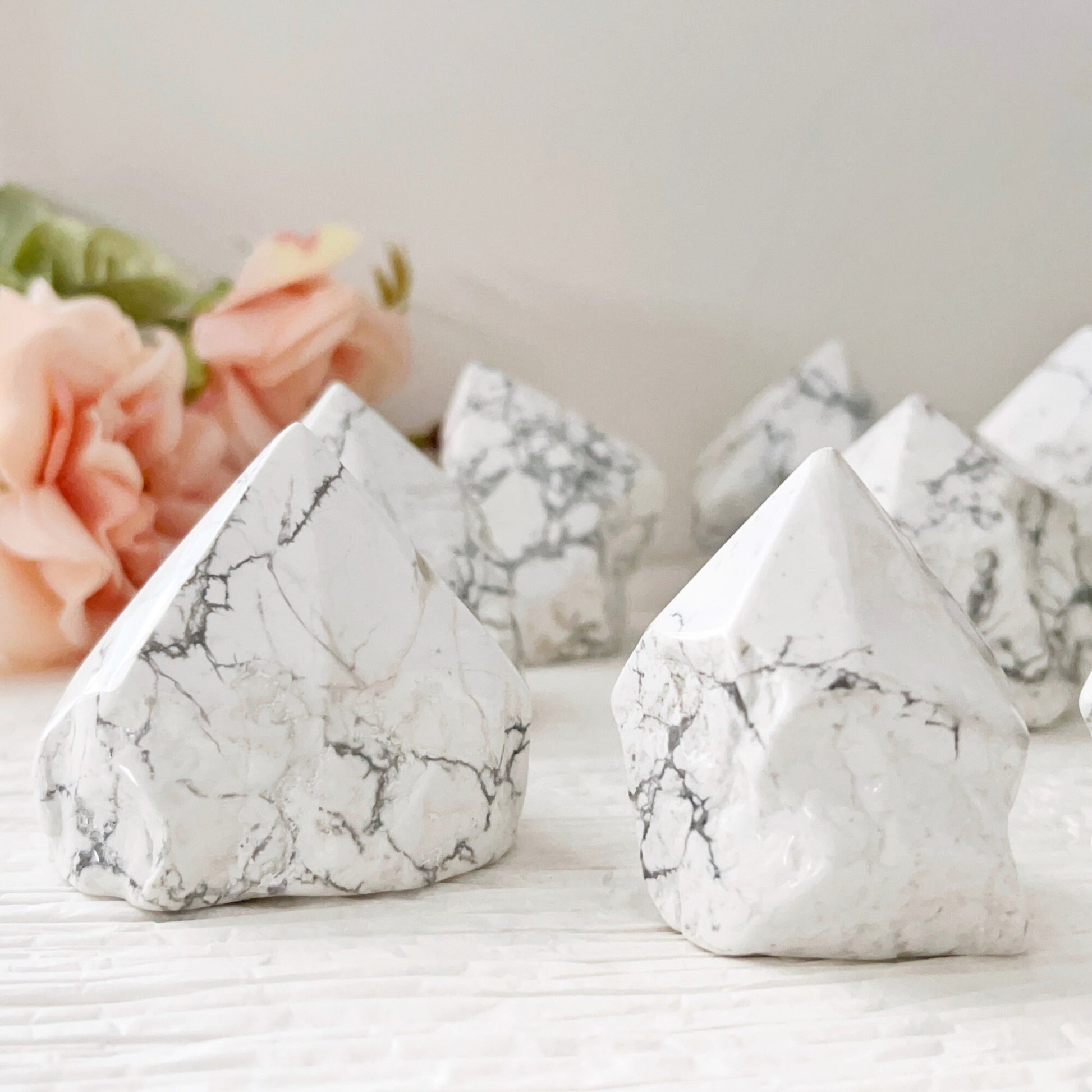 You will receive 1 Howlite top polished point that measures approximately 2-4" in height and stands upright. The sides are rough but lightly polished, and the base is cut so these stand upright. These are truly soothing, relaxing points for your bath or bedroom, with a natural look on the sides finished with a polished tip. These vary in size, and various shapes, typically, the heavier the stone, the taller in height it will be.
