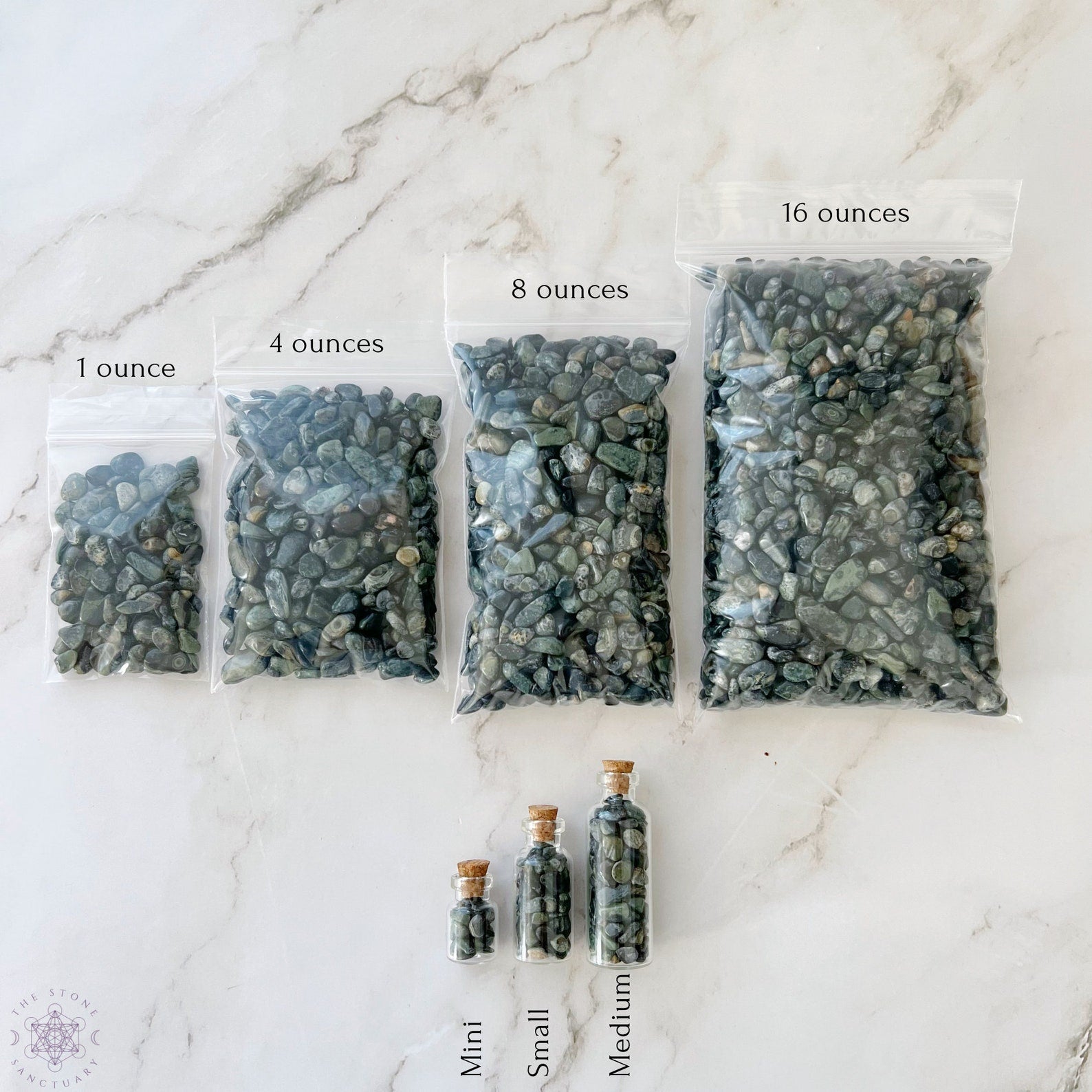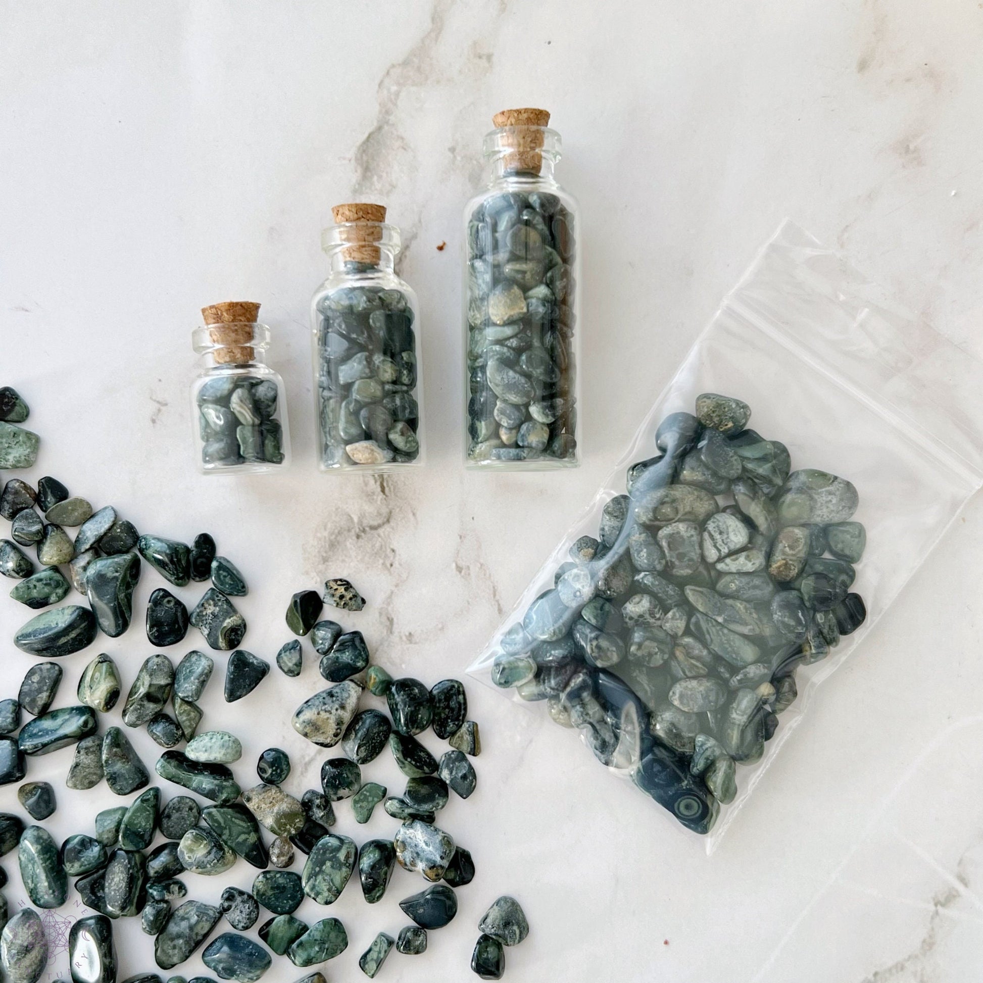 Kambaba Jasper Crystal Chips are tumbled and polished tiny stones. These mini stones are perfect for various creative and mystical endeavors. Whether you're into candle making, adding to your roller ball oils, crafting, or creating resin jewelry, these chips add a touch of natural energy to your projects. They're also ideal for spell jars, mojo bags, witch balls, orgone devices, and as sacred additions to your altar jars.