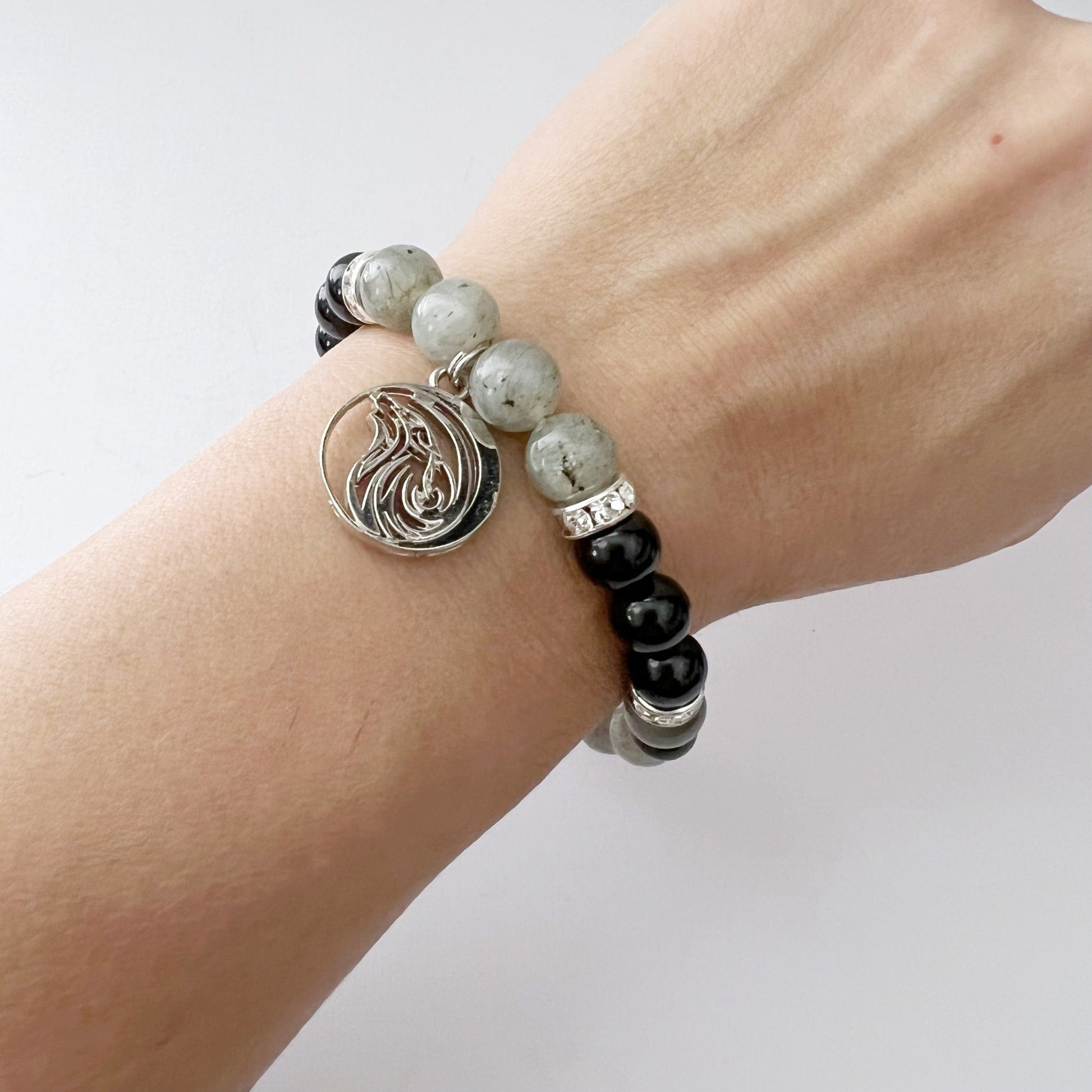 8mm Labradorite & Black Tourmaline Beaded Bracelet w/ Wolf Charm