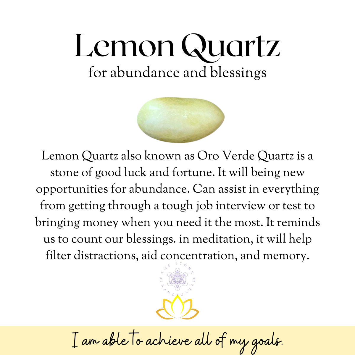 Lemon Quartz also known as Oro Verde Quartz is a stone of good luck and fortune. It will being new opportunities for abundance. Can assist in everything from getting through a tough job interview or test to bringing money when you need it the most. It reminds us to count our blessings. in meditation, it will help filter distractions, aid concentration, and memory.
