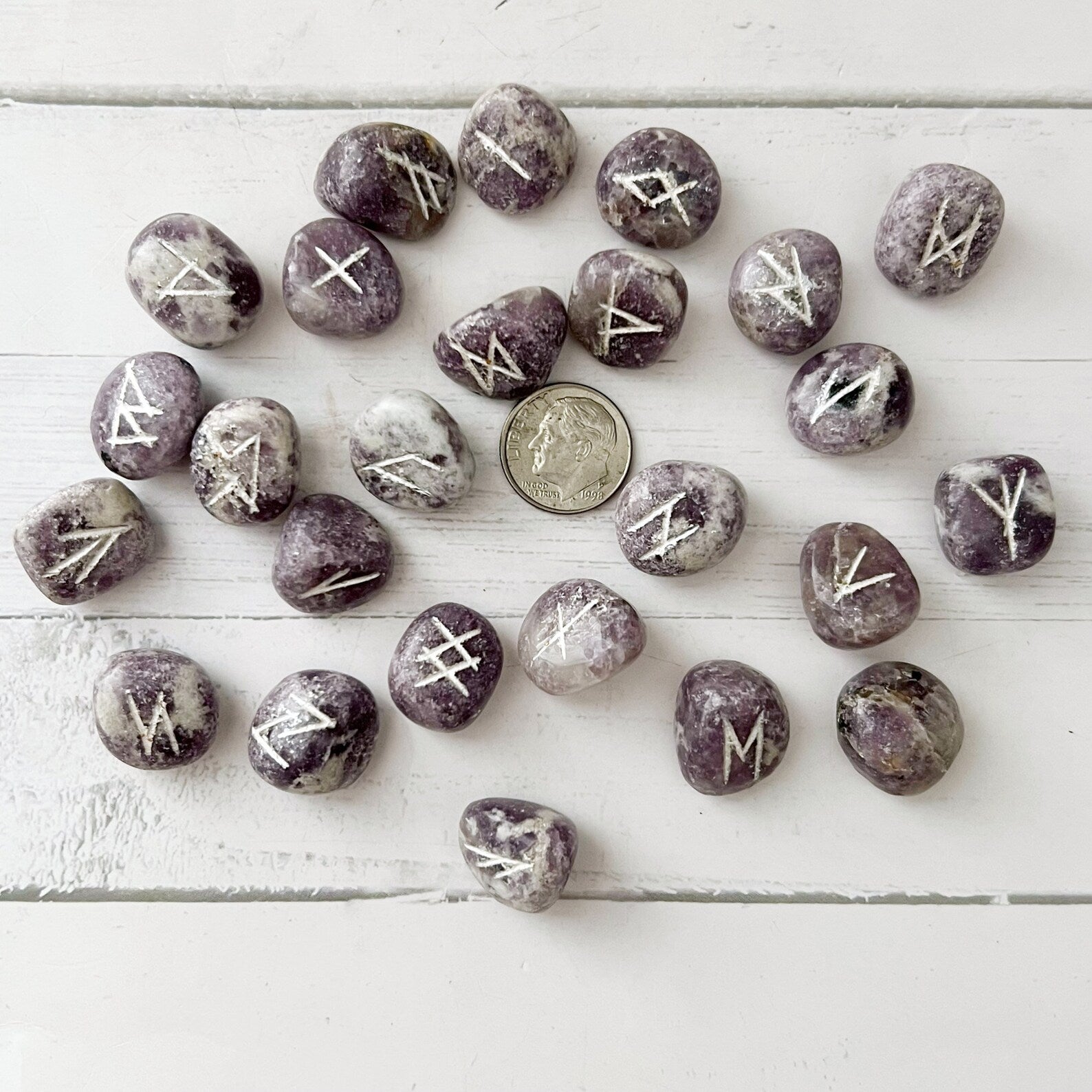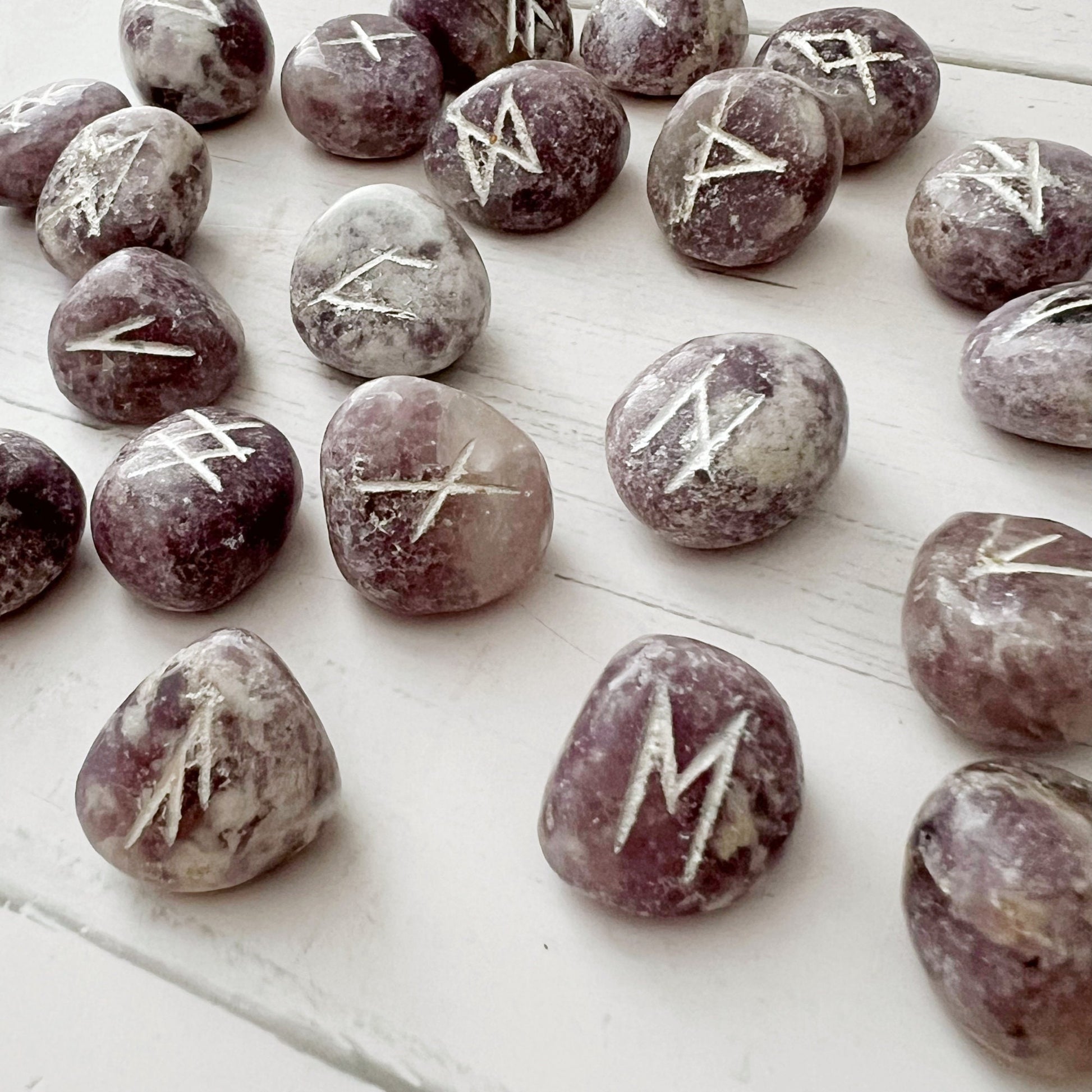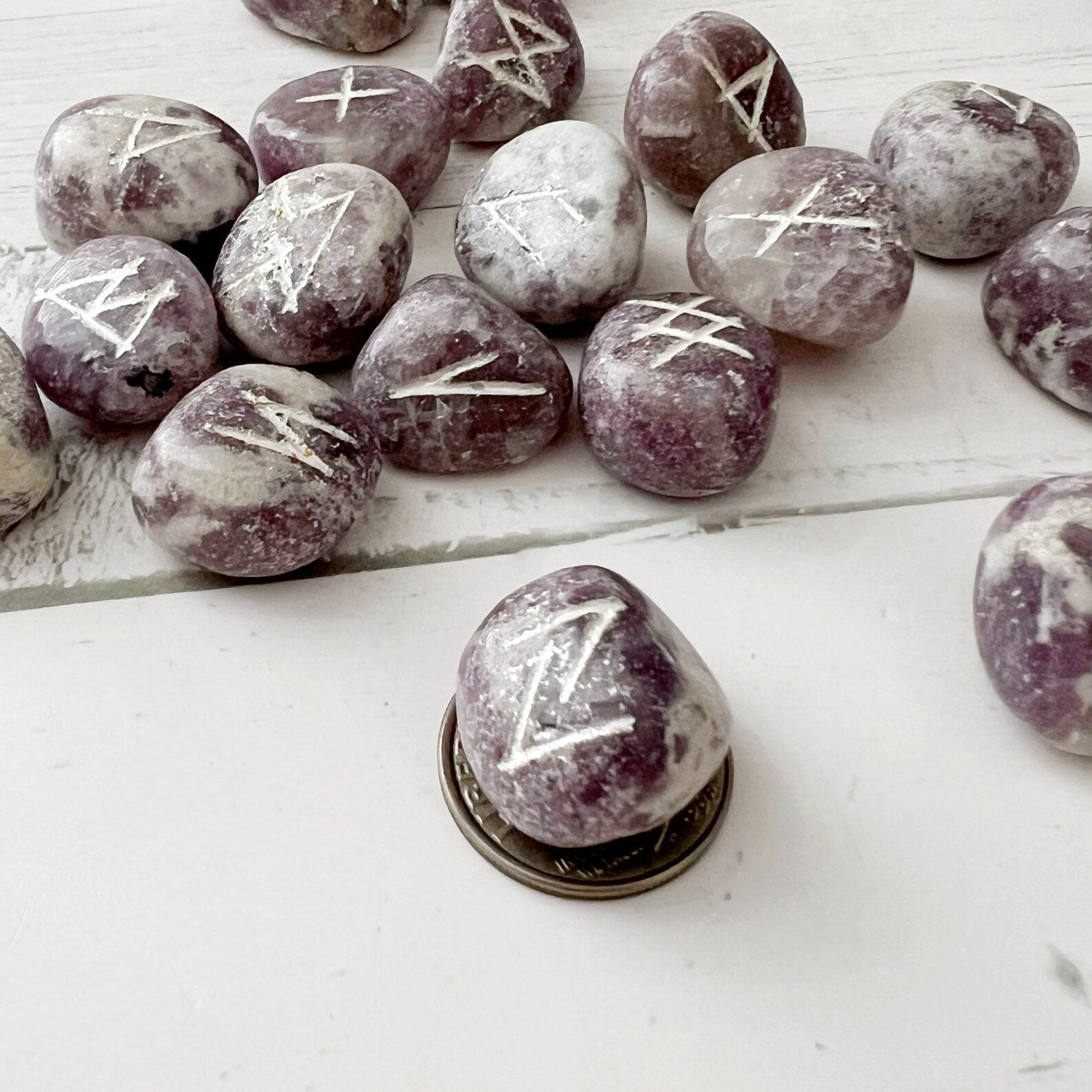 Our Lepidolite stones are hand-selected to ensure that each set perfectly matches all of the runes within it. Please note that due to the natural variations in the stones, your set will vary based on the availability of stock on hand. The photos shown give an idea of the size and quality of each stone.