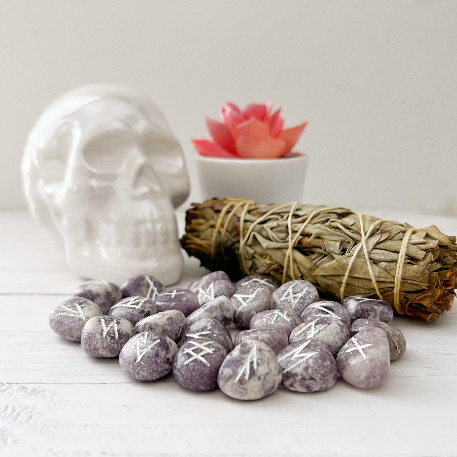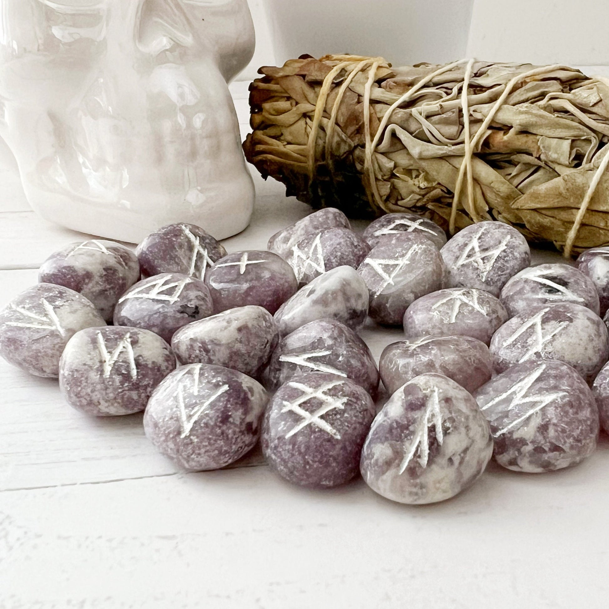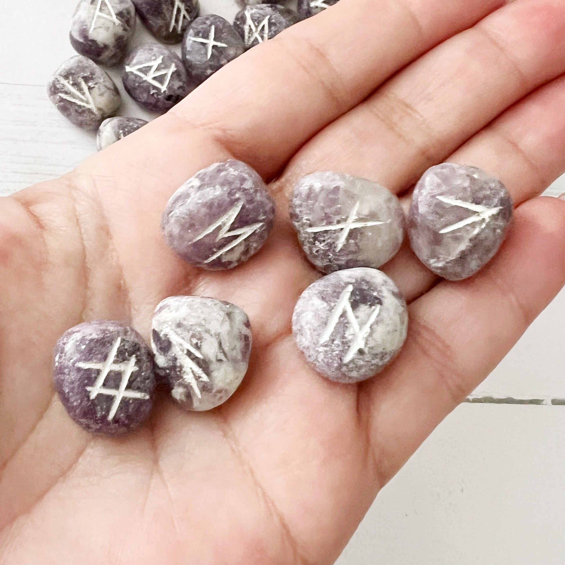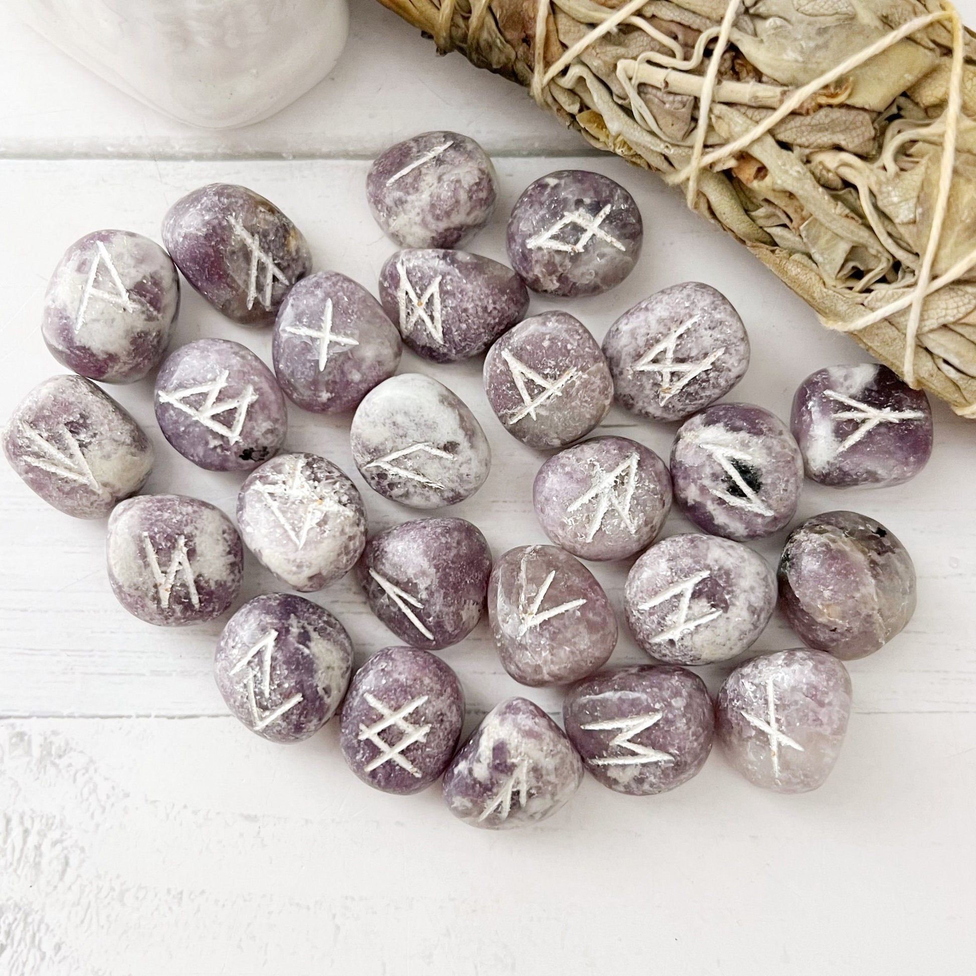 Our Lepidolite stones are hand-selected to ensure that each set perfectly matches all of the runes within it. Please note that due to the natural variations in the stones, your set will vary based on the availability of stock on hand. The photos shown give an idea of the size and quality of each stone.