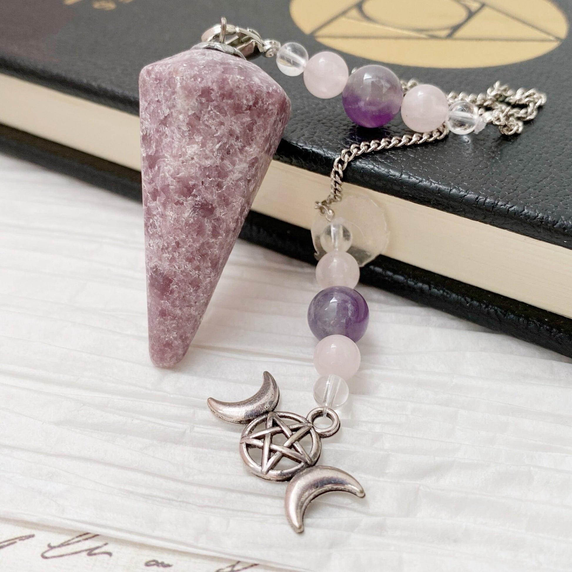 Lepidolite Crystal Hexagonal Pendulum with Triple Moon Charm