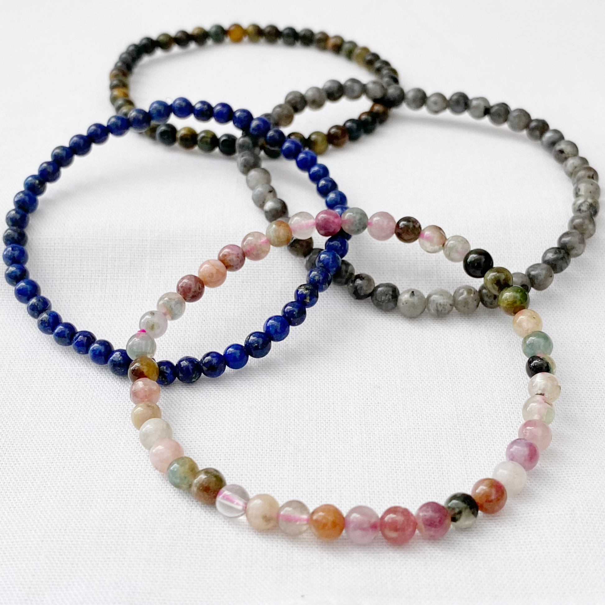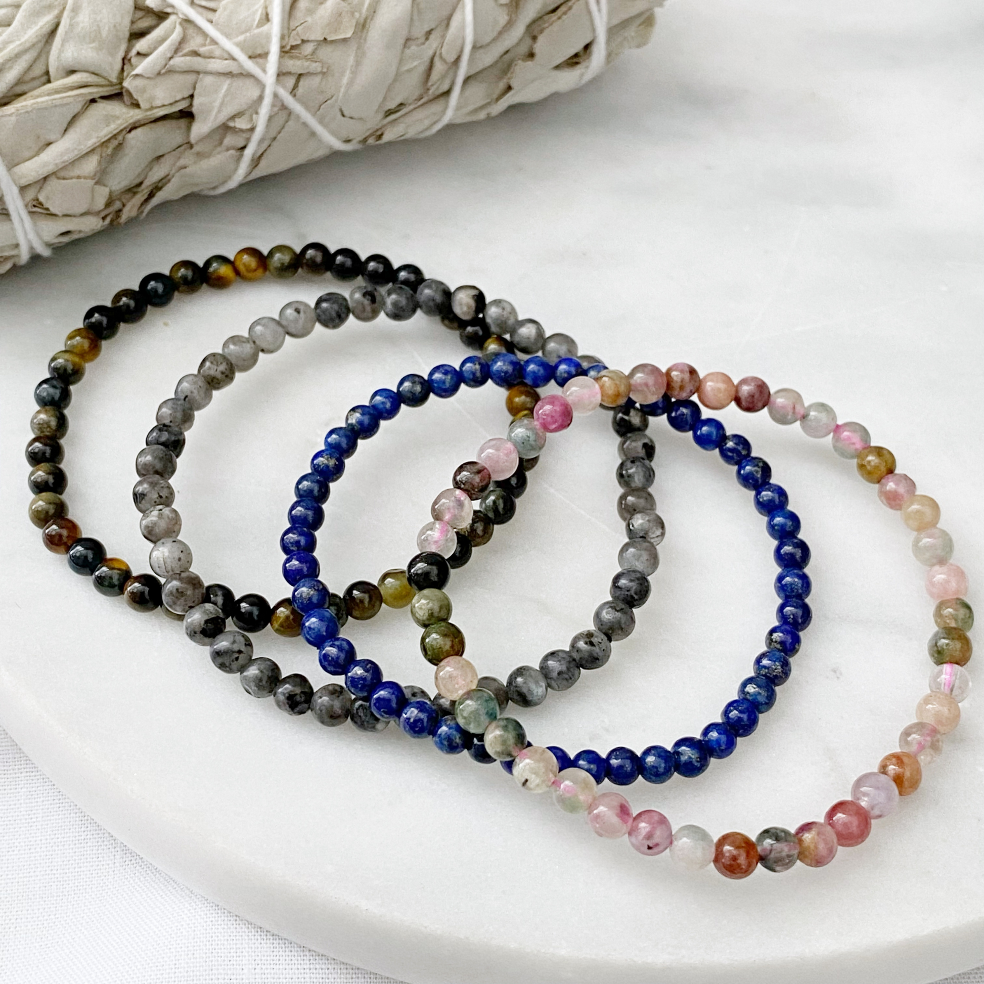 Includes one (1) each of the following: Rainbow Tourmaline, Lapis Lazuli, Labradorite, and Blue Tiger Eye 4mm bead energy bracelets infused with Usui Reiki energy, love, and light. These fit-size S-M wrists.