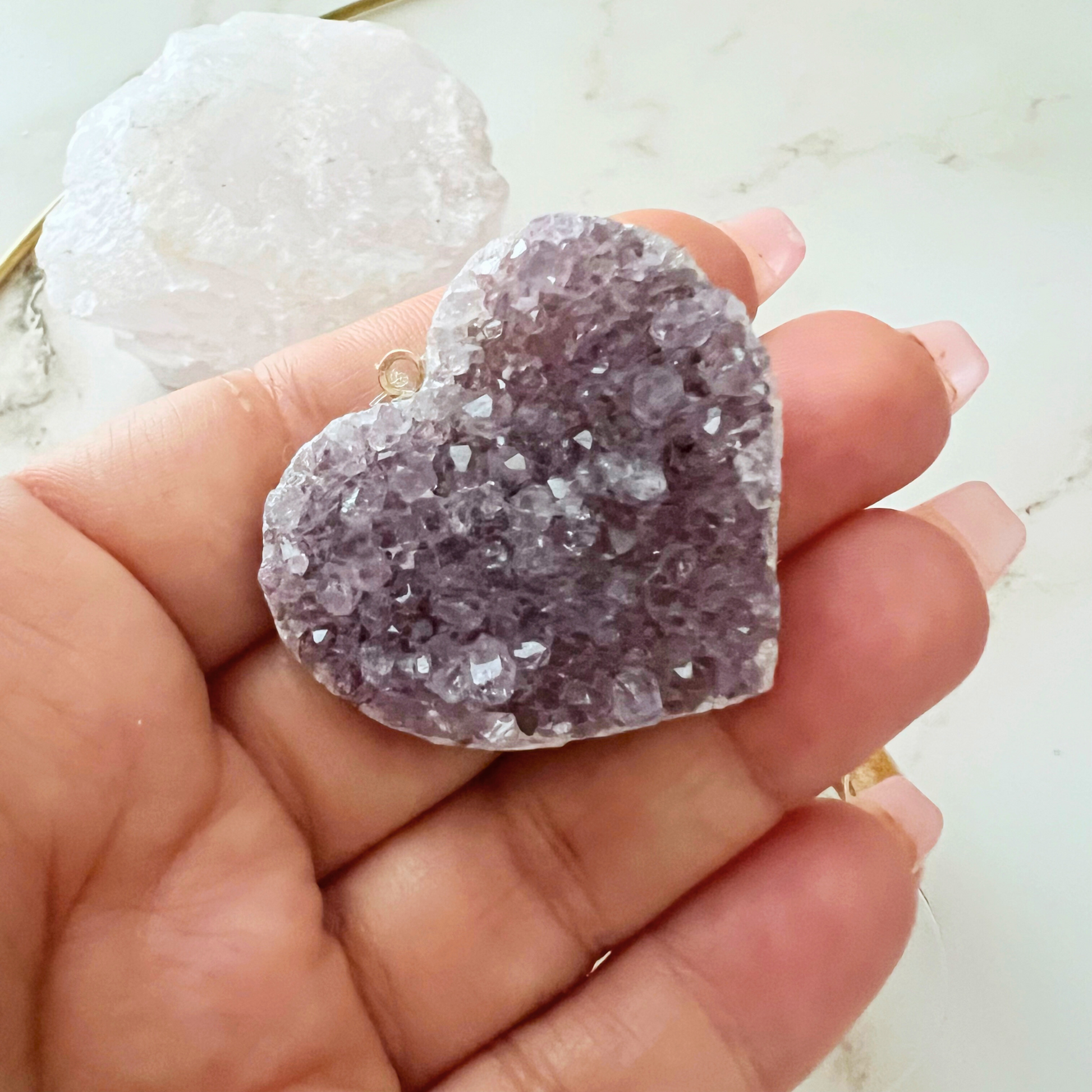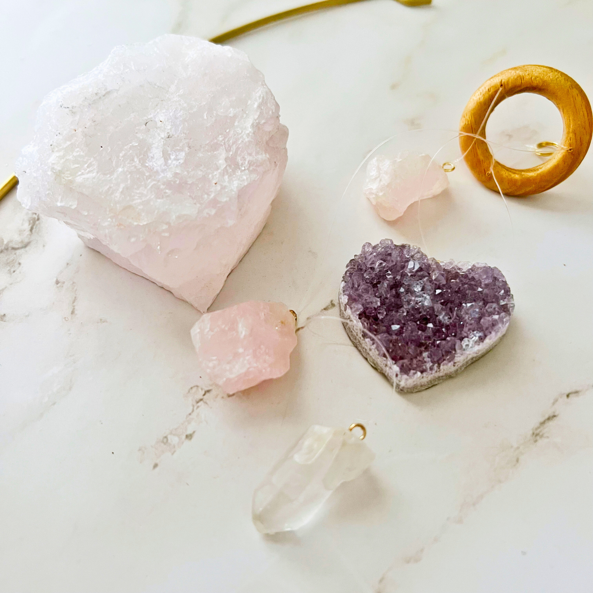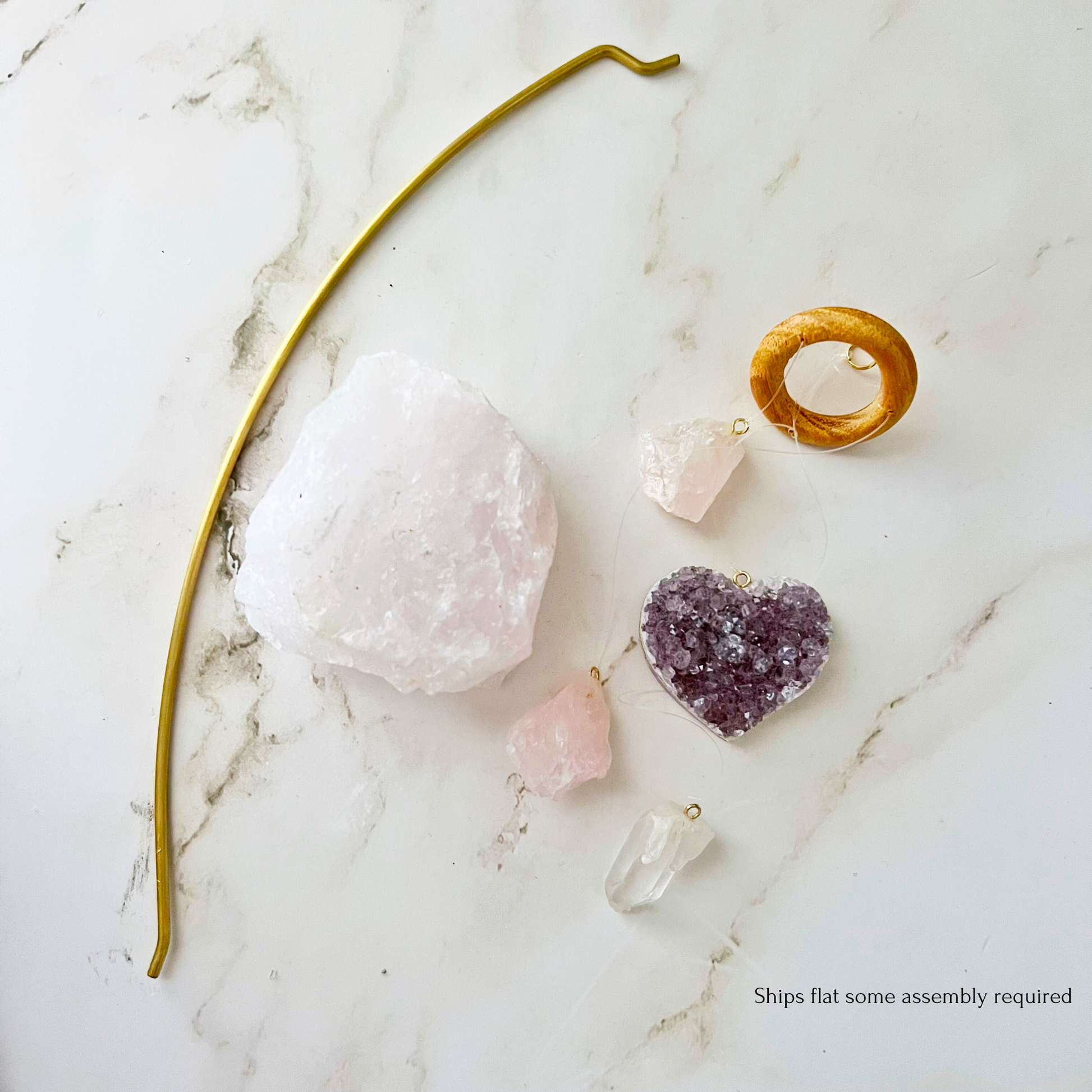 Invite gentle, loving energy into your space with our Love & Harmony Crystal Table Chime. This enchanting piece features a sturdy raw rose quartz base, known for its nurturing and heart-healing properties. Suspended delicately above are two raw rose quartz stones, a clear quartz point for clarity and energetic amplification, and a captivating druzy amethyst heart to promote peace, intuition, and emotional balance.