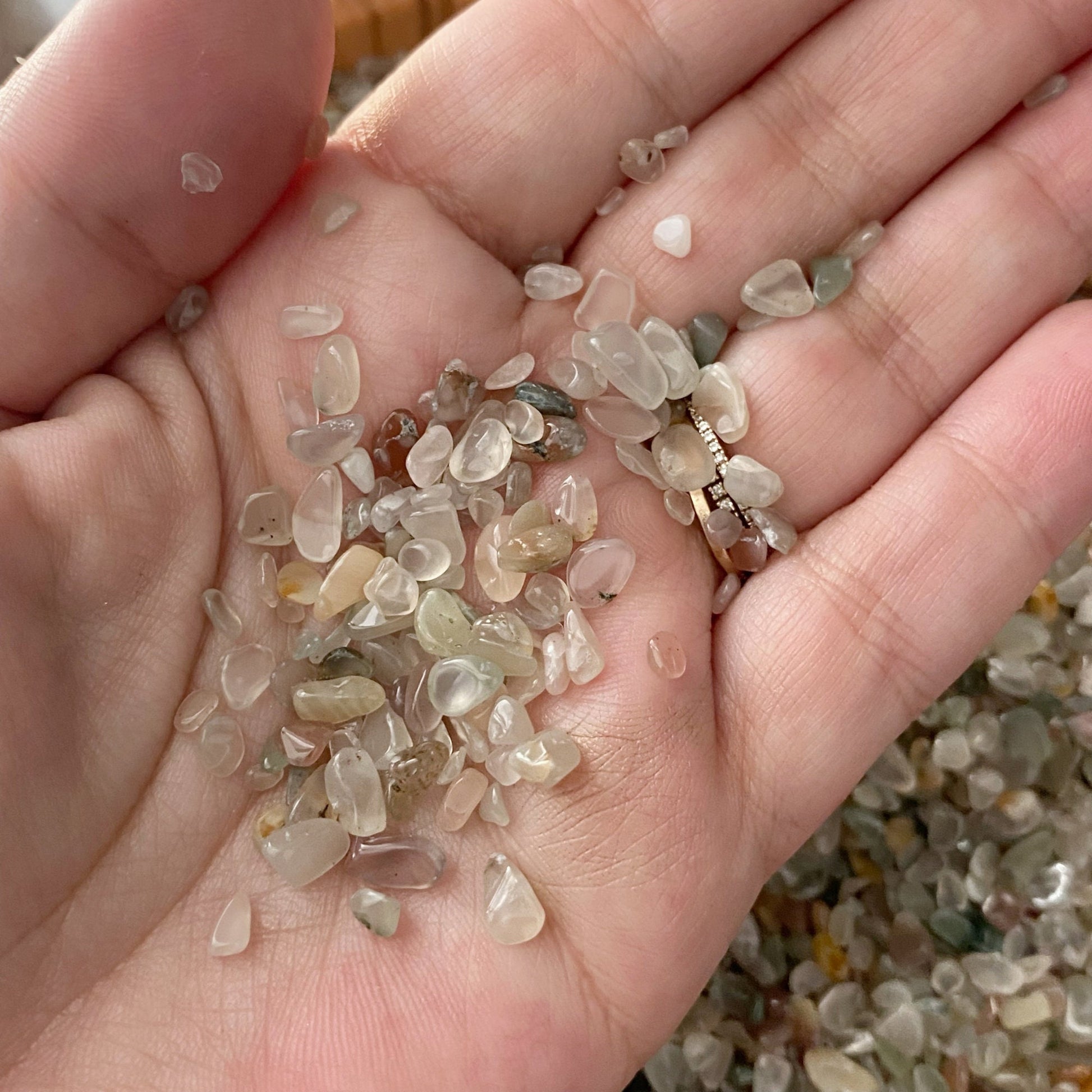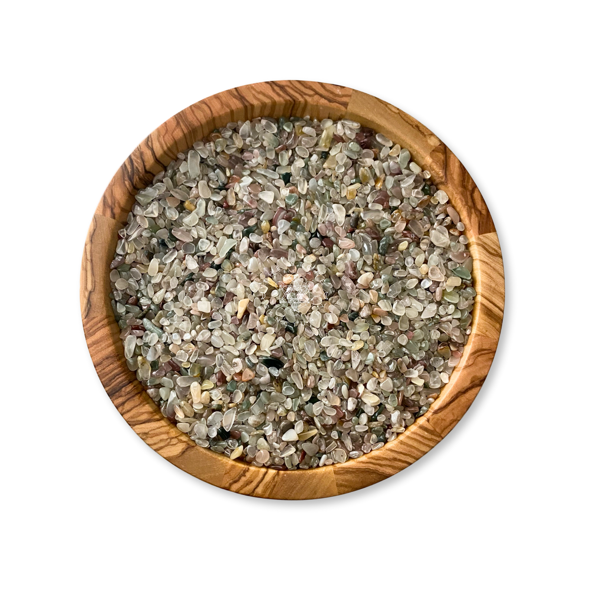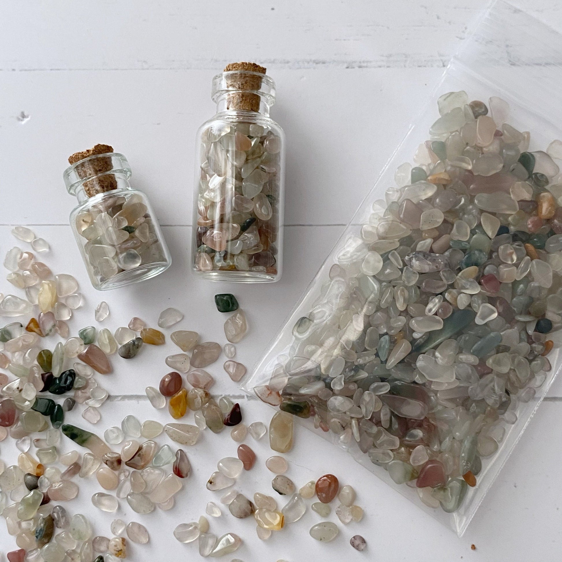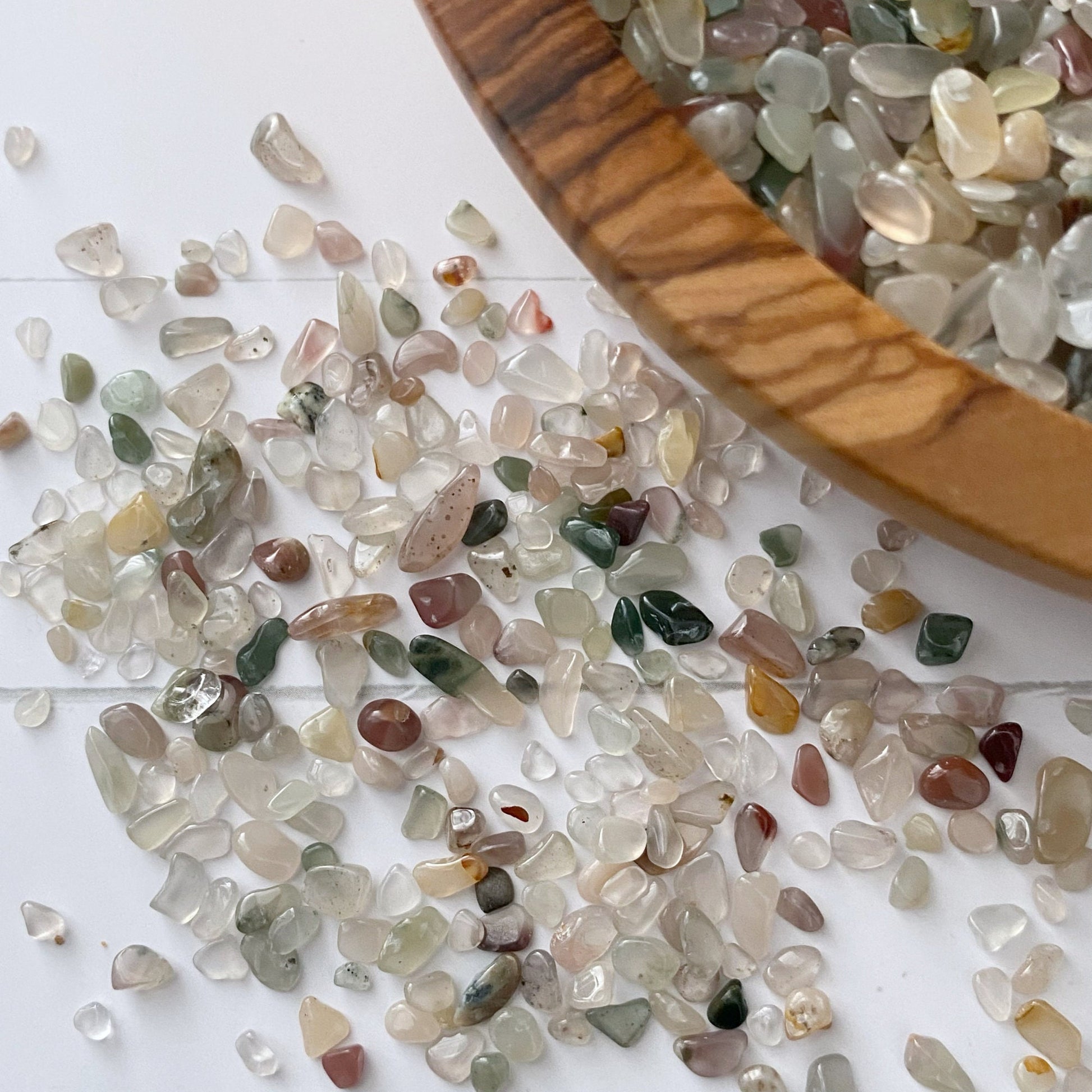 Mixed Agate Crystal Chips are tumbled and polished tiny stones. These mini stones are perfect for various creative and mystical endeavors. Whether you're into candle making, adding to your roller ball oils, crafting, or creating resin jewelry, these chips add a touch of natural energy to your projects. They're also ideal for spell jars, mojo bags, witch balls, orgone devices, and as sacred additions to your altar jars.