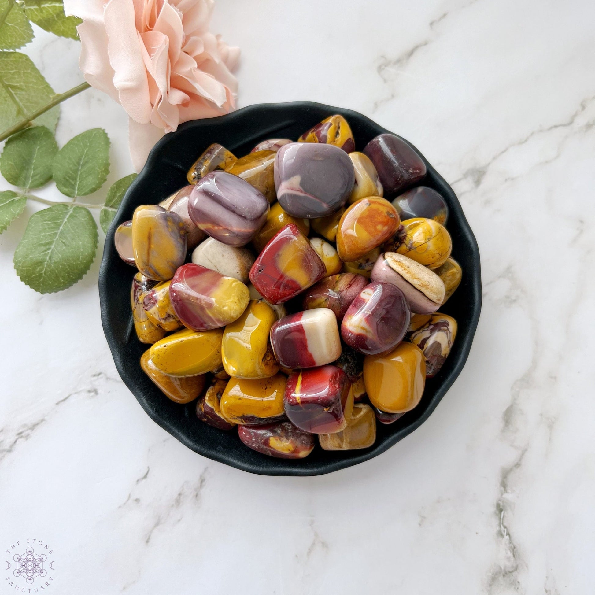 You will receive 1 Mookaite tumbled stone, intuitively chosen. If there is a particular color/colorway that appeals to you let me know in the comments and I will do my best to accommodate your choice.