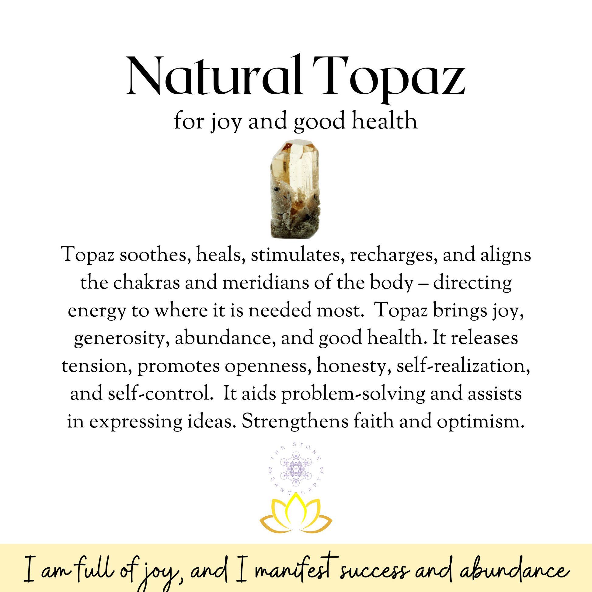 Topaz soothes, heals, stimulates, recharges, and aligns the chakras and meridians of the body – directing energy to where it is needed most. Topaz brings joy, generosity, abundance, and good health. It releases tension, promotes openness, honesty, self-realization, and self-control. It aids problem-solving and assists in expressing ideas. Strengthens faith and optimism.