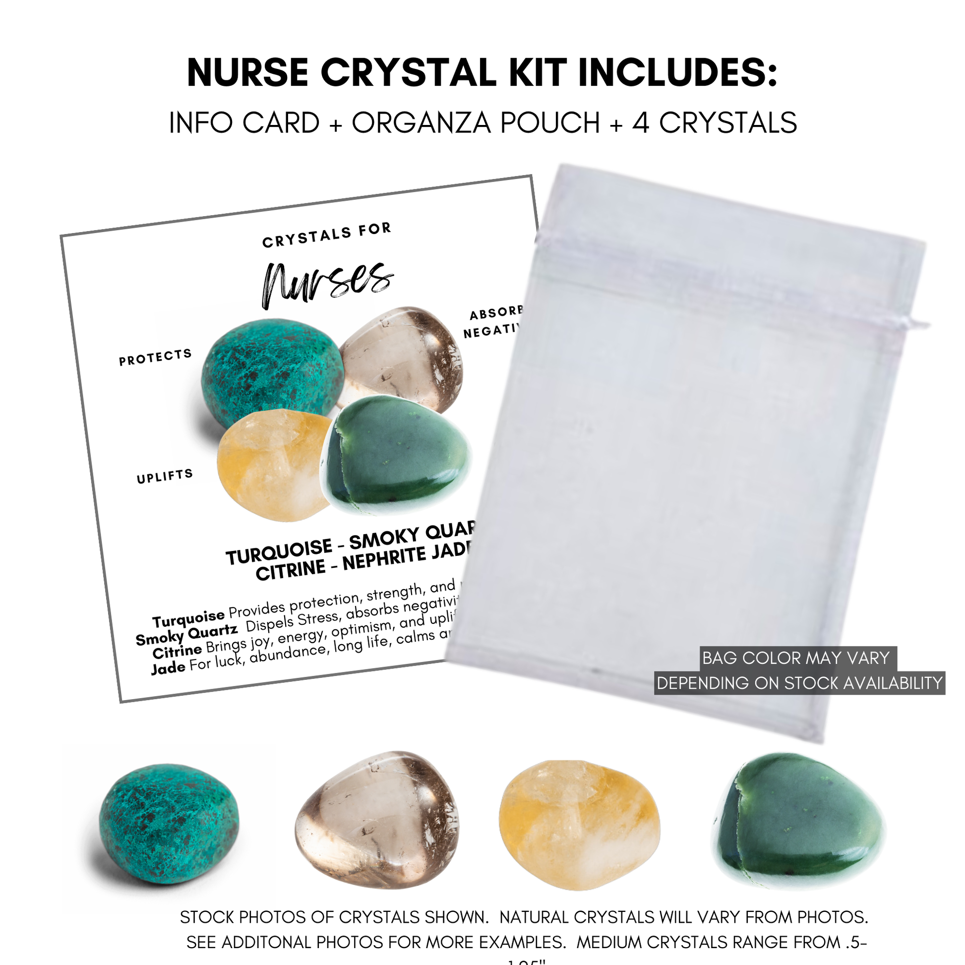 You will receive 1 Crystals for Nurses kit, which contains the information card, organza bag, and Set of 4 crystals. An optional gift box is also available.
