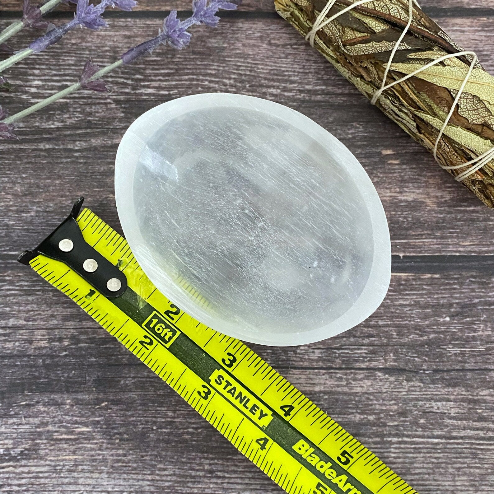 Measuring approximately 3.5-4 inches in length, 2 inches at its widest point, and 1 inch in height, this oval-shaped bowl is perfectly sized for charging and cleansing your cherished gemstones. Selenite, revered for its purifying properties, provides a gentle and effective means to revitalize and recharge your crystals, ensuring their energies remain vibrant.