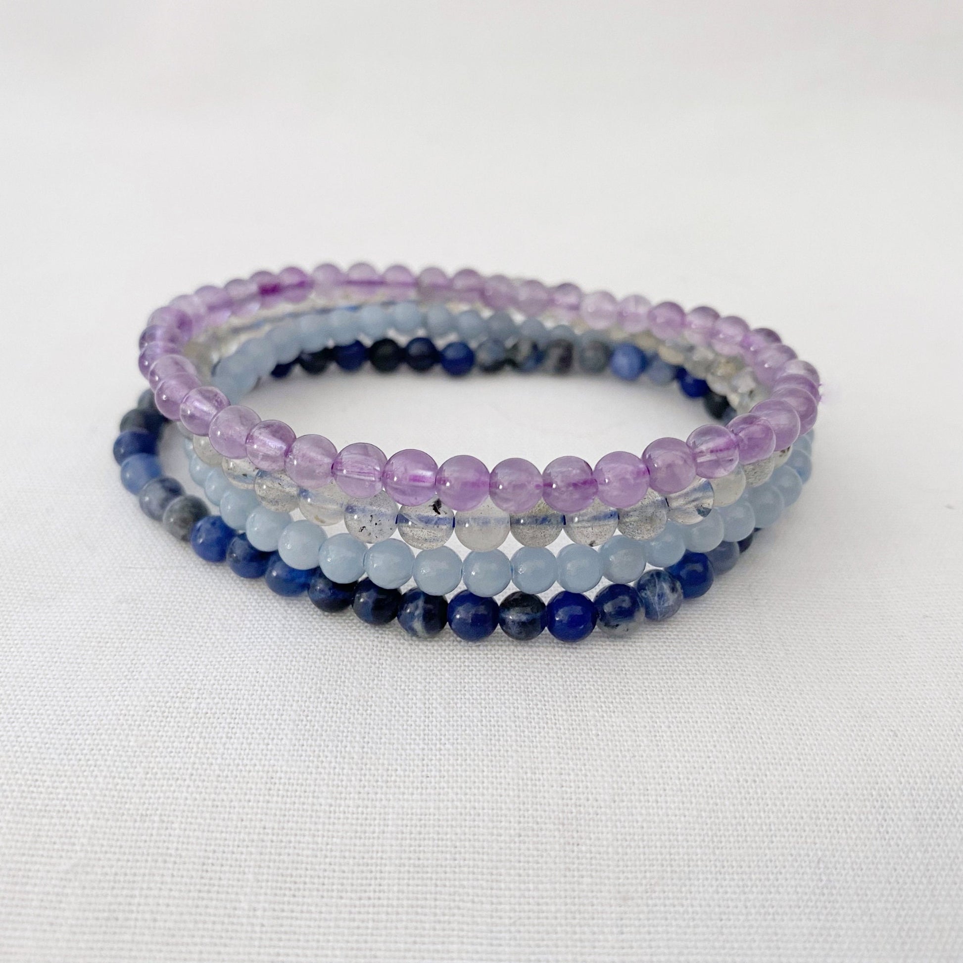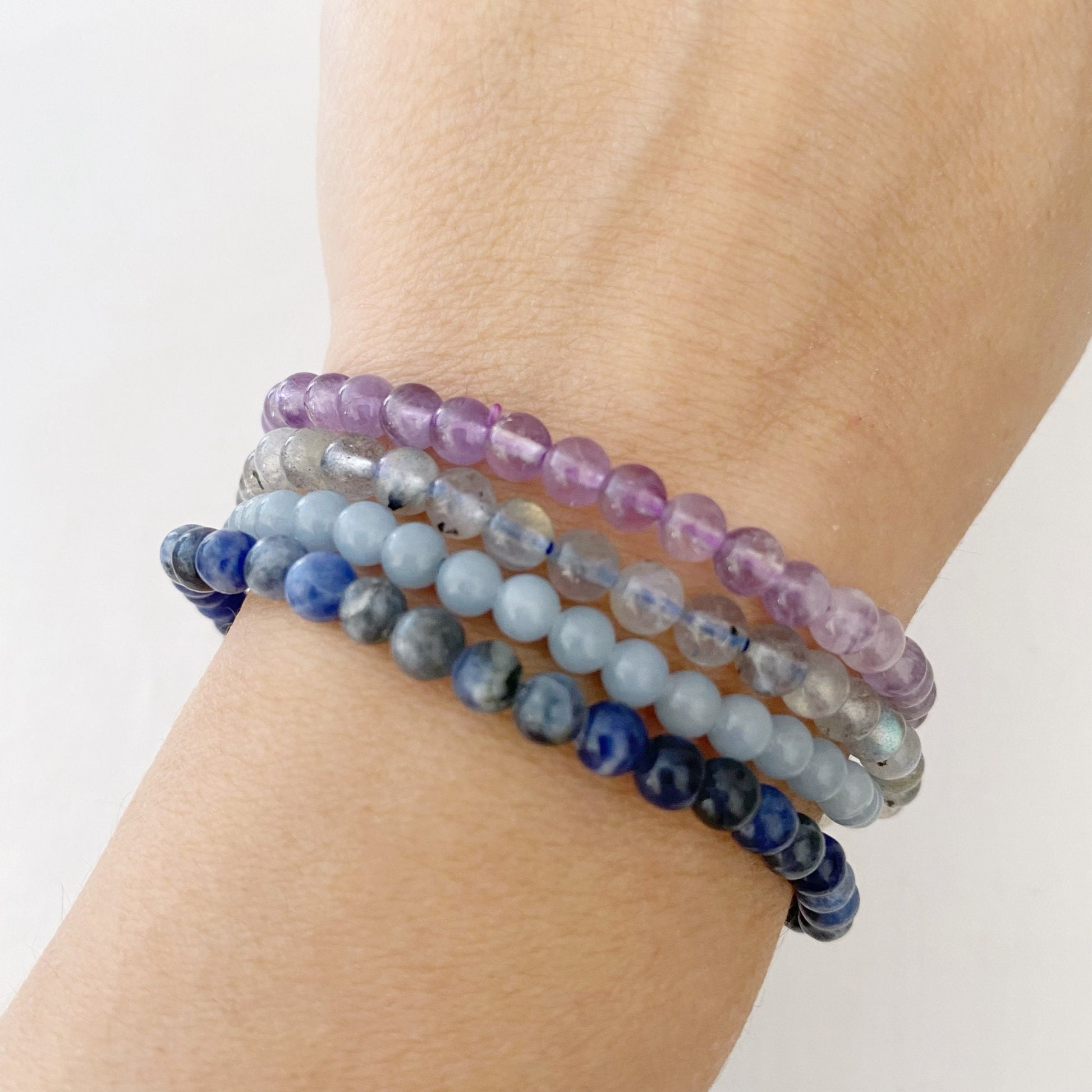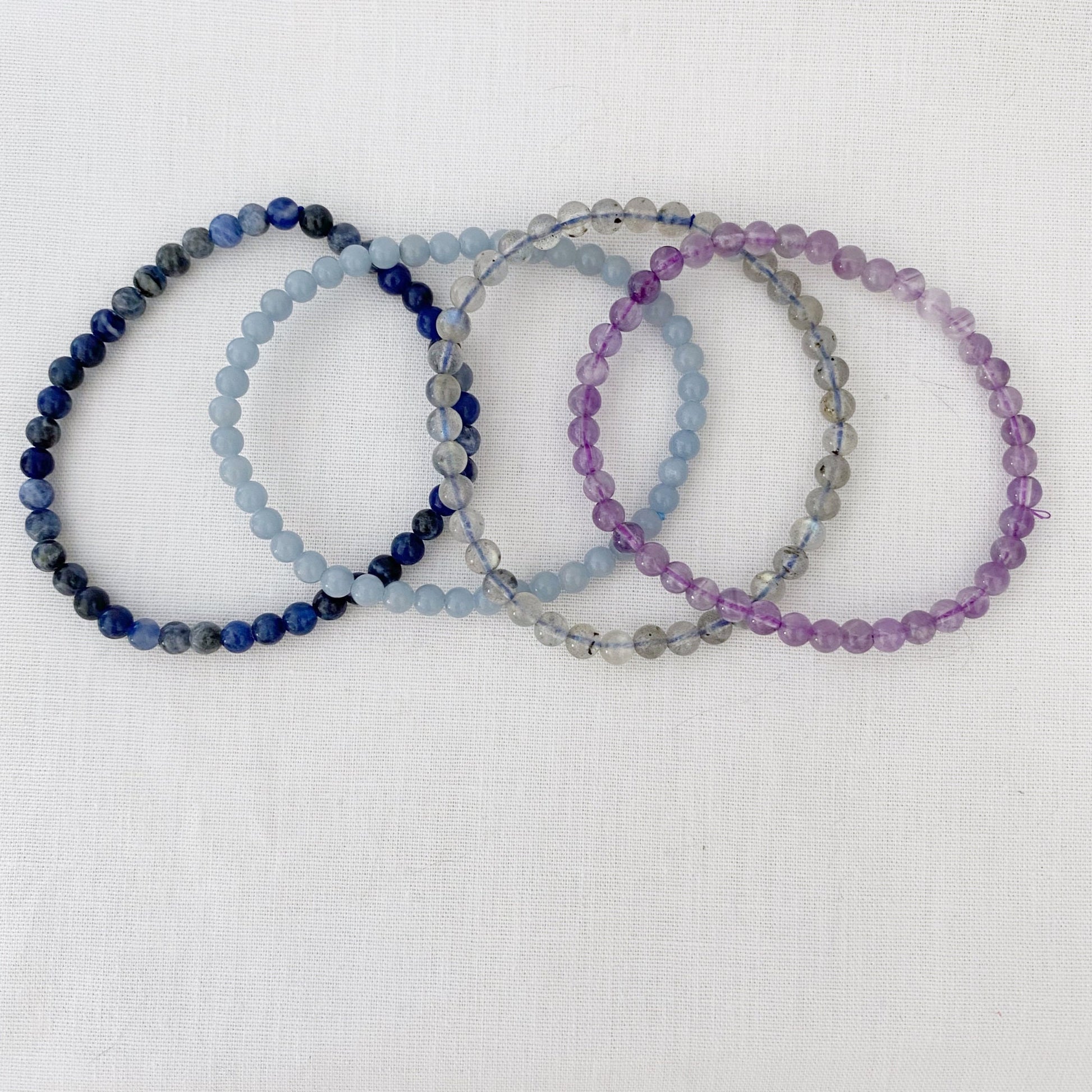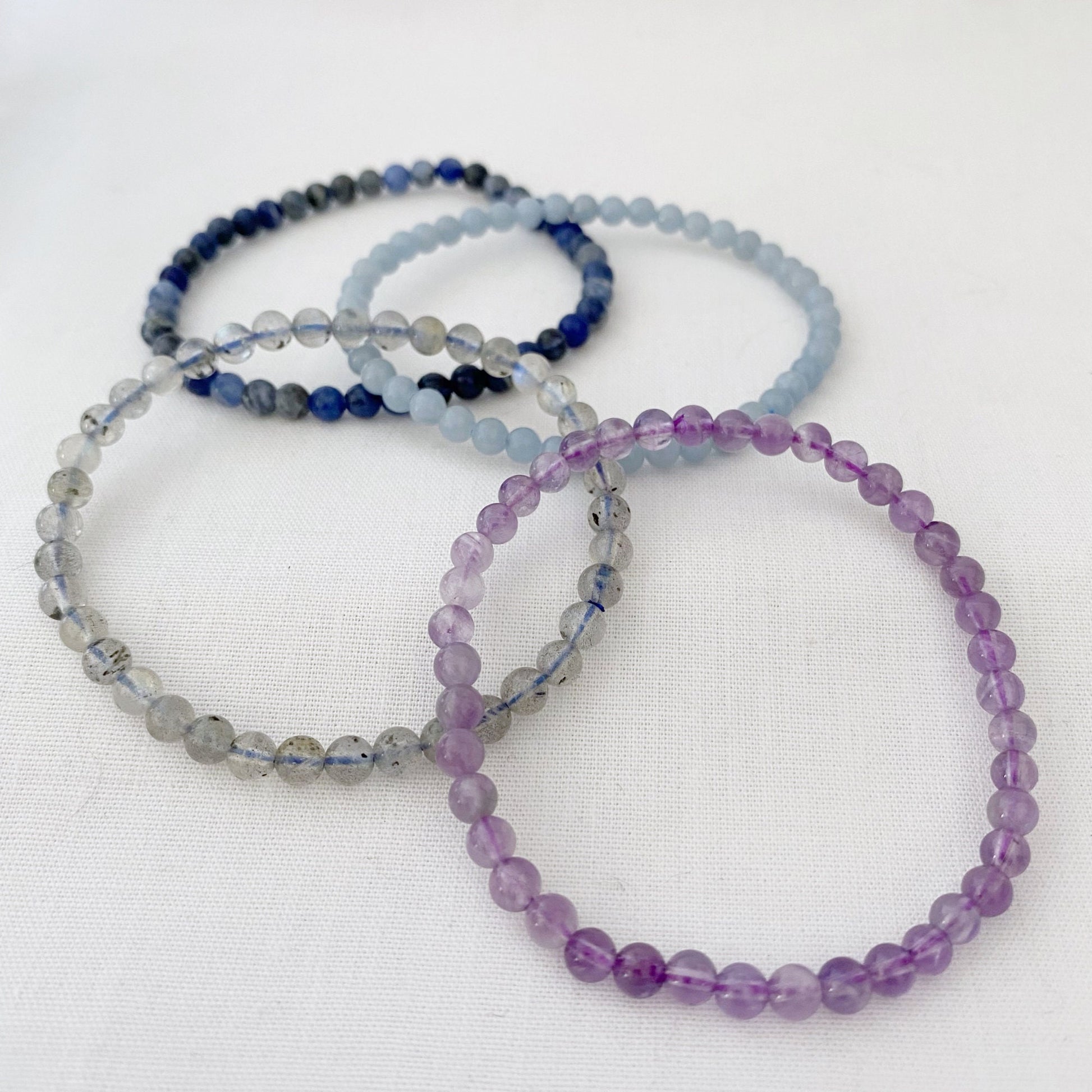 Includes one (1) each of the following: Amethyst - Labradorite - Aquamarine - Sodalite 4mm bead energy bracelets infused with Usui Reiki energy, love, and light. These fit-size S-M wrists.
