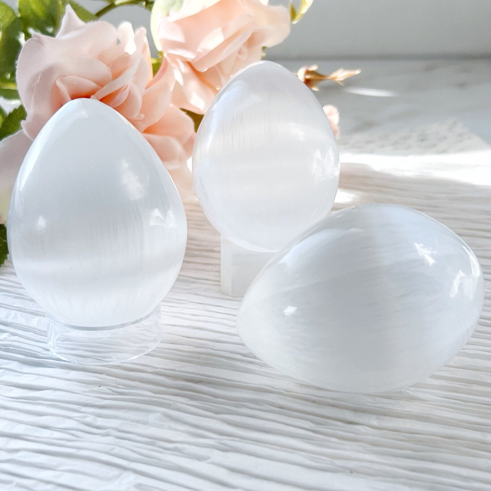 Discover our White Selenite Crystal Egg's serene beauty and calming energy, a unique addition to your crystal collection. Each order includes one intuitively chosen egg, standing approximately 2.5 inches tall, handcrafted from authentic Selenite.