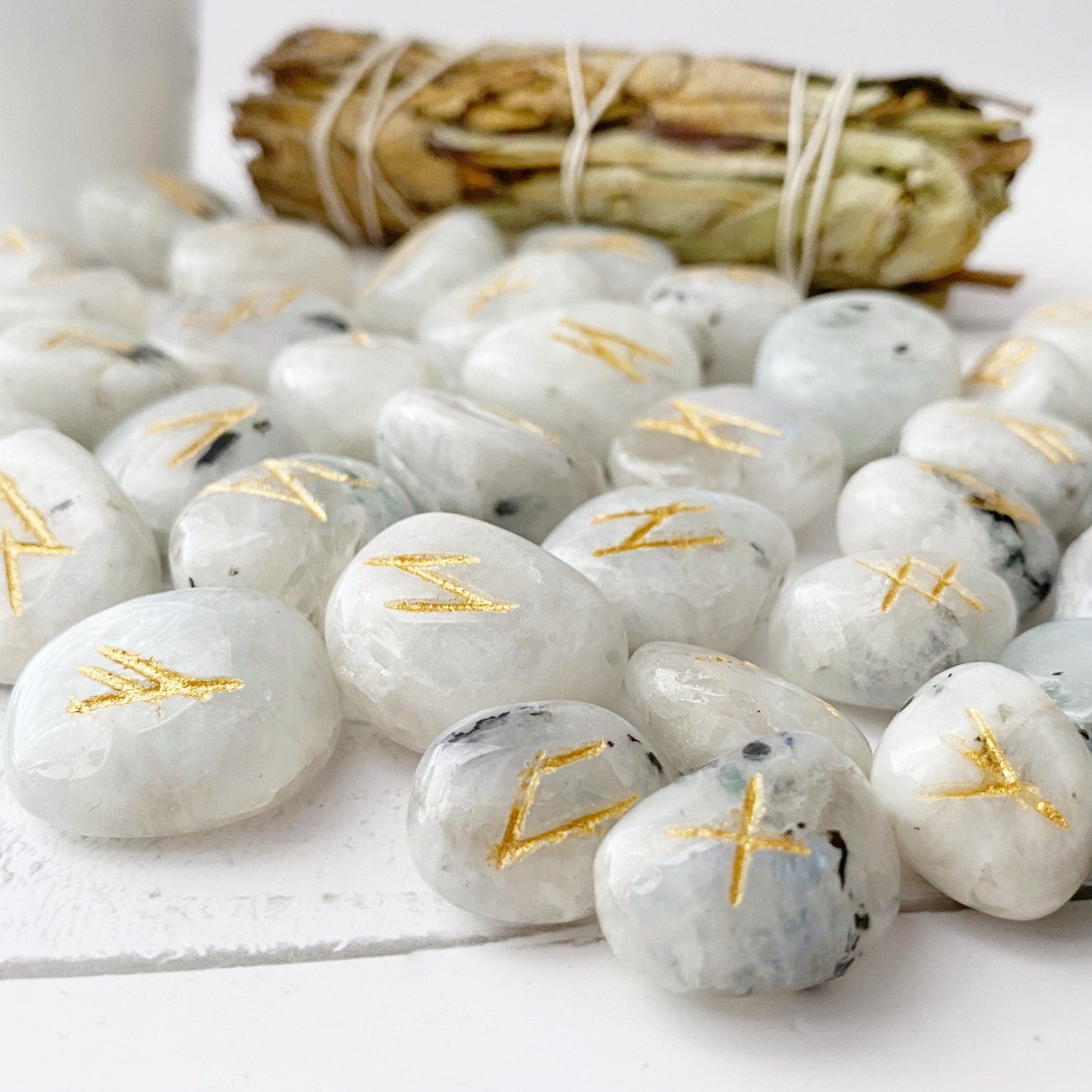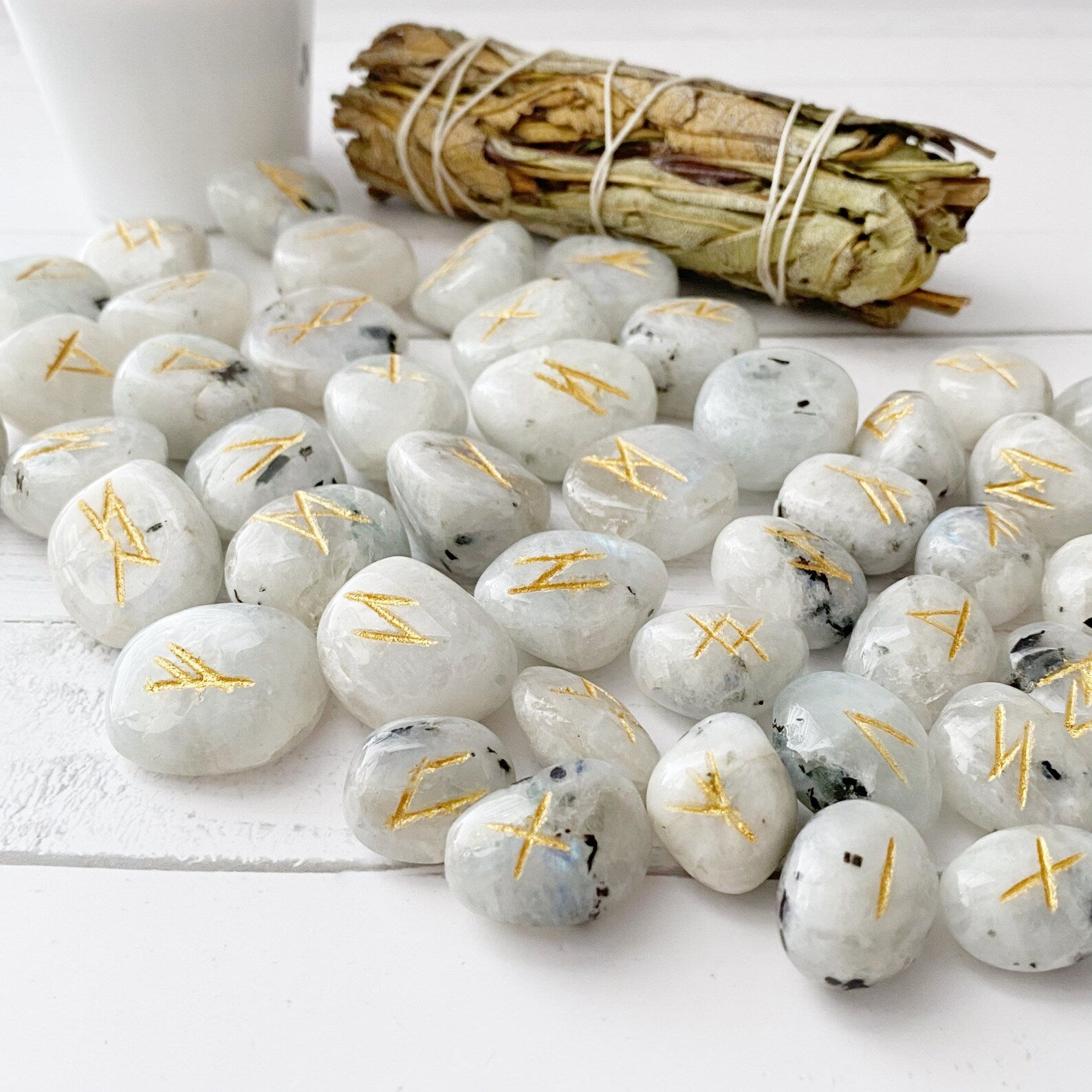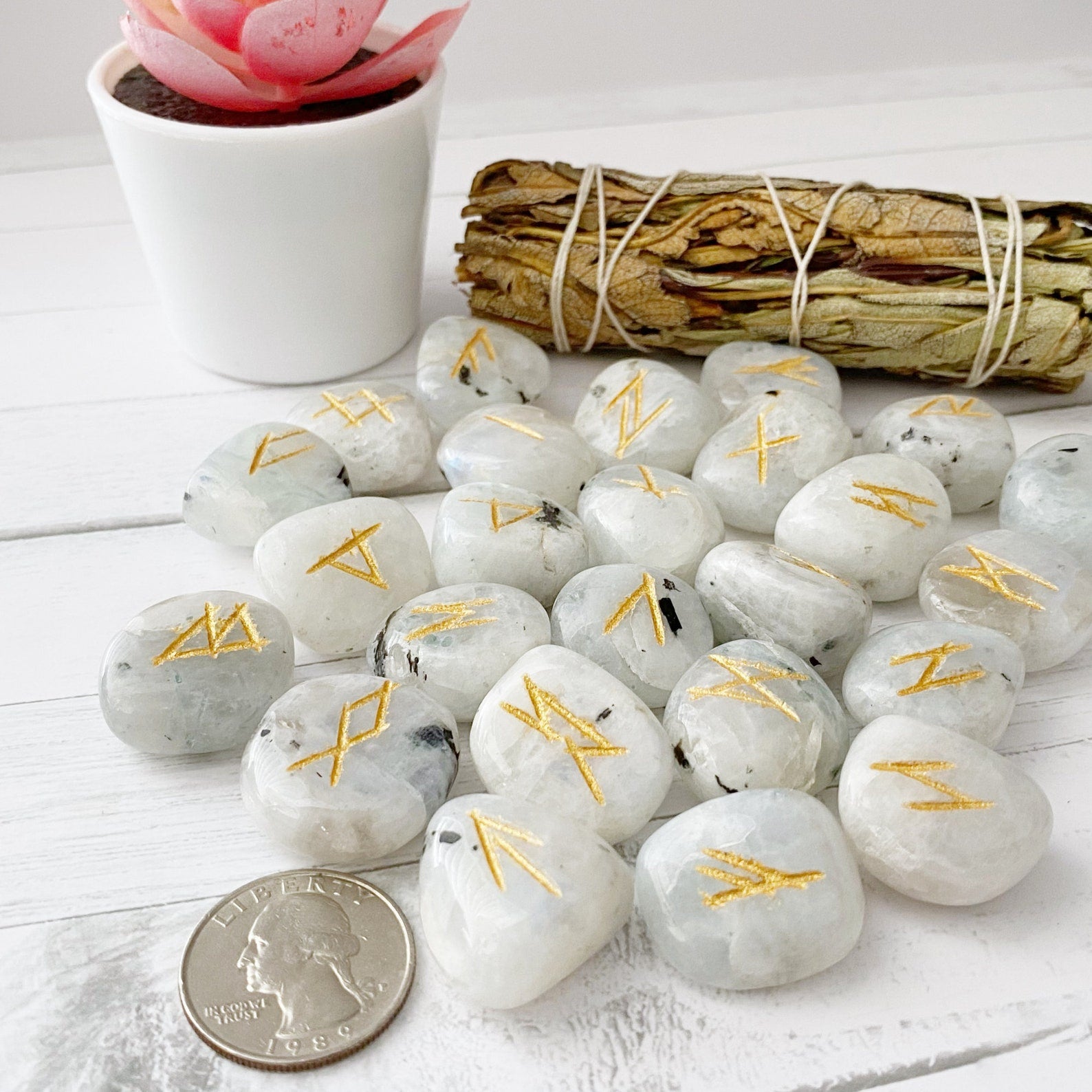Handcarved Genuine Rainbow Moonstone Tumbled Stones, featuring 25pc Elder Futhark Runes that are etched and filled with gold paint. Included is a velveteen drawstring storage pouch as well.
