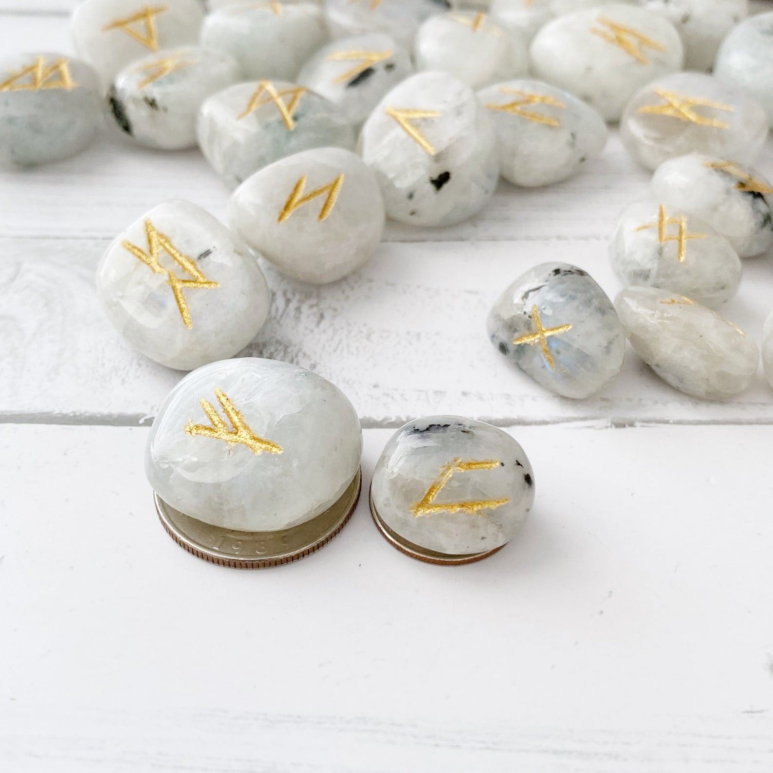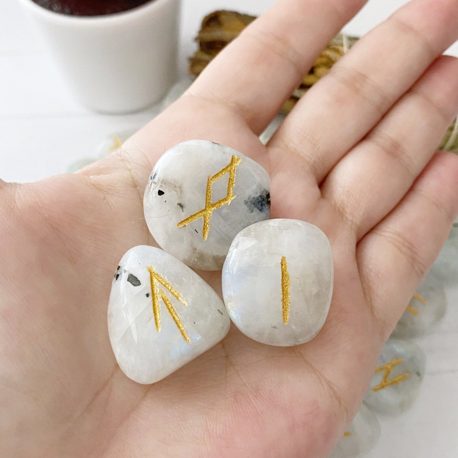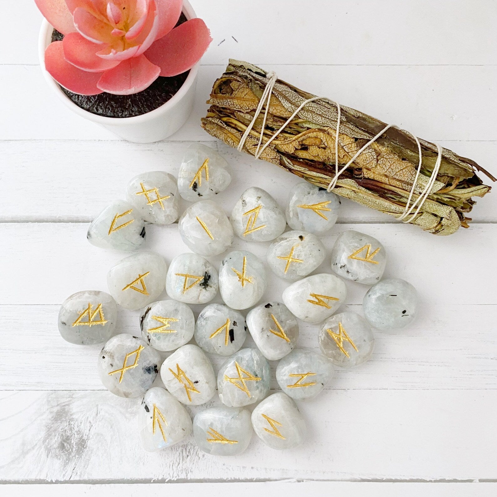 Handcarved Genuine Rainbow Moonstone Tumbled Stones, featuring 25pc Elder Futhark Runes that are etched and filled with gold paint. Included is a velveteen drawstring storage pouch as well.