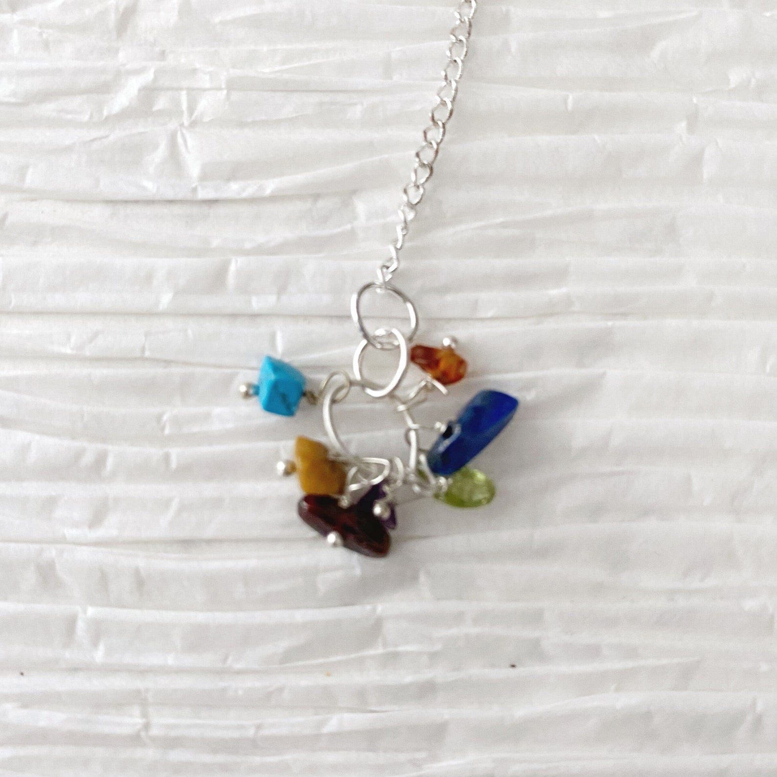The stones used to make the chakra chain are Amethyst, Iolite, Blue Aventurine, Dark Green Aventurine, Yellow Aventurine, Carnelian and Red Jasper.