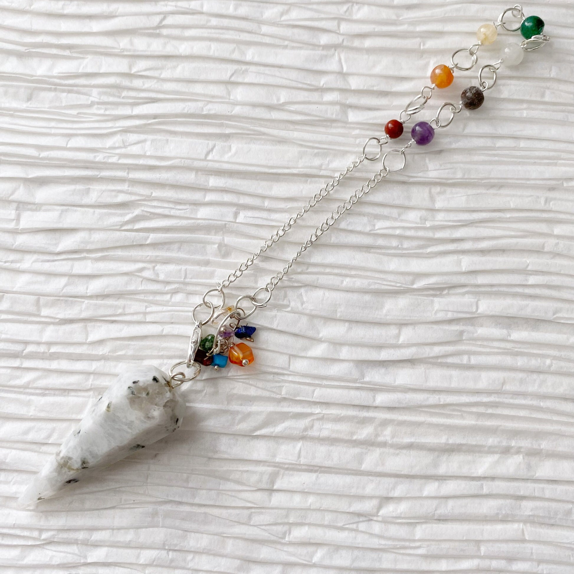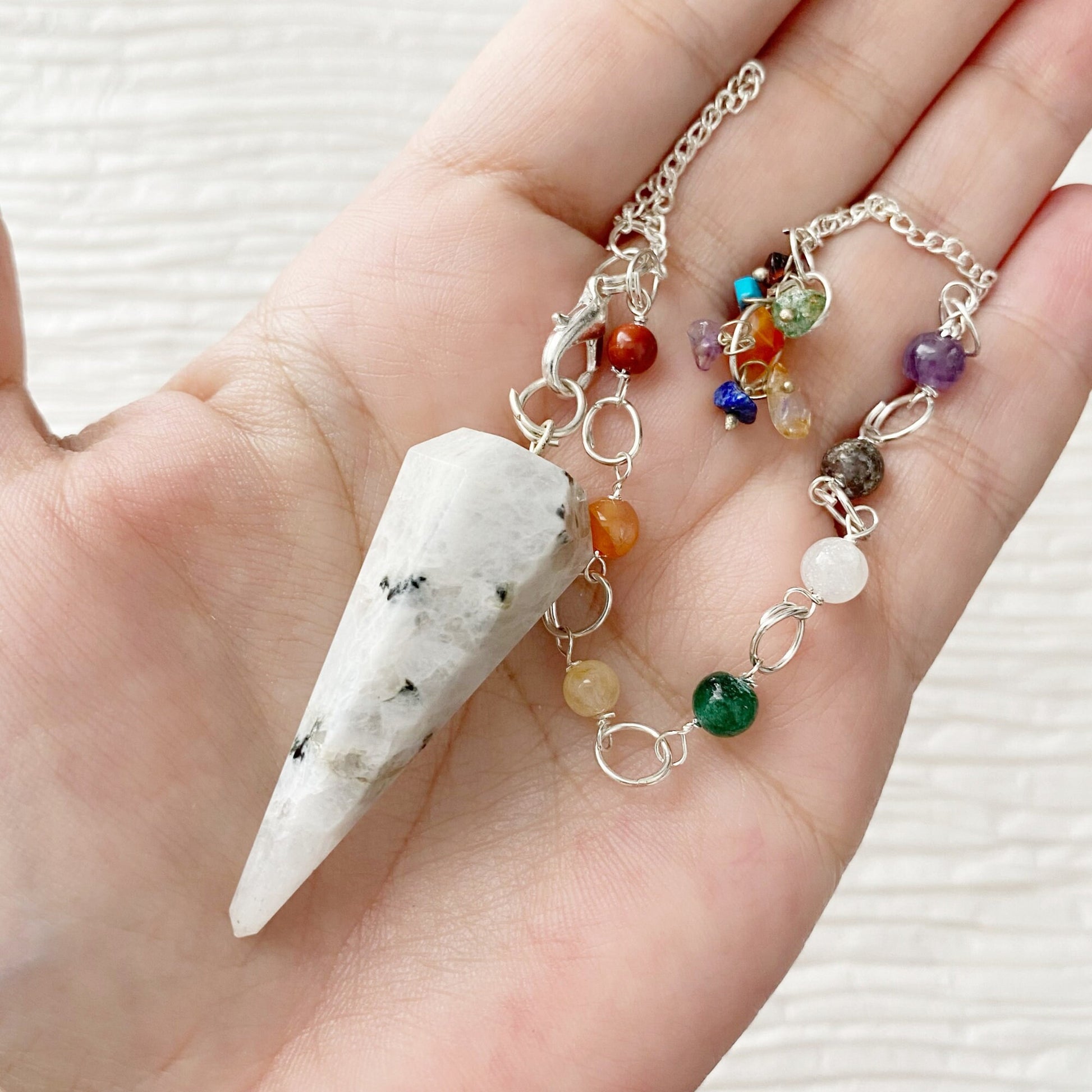 You will receive 1 (one) hexagonal (6 sided) Rainbow Moonstone Crystal Pendulum with silver Chakra crystal chain. This beautiful pendulum is made from Rainbow Moonstone (not guaranteed to have flash). The attached chain beadwork made with 7 chakra crystals and a chakra chip charm at the end to ensure slip free handling.