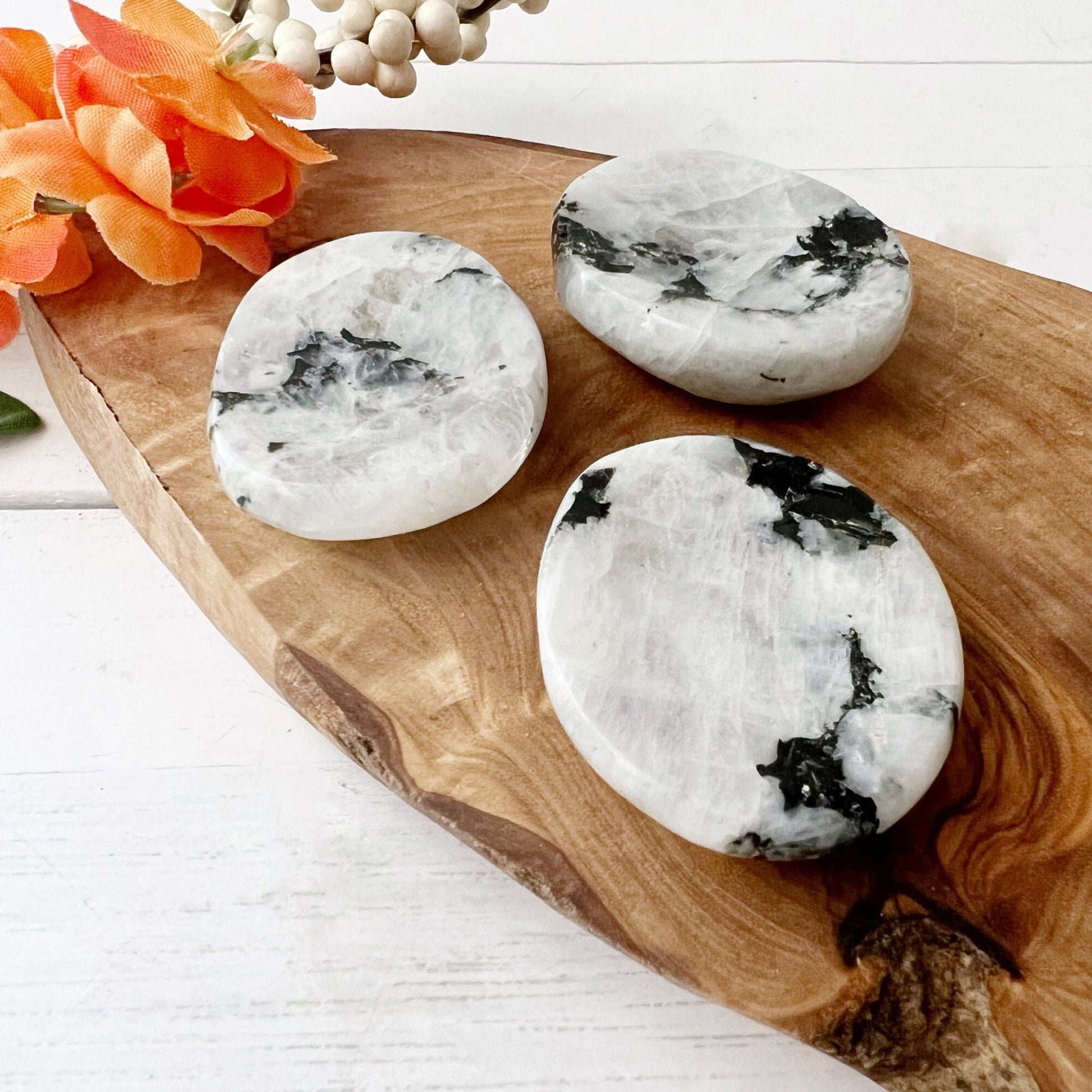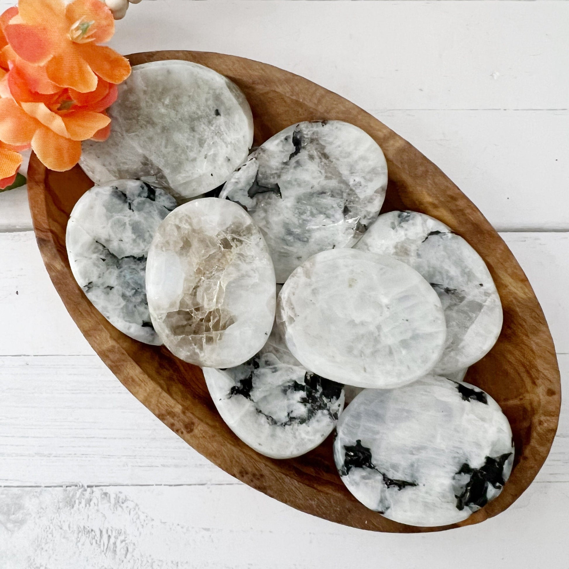 You will receive 1 hand-polished Rainbow Moonstone worry stone, intuitively chosen, which ranges from 1.5-1.75" in length.