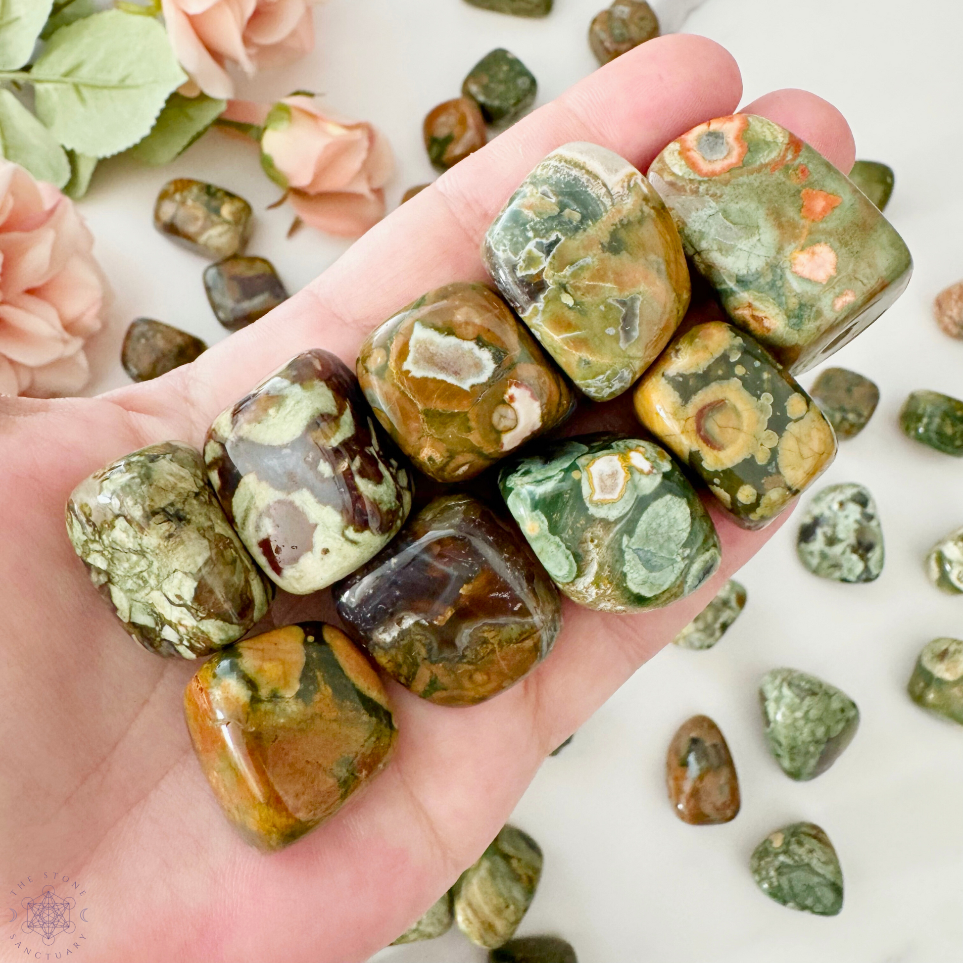 Rainforest Jasper is also known as Rhyolite which helps one better understand themselves and the complex universe around them. Energies full of strength, endurance, drive, and transformation flow from this stone, just like the magma that once created this volcanic rock. This flow helps one balance their polarities and realign your chakra column. As this is occurring, one's emotional and mental state will slowly change due to the foreign presence moving into your “core”. As you build a deeper connection with the energies being channeled through you, you may find comfort in absorbing and releasing the blockages that are built up within your soul. These emotions can stem from past traumas or fear for what's to come. As one is unable to reverse the past or control the future, they must live in the now.