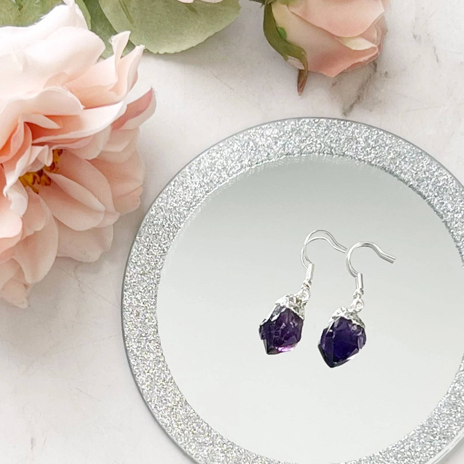 These earrings are elegantly finished with silver caps and secure stainless steel ear wires, blending rustic allure with a touch of sophistication. The Amethyst points range in size from .65-75" inches, making them a perfect statement piece that's neither too subtle nor overpowering. Elevate your style with these crystal amethyst earrings, where natural beauty meets elegant design