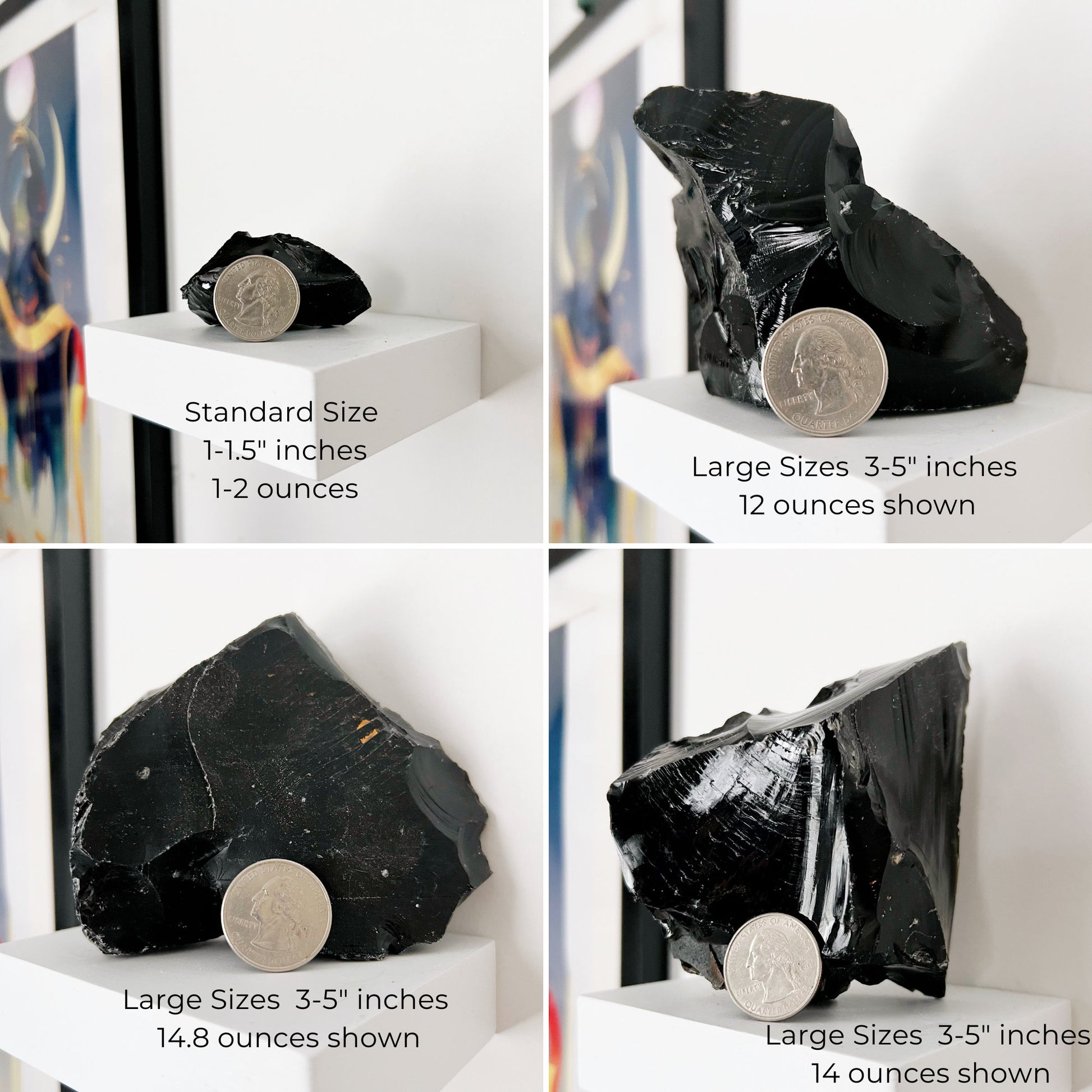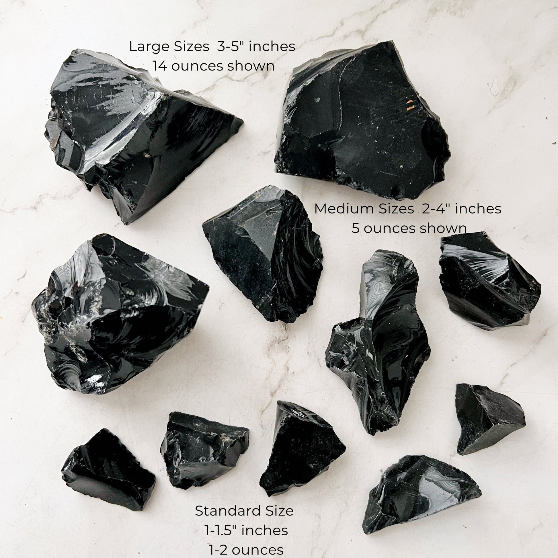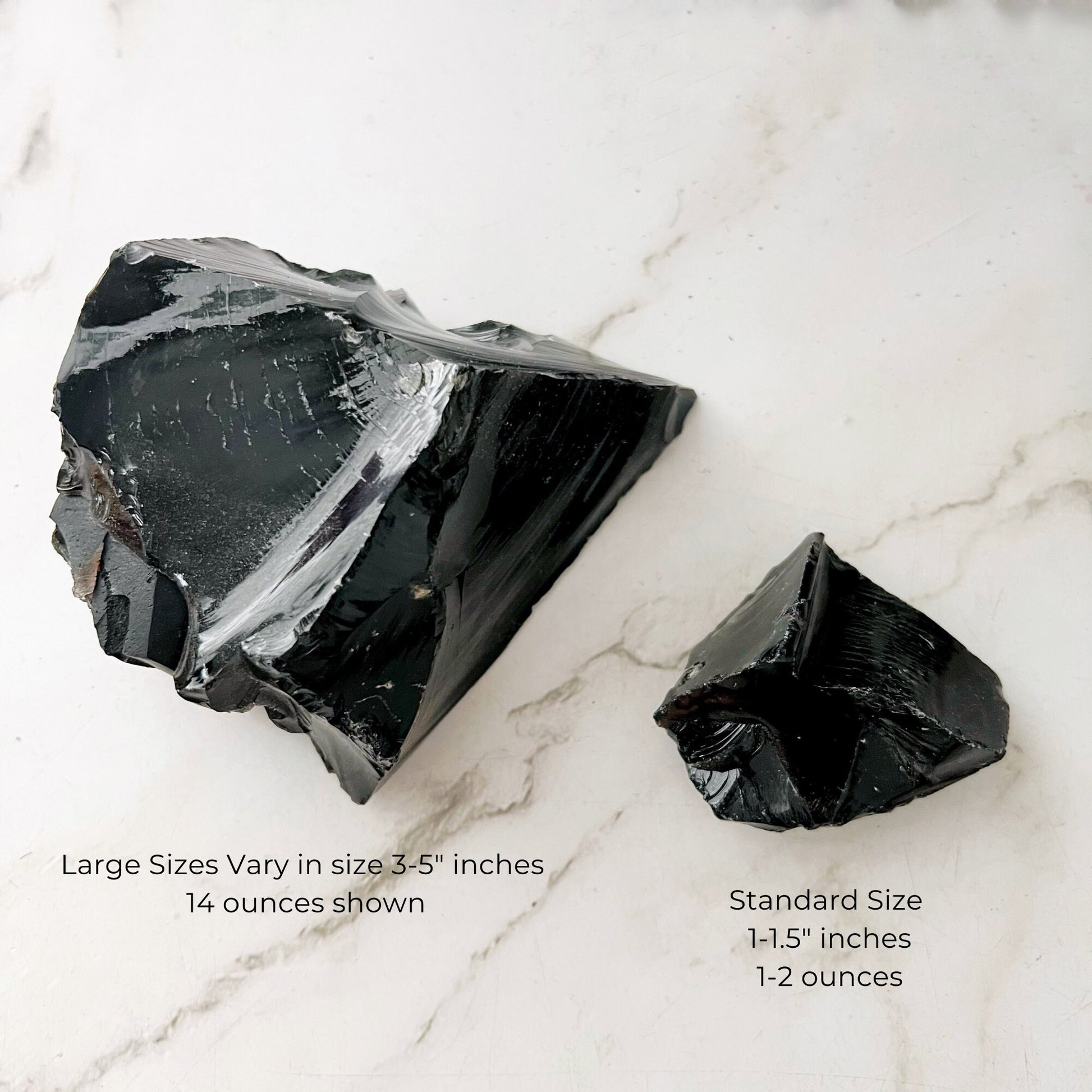 Dive deep into the captivating realm of our raw Black Obsidian crystals. Hailing from volcanic origins, these rough pieces resonate with an energy as intense as their formation. Offered in sizes from a delicate 1-2" (1-2 ounces), 2-3" (4-8 ounces) to a more substantial 3-5" (up to a pound!), our collection caters to your unique desires.