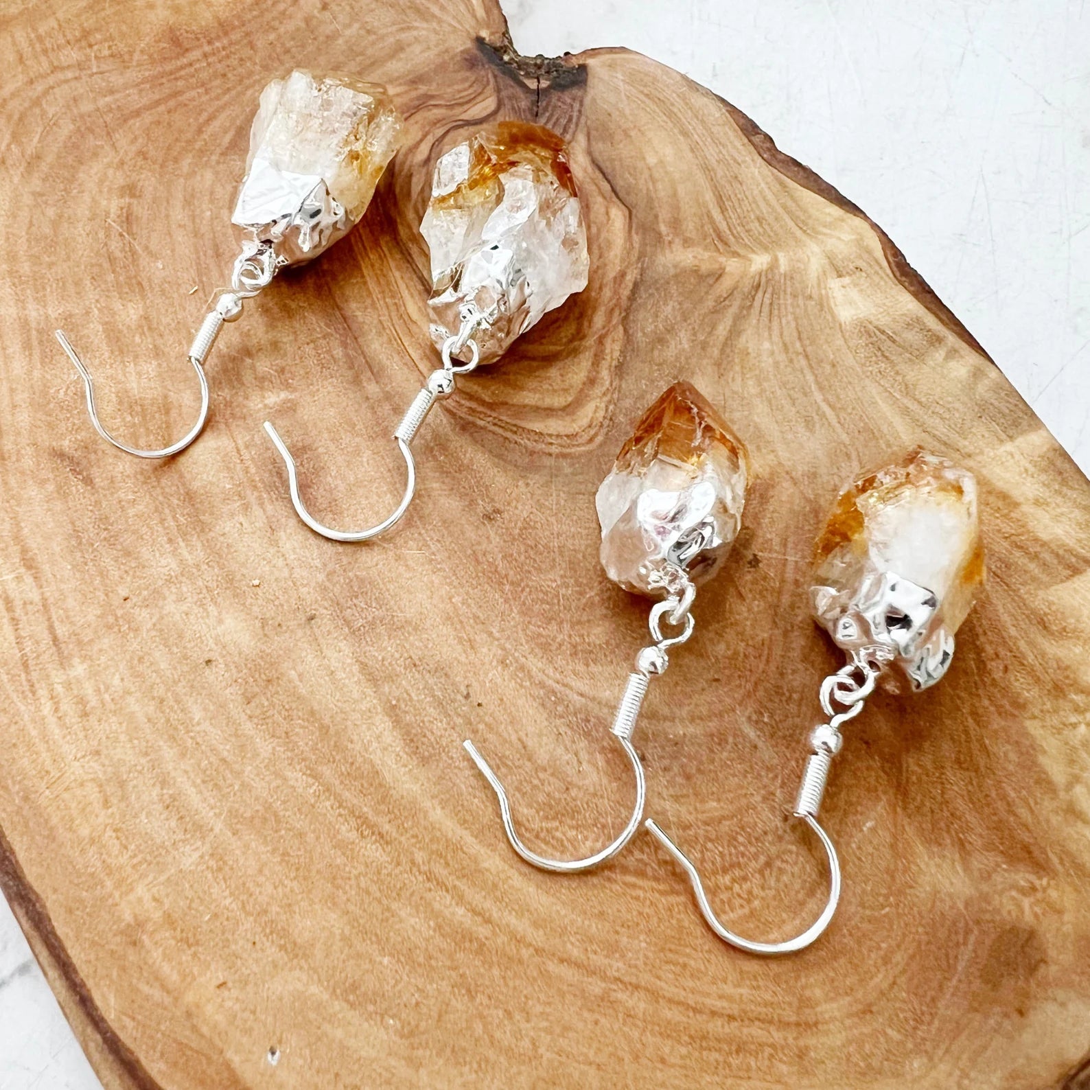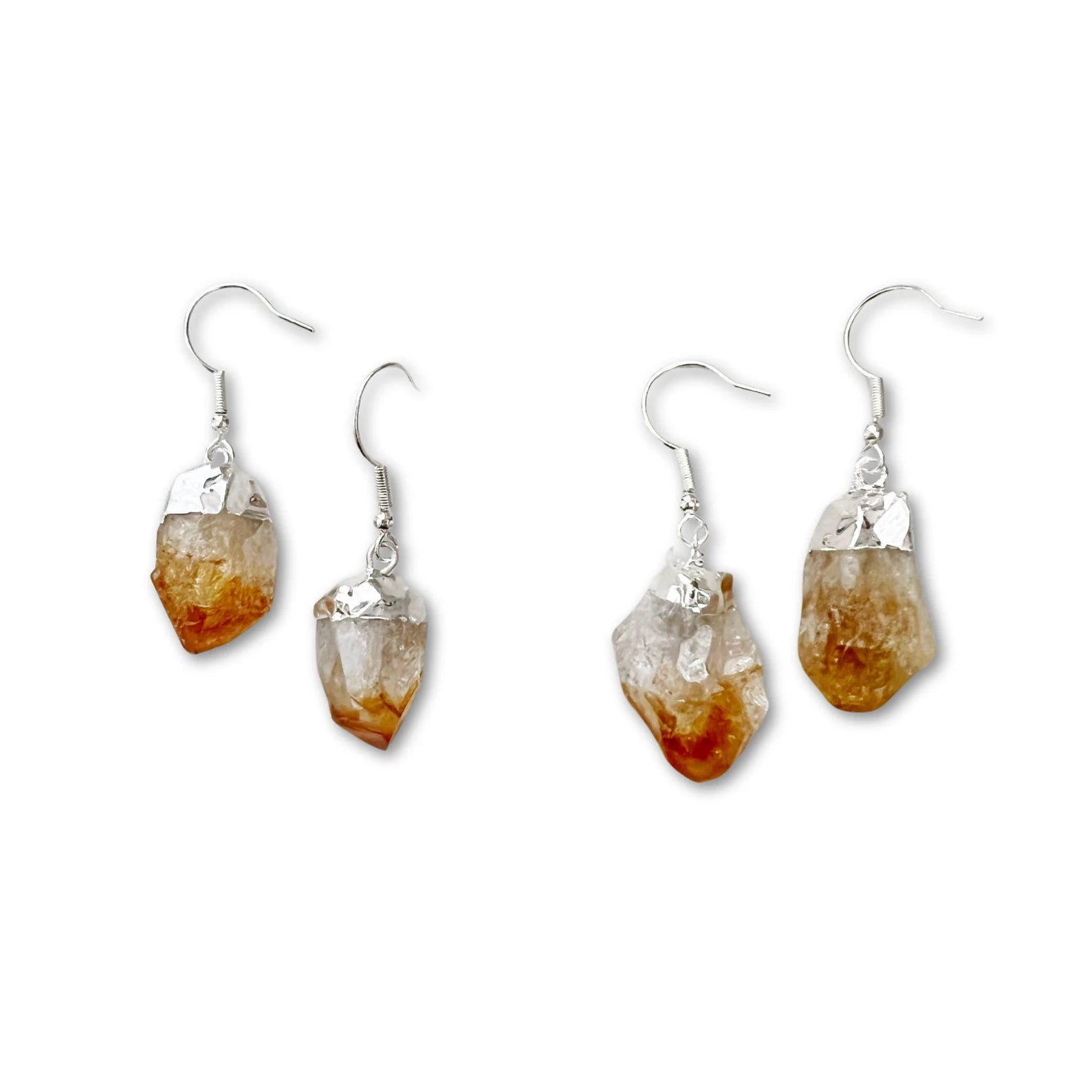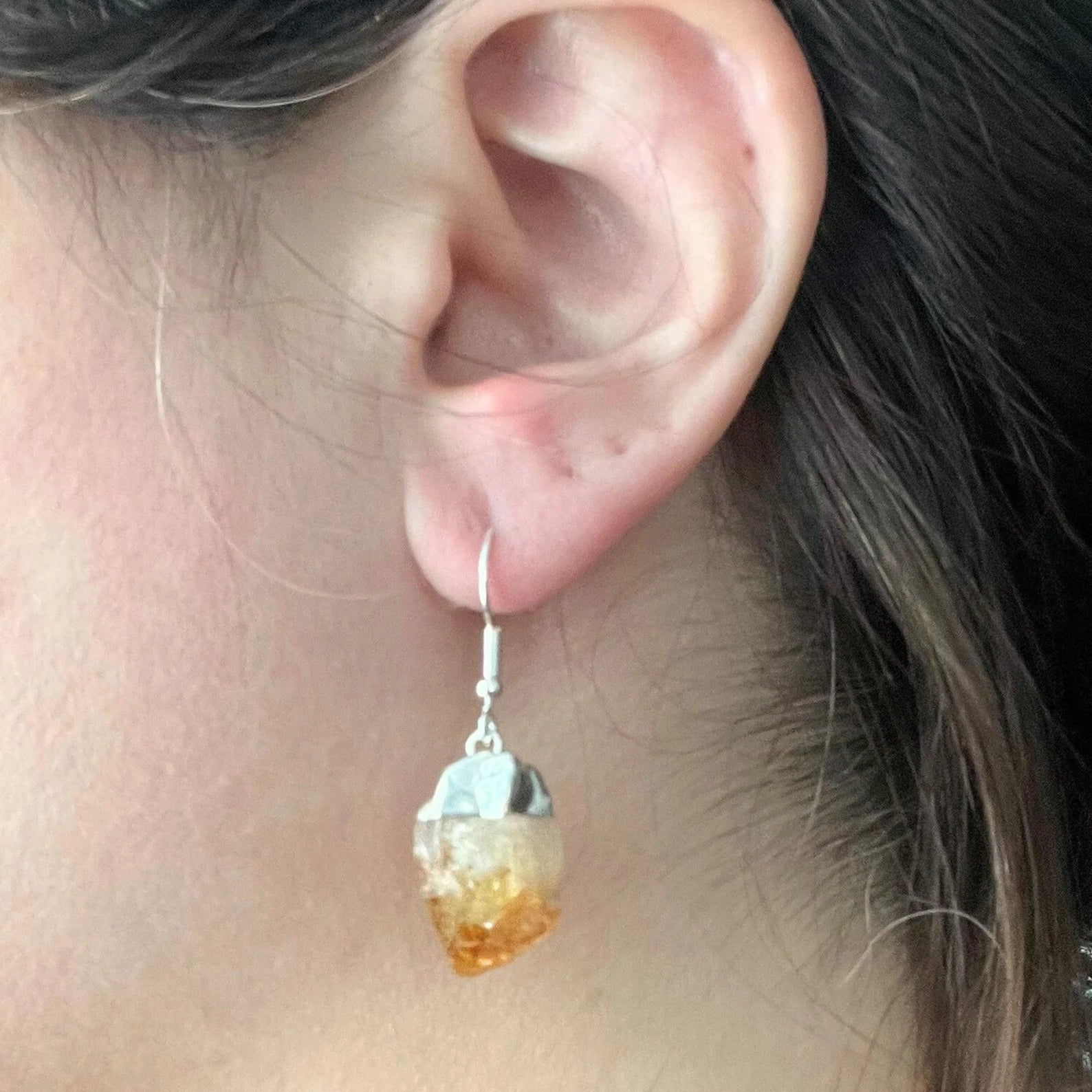 Embrace the raw beauty of nature with a pair of unpolished yellow Citrine point dangle earrings. Each earring features an unfinished, raw citrine point, offering a unique, earthy charm. While they will be closely matched in color, size, and shape, their natural origins ensure that no two are exactly alike, celebrating their unique individuality.