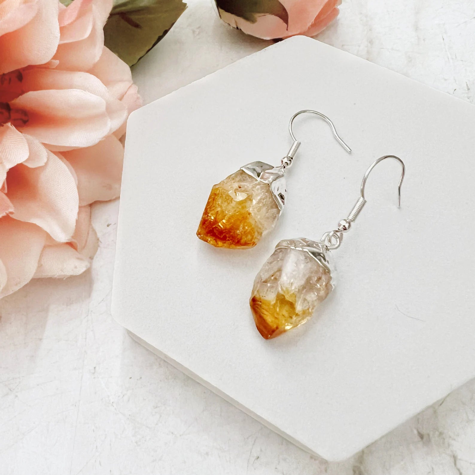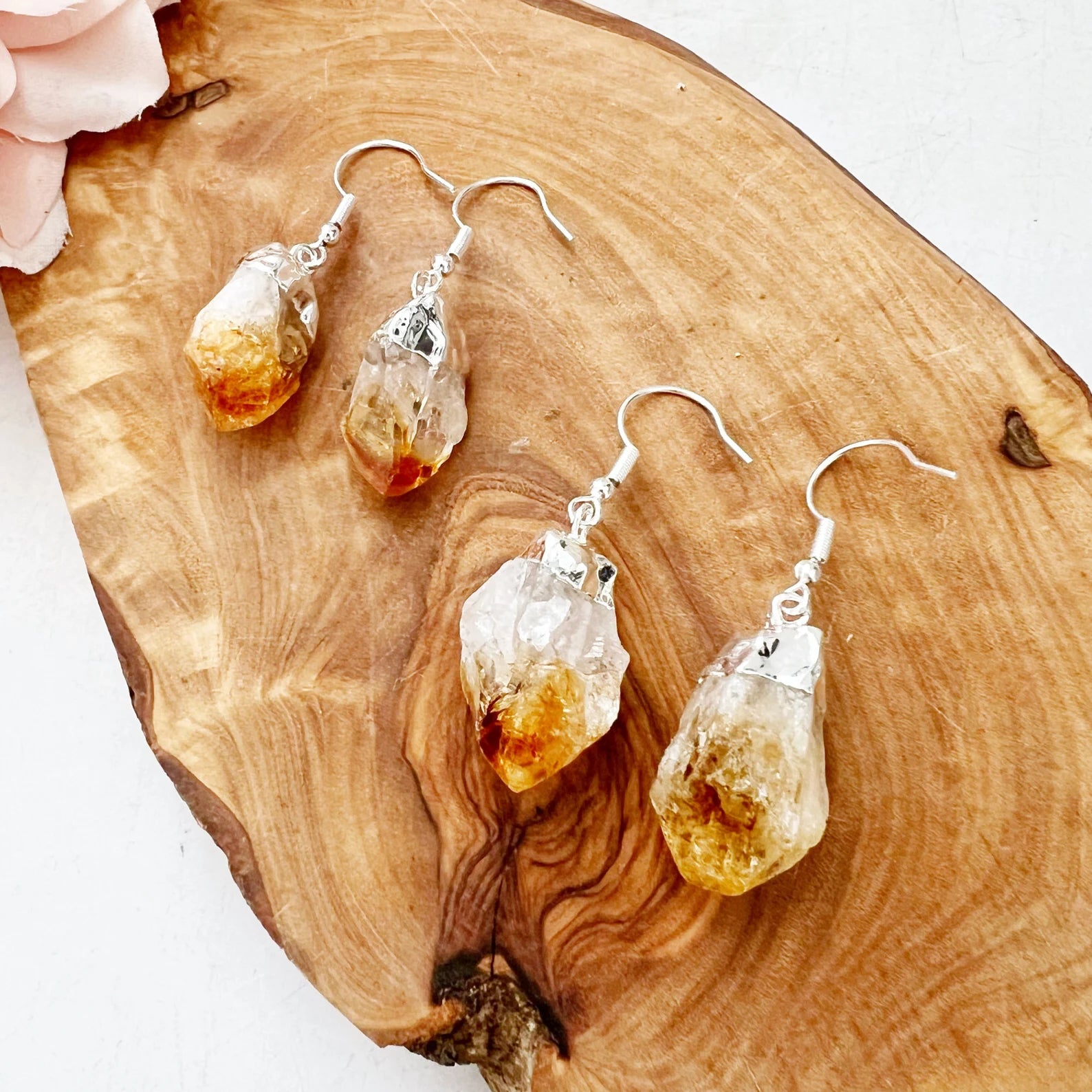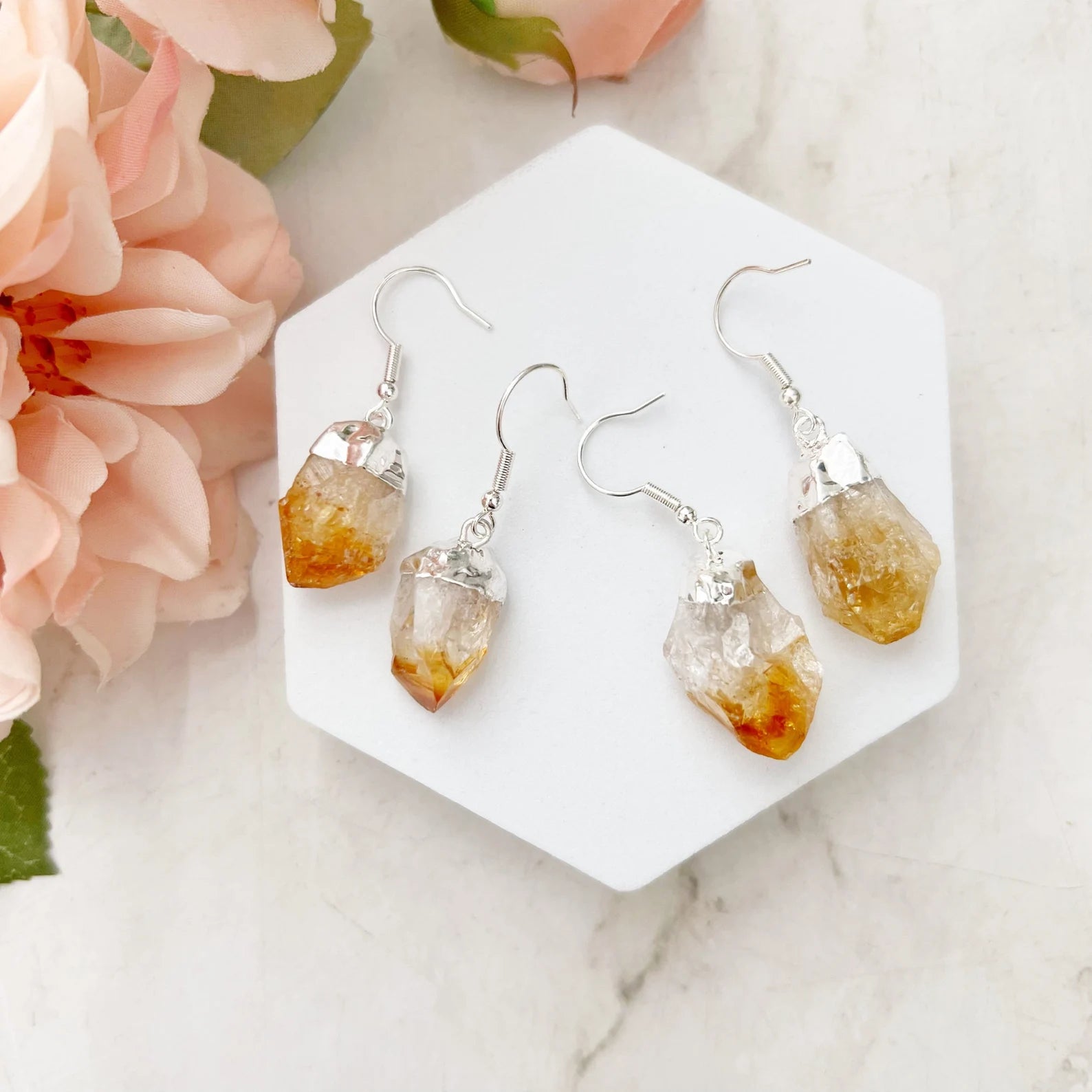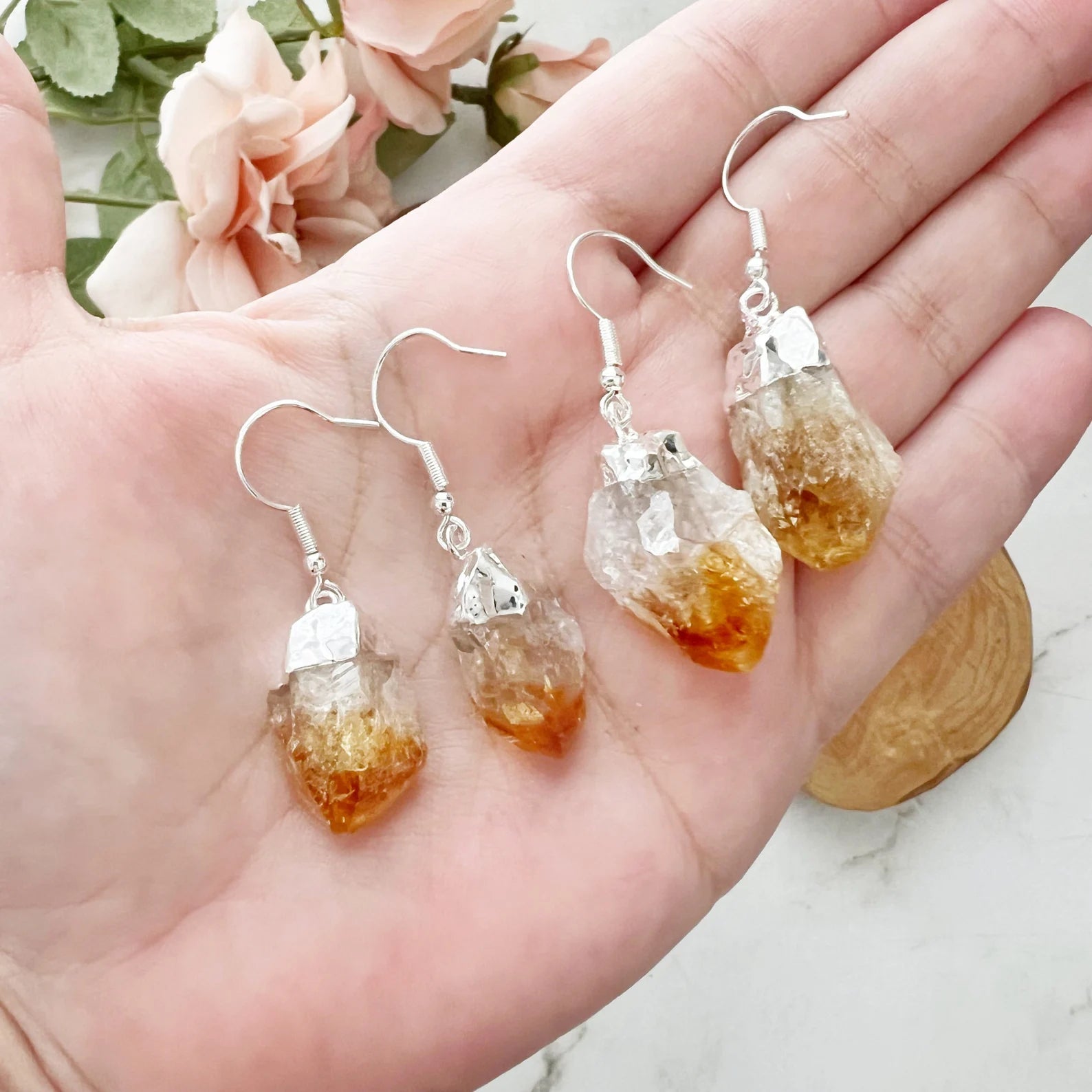 Embrace the raw beauty of nature with a pair of unpolished yellow Citrine point dangle earrings. Each earring features an unfinished, raw citrine point, offering a unique, earthy charm. While they will be closely matched in color, size, and shape, their natural origins ensure that no two are exactly alike, celebrating their unique individuality.