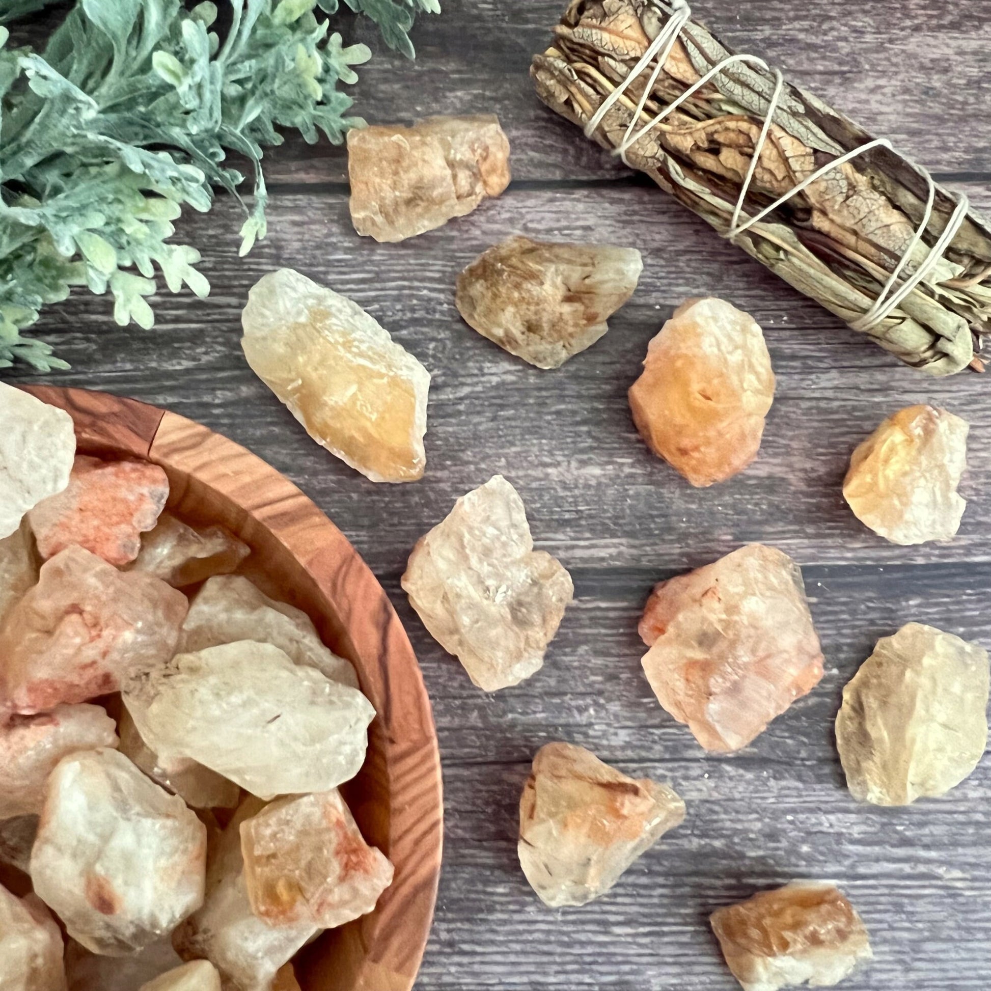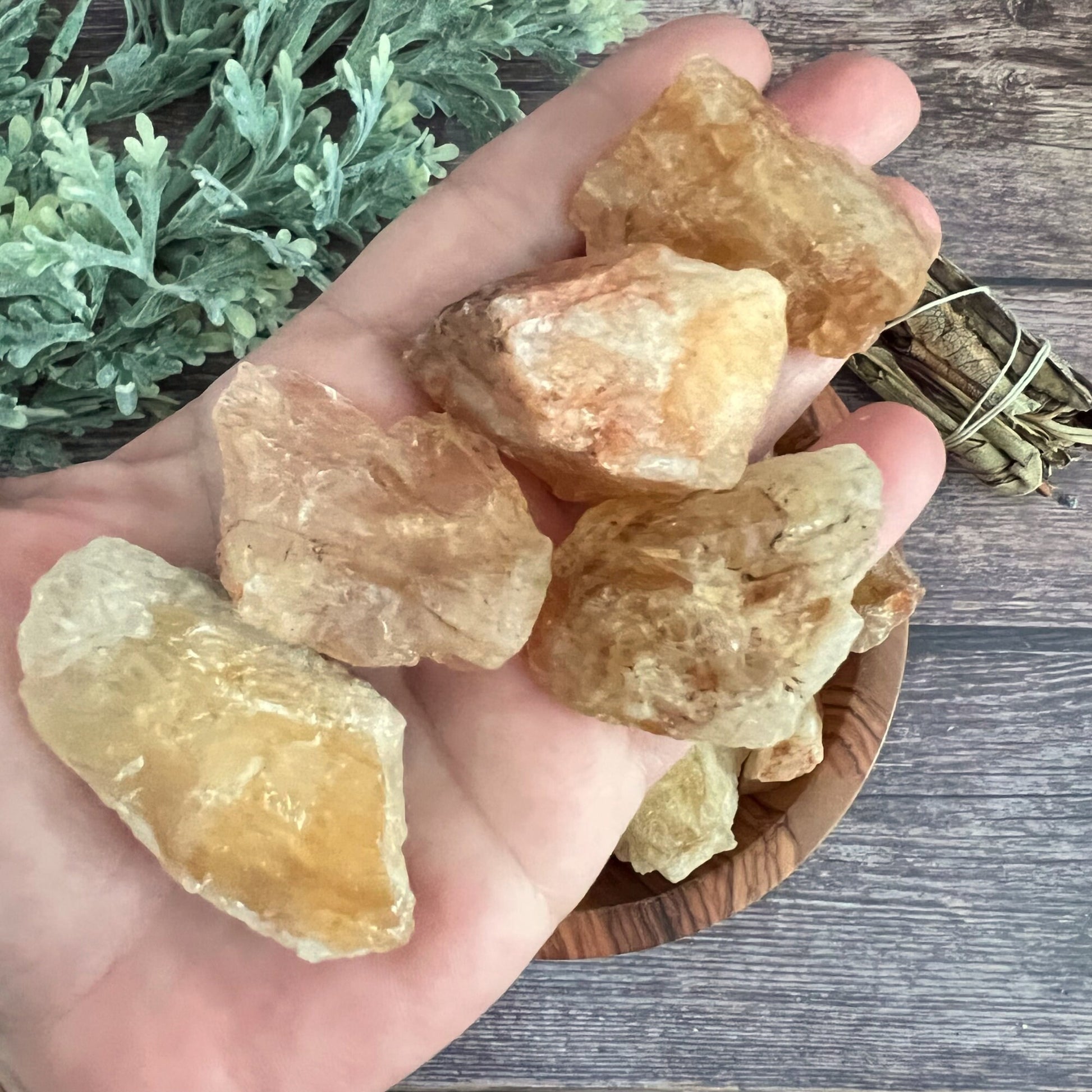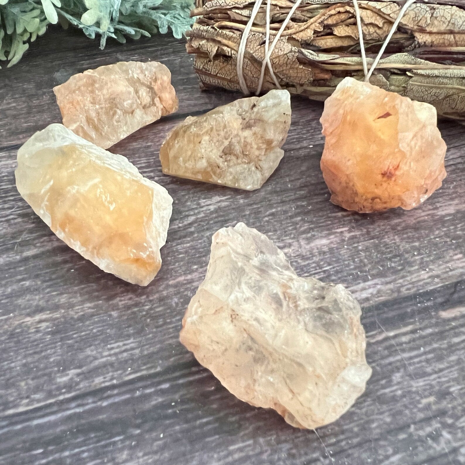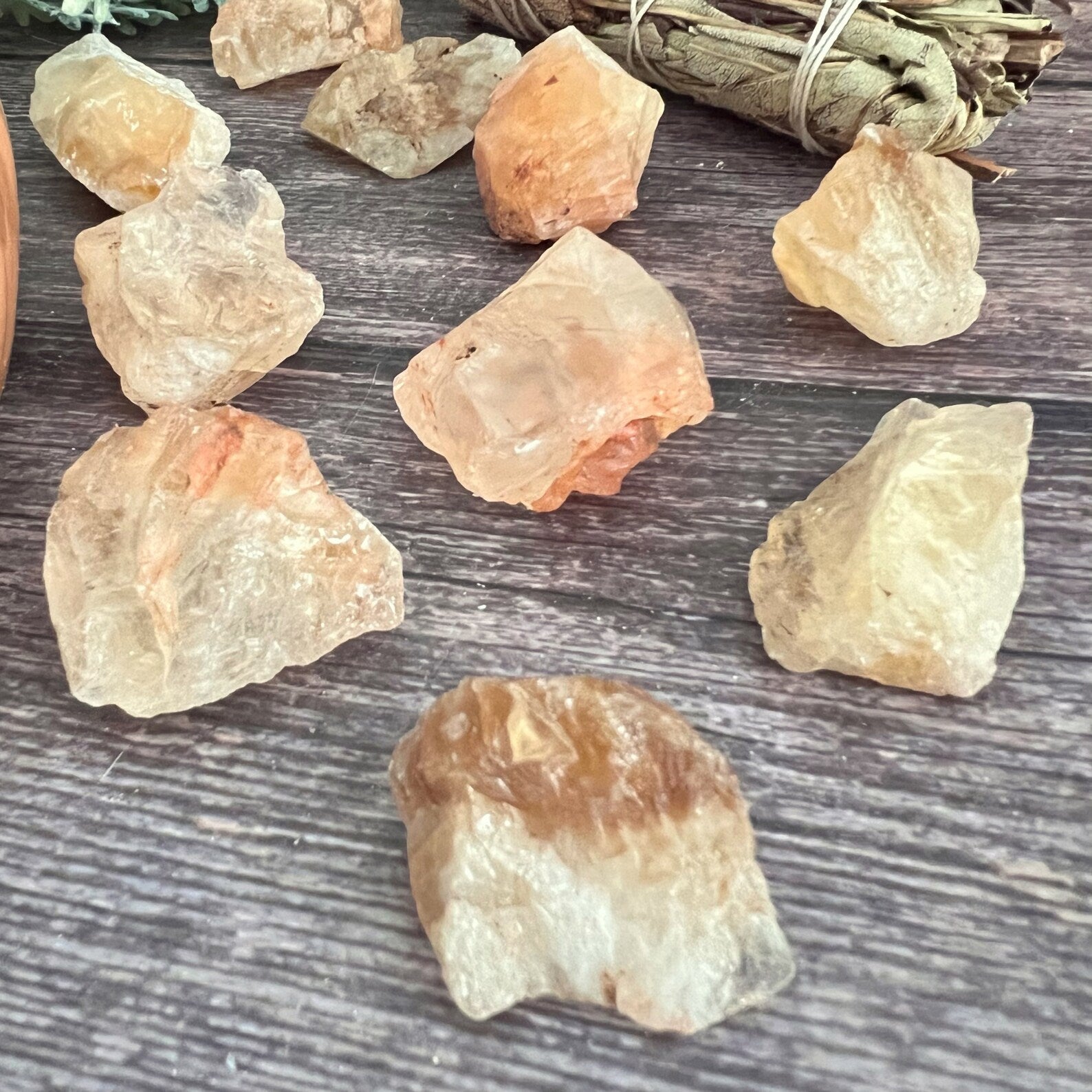 You will receive 1 Rough Citrine stone intuitively chosen. Select from 1"-1.25" piece, 2-3" chunk, or you can select from a 4-ounce bag (containing an assortment of .5-2" pieces)