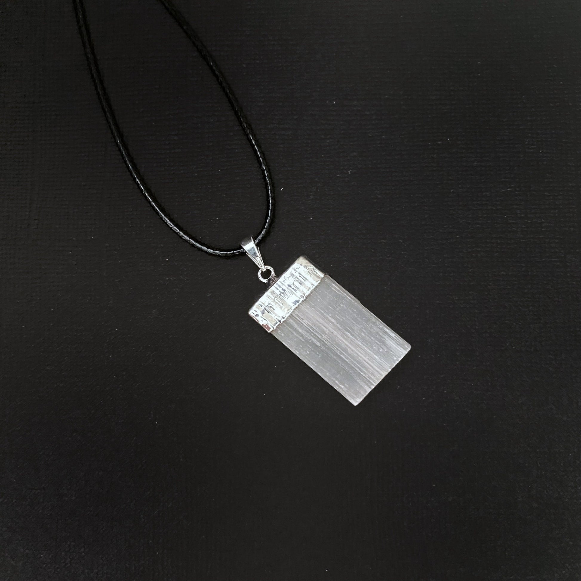 Selenite is renowned for its ethereal and purifying properties, and this raw pendant allows you to carry its serene energy with you wherever you go. Its simplicity and organic charm make it a versatile addition to your jewelry collection. Whether you choose to wear it alone on your preferred necklace or opt for our included plain black cotton waxed cord, which measures 16 inches, you'll find this pendant to be a graceful expression of your connection to the natural world and your spiritual journey.