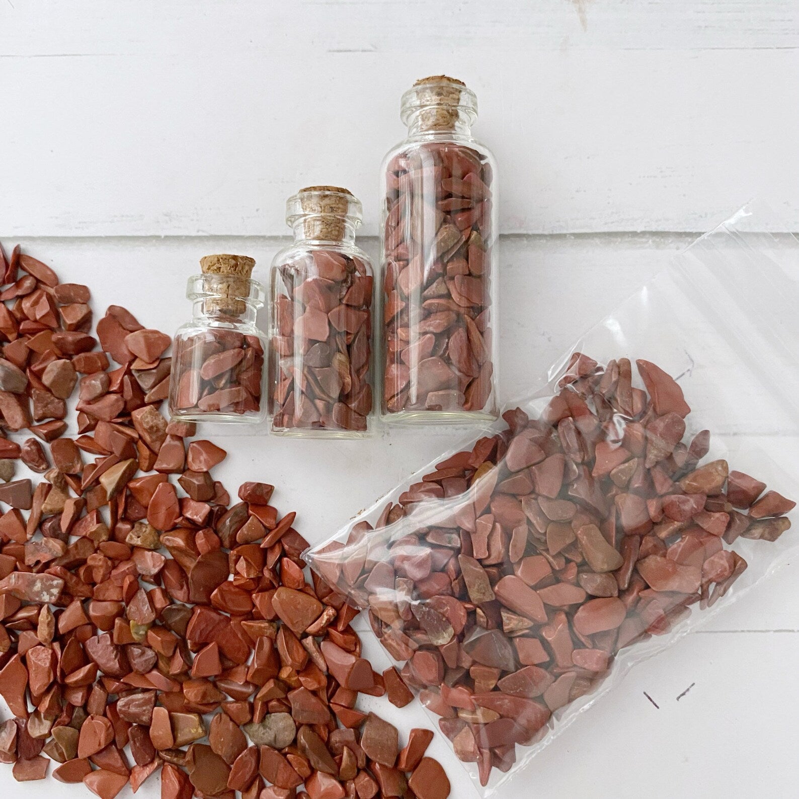 ed Jasper Crystal Chips are tumbled and polished tiny stones. These mini stones are perfect for various creative and mystical endeavors. Whether you're into candle making, adding to your roller ball oils, crafting, or creating resin jewelry, these chips add a touch of natural energy to your projects. They're also ideal for spell jars, mojo bags, witch balls, orgone devices, and as sacred additions to your altar jars.