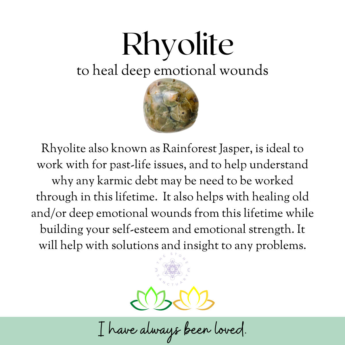 Rhyolite is thought to help people deal with past-life issues, by helping one to see the relationship between karma and what is happening now, making these issues much easier to accept and work through. Rhyolite will assist one in laying down burdens which no longer act to serve in one’s life. Using Rhyolite may help with healing old and deep emotional wounds in this lifetime as well.