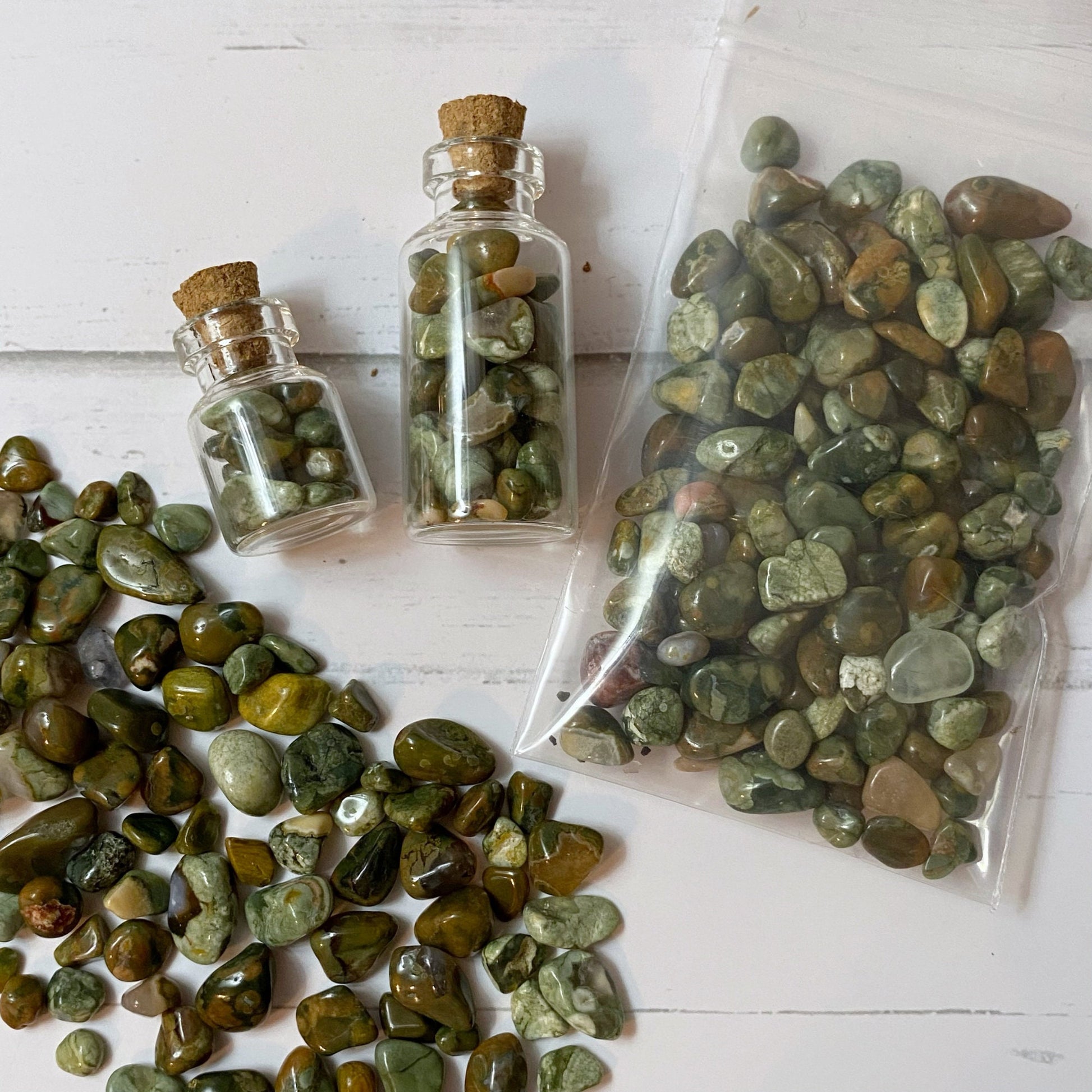Rainforest Jasper (also known as Rhyolite) Crystal Chips are tumbled and polished tiny stones. These mini stones are perfect for various creative and mystical endeavors. Whether you're into candle making, adding to your roller ball oils, crafting, or creating resin jewelry, these chips add a touch of natural energy to your projects. They're also ideal for spell jars, mojo bags, witch balls, orgone devices, and as sacred additions to your altar jars.