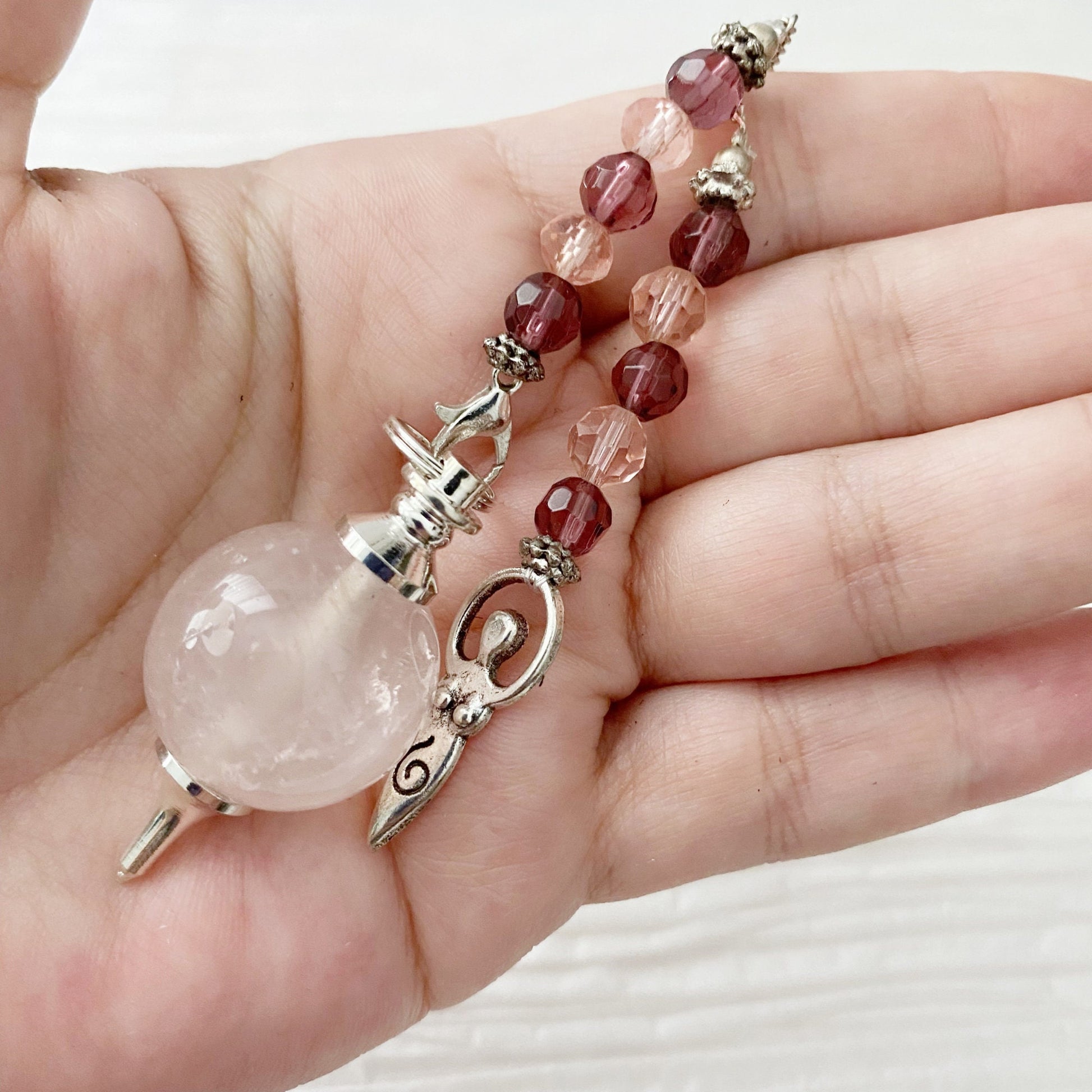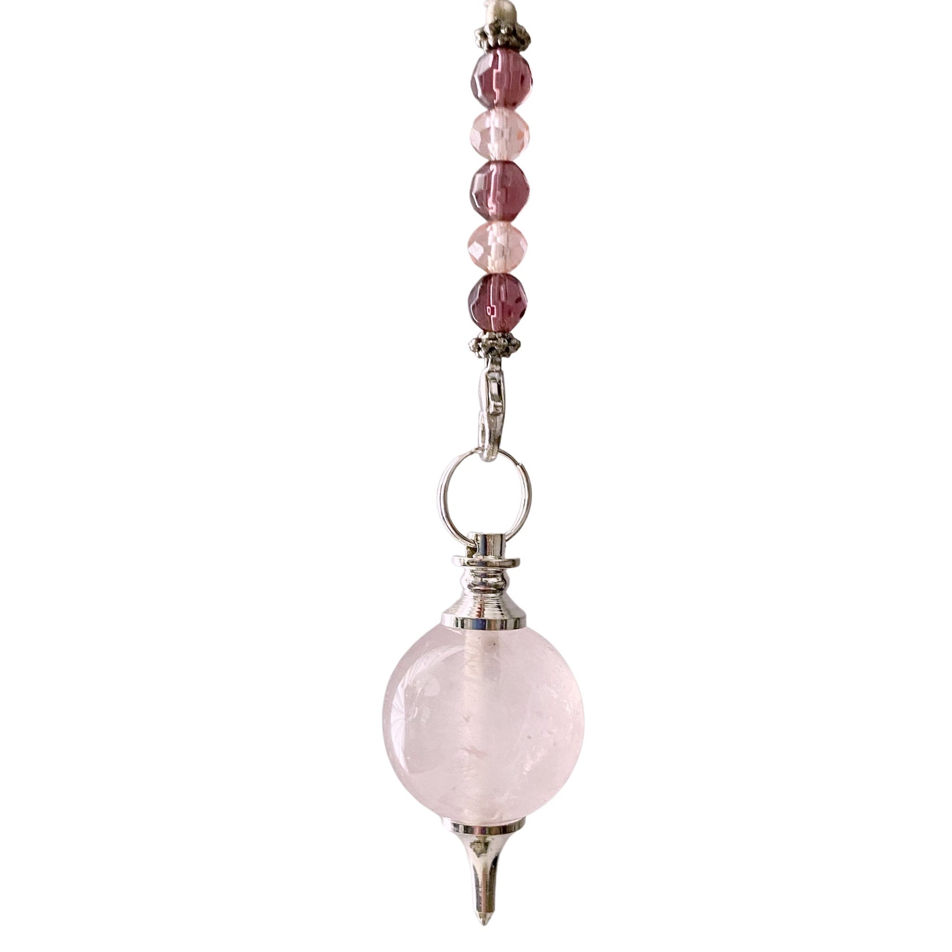 You will receive One (1) Rose Quartz Crystal Ball Pendulum with silver chain and goddess charm. This beautiful ball pendulum is made from rose quartz. The attached chain beadwork made with pink and purple beads and a goddess charm at the end to ensure slip free handling.
