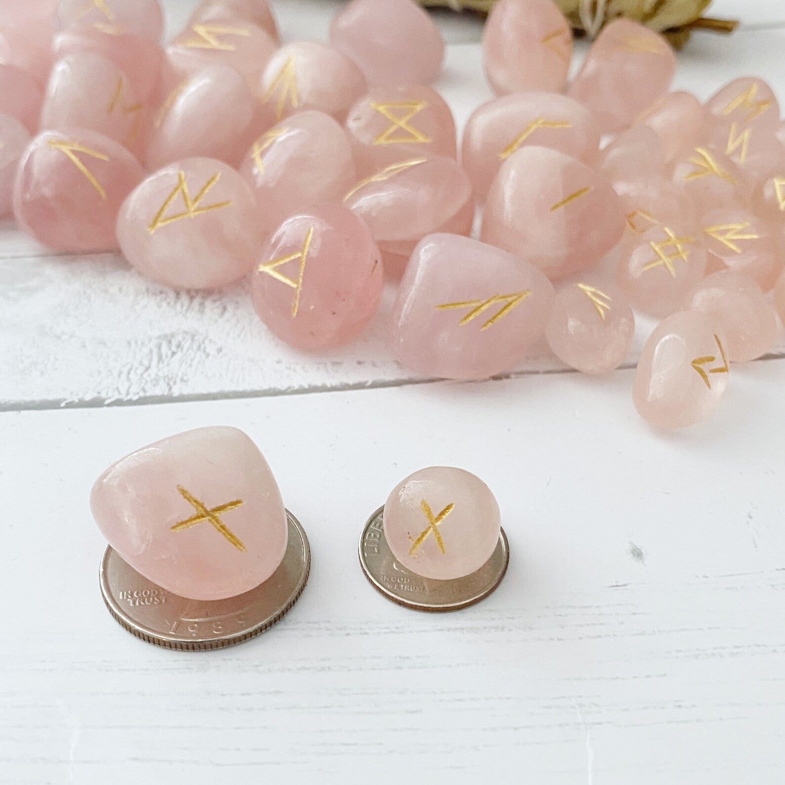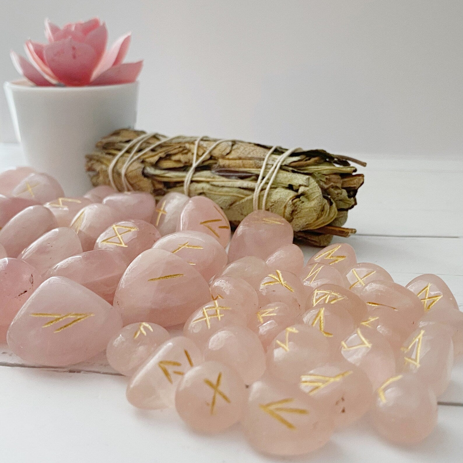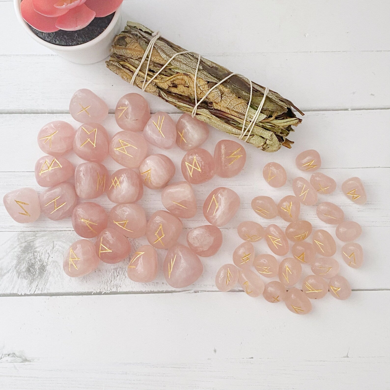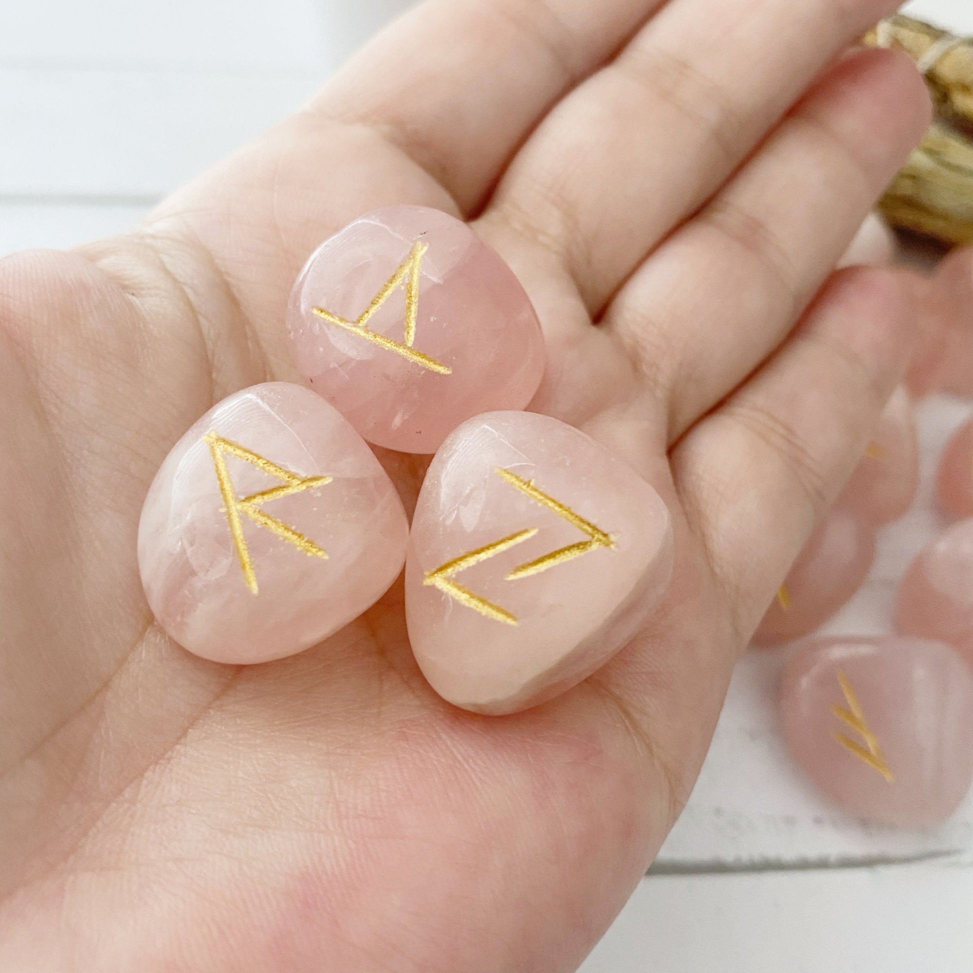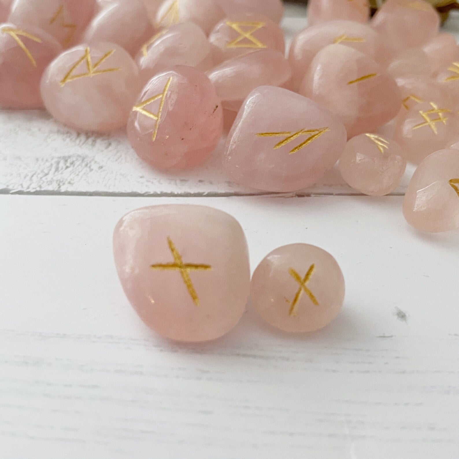 Unlock the ancient wisdom of the Elder Futhark with our Handcarved Genuine Rose Quartz Crystal Rune Stones, thoughtfully etched and adorned with gold paint. This set includes 25 meticulously crafted runes, each possessing the natural beauty of tumbled and polished Rose Quartz.